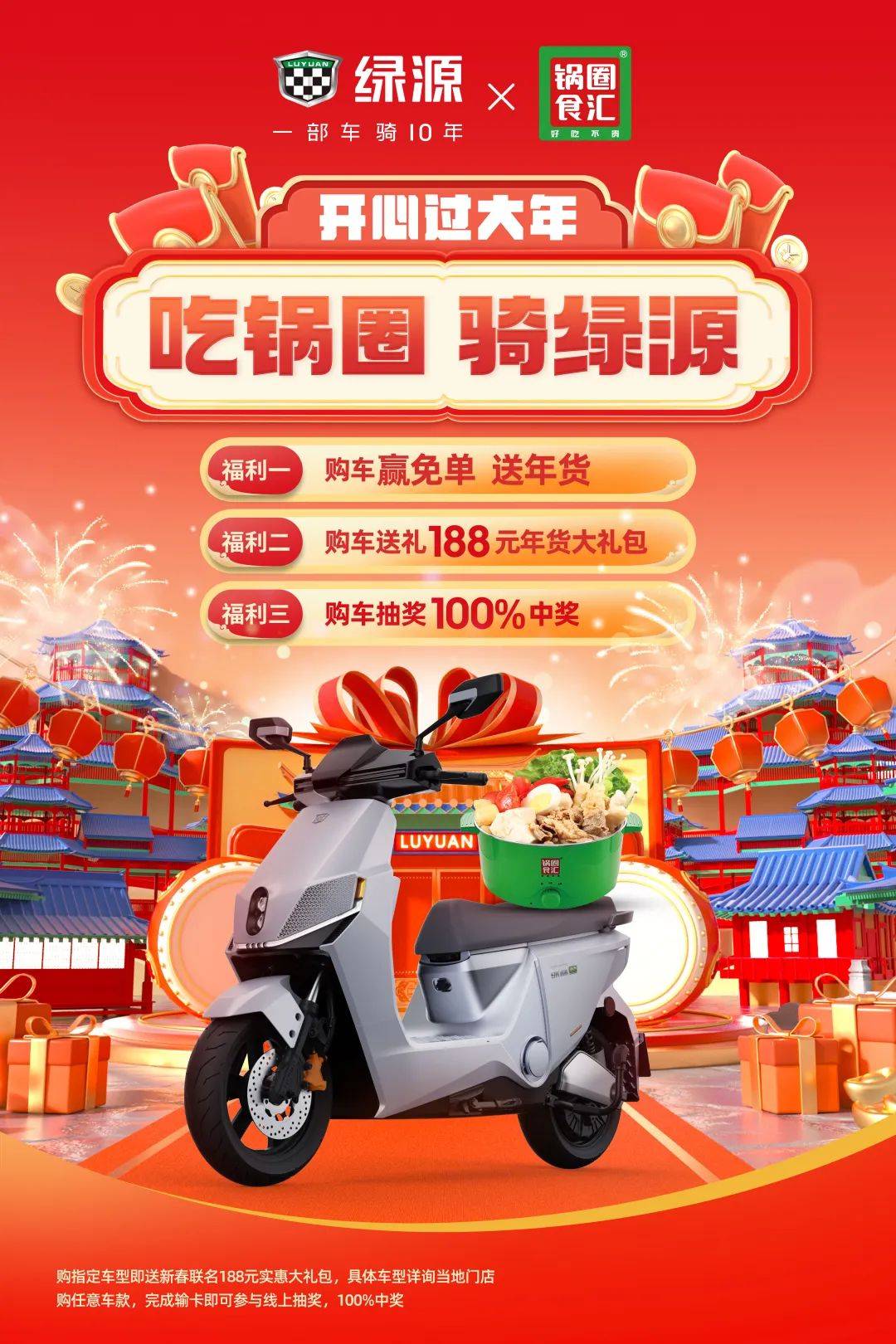 在春節(jié)臨近之際,綠源攜手鍋圈強(qiáng)強(qiáng)聯(lián)手,在全國(guó)終端市場(chǎng)火爆開(kāi)啟“吃鍋圈、騎綠源,開(kāi)心過(guò)大年”大型主題活動(dòng)!突破性的創(chuàng)新?tīng)I(yíng)銷、高質(zhì)量的跨界聯(lián)動(dòng),將春節(jié)最離不開(kāi)的“食”與“行”緊握于手。綠源這波春節(jié)獻(xiàn)禮,可謂創(chuàng)意滿滿、誠(chéng)意十足!