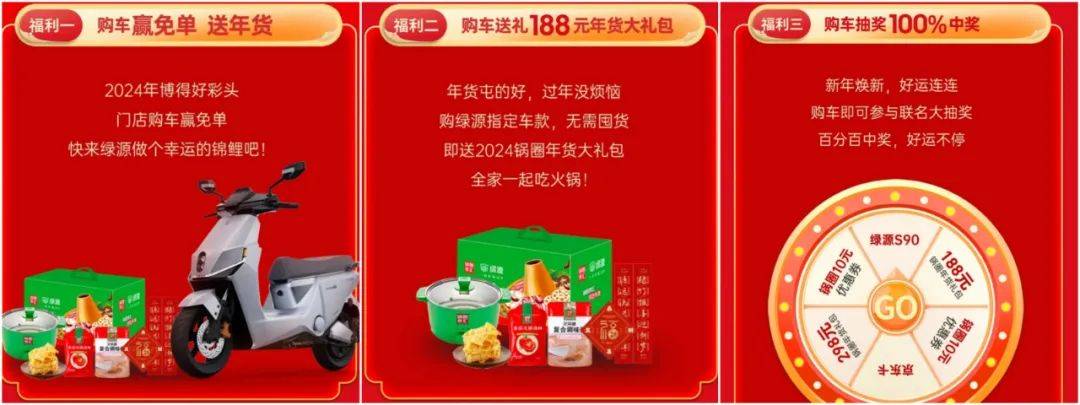 1月20日,“吃鍋圈、騎綠源,開(kāi)心過(guò)大年”大型主題活動(dòng)全國(guó)開(kāi)啟!活動(dòng)期間,只要用戶在各地的綠源專賣店購(gòu)買電動(dòng)車,除了享受春節(jié)期間綠源給出的鉅惠購(gòu)車價(jià)格外,還能獲得綠源贈(zèng)送的188元年貨大禮包,并參與春節(jié)抽獎(jiǎng)活動(dòng)!不僅有機(jī)會(huì)贏得超級(jí)免單大獎(jiǎng),更有旗艦爆款S90、京東購(gòu)物卡、最高298元鍋圈年貨禮包等一系列驚喜獎(jiǎng)品,中獎(jiǎng)率高達(dá)100%!