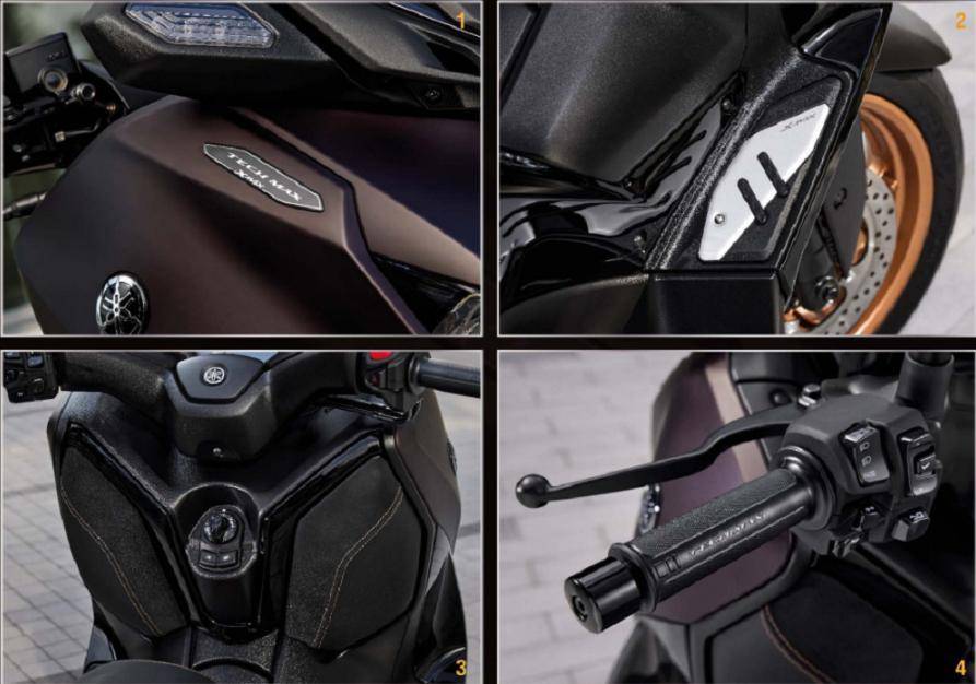 在大的外觀方面沒有做太多調(diào)整,但是為了與標(biāo)準(zhǔn)版XMAX拉開區(qū)別,Xmax 300 Tech Max在一些細(xì)節(jié)處做了文章,例如帶有“Tech Max”標(biāo)識的車把、鋁制踏板,車頭專屬銘牌、金色縫線的坐墊等等,以此體現(xiàn)該版本的特殊性。儀表配置則是4.2寸TFT液晶儀表,支持手機(jī)互聯(lián)及導(dǎo)航功能。