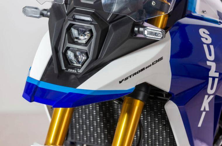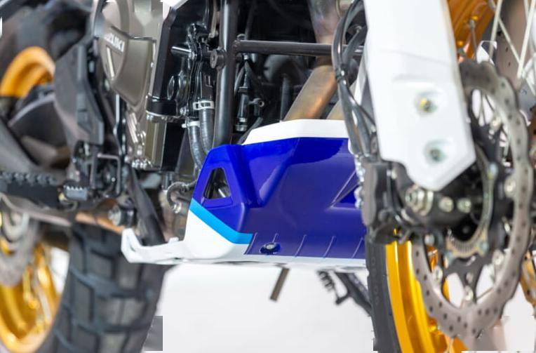 V- Strom 800DE Djebel擁有清新的藍(lán)白配色,油箱側(cè)面貼有"SUZUKI"Logo,前叉部分和輻條輪轂延續(xù)金色的元素,提供了強(qiáng)反差的視覺(jué)效果。車身上只采用了少部分藍(lán)色線條來(lái)點(diǎn)綴,就連底部的發(fā)動(dòng)機(jī)護(hù)板都做了主題色烤漆。