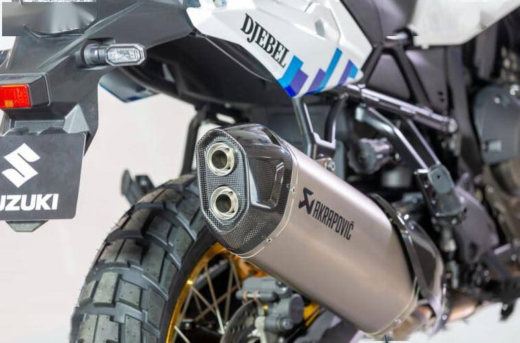 車尾側(cè)面的“DJEBEL”既是致敬這一突尼斯最高的山峰和阿特拉斯山脈,同時(shí)也是紀(jì)念鈴木當(dāng)年在巴黎達(dá)喀爾拉力賽上的表現(xiàn)。鈴木還為該版本換裝了Dunlop Trailmax Raid輪胎,更適合越野路面使用。在排氣系統(tǒng)上也升級(jí)了天蝎的雙出排氣,減重的同時(shí)也能夠帶來(lái)性能的提升。