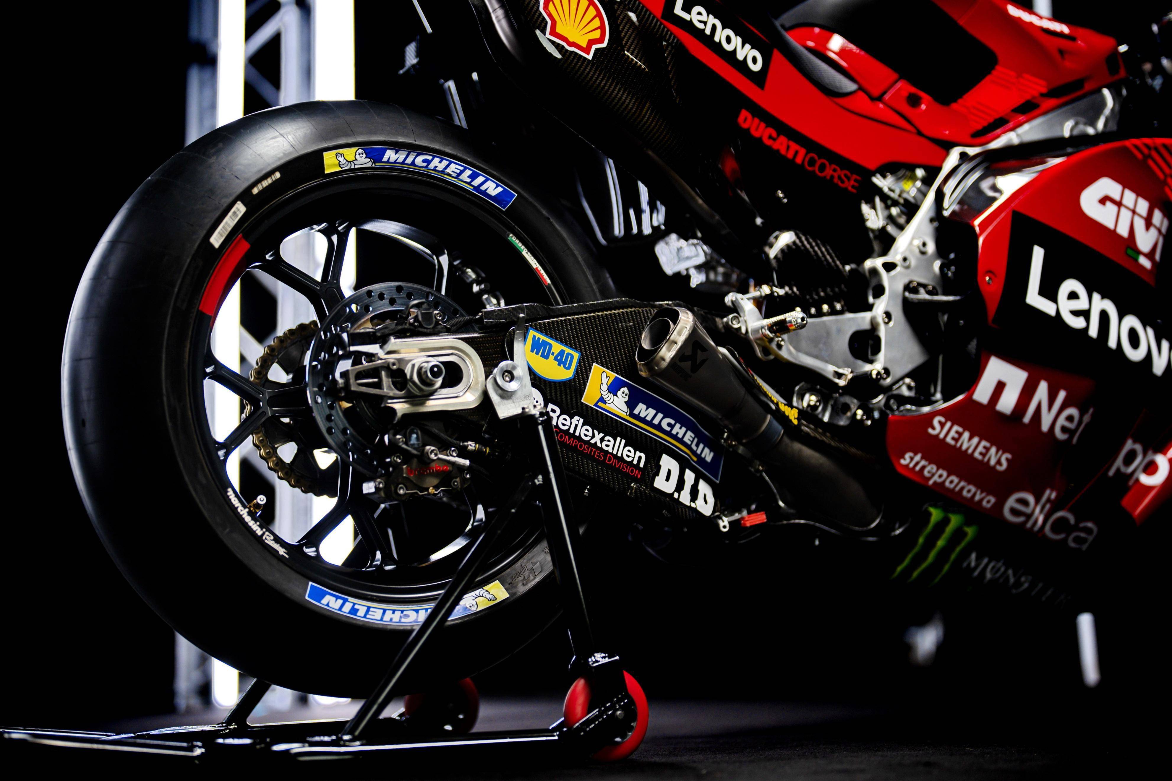 參考官方發(fā)布的信息,2024 規(guī)格的杜卡迪工廠賽車 Desmosedici GP24 搭載一副水冷四沖程 V 型 90 度四氣缸、DOHC 每氣缸四氣閥的發(fā)動機,無縫變速齒輪箱,排氣量 1000 cc,最大動力輸出超過 250 匹,Ohlins 奧林斯的前后懸掛系統(tǒng),Marchesini 的鎂合金前后輪框等。