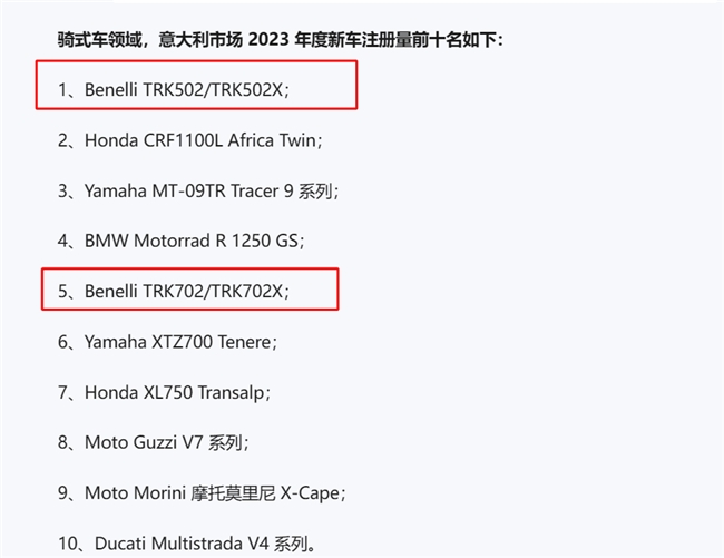 近日,意大利摩托銷量數(shù)據(jù)出爐,2023年銷量為340.072輛(+15.9%),創(chuàng)下2007年以來(lái)的最好成績(jī)!尤其是其中500CC-750CC(+32.6%)表現(xiàn)更為強(qiáng)勁。不過(guò),令很多人沒(méi)想到的是,在眾星云集的機(jī)車圣地,最受歡迎的居然是來(lái)自中國(guó)錢江摩托旗下的貝納利TRK502和TRK702。