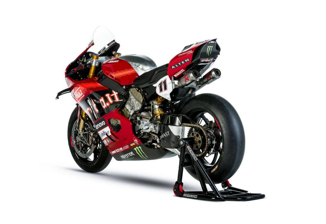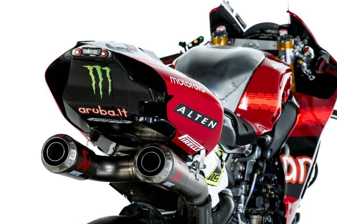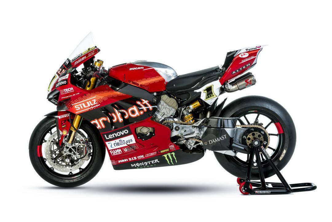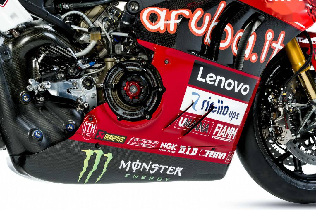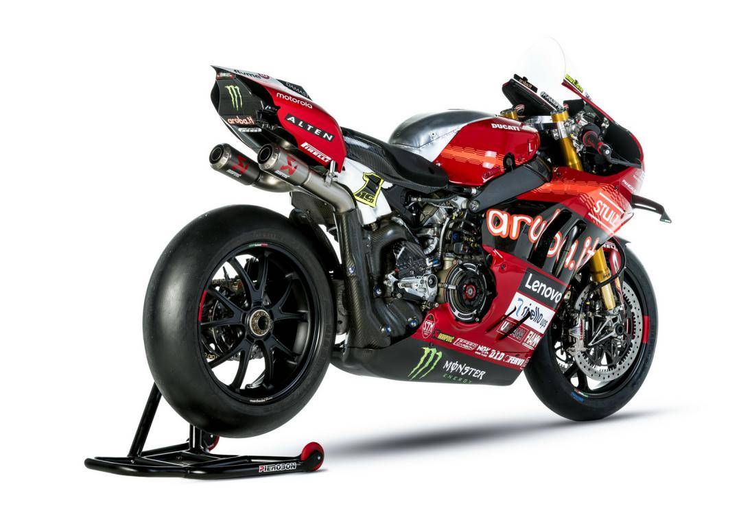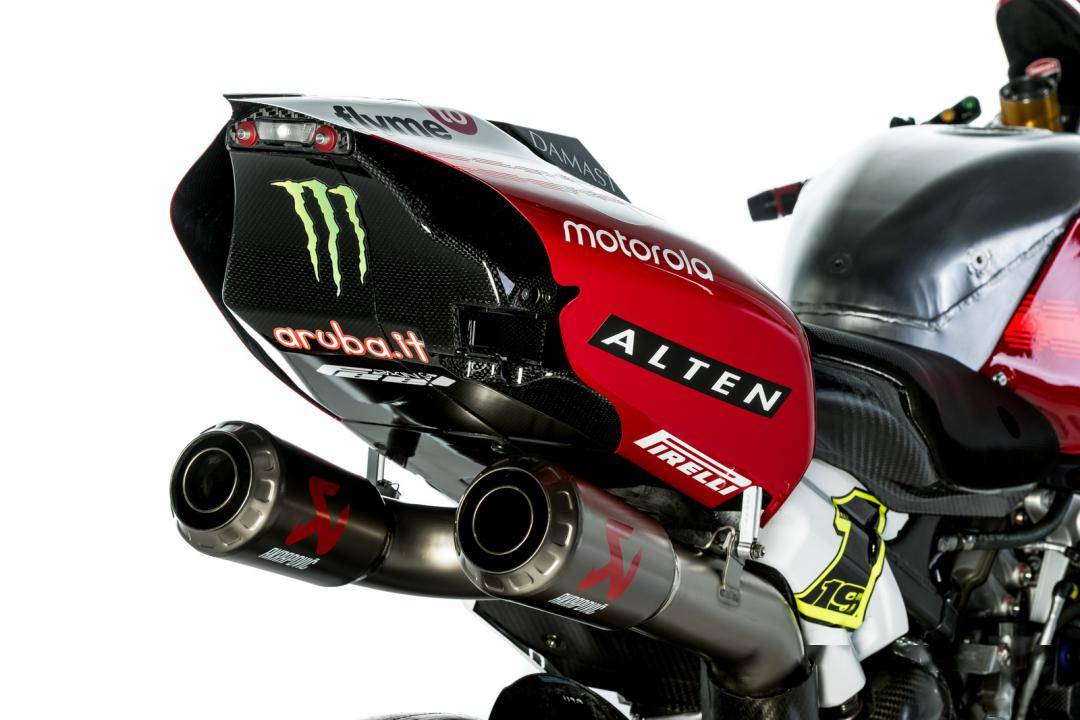 杜卡迪的 WorldSBK 工廠賽車是 Panigale V4 R,官方公布的資料,該車搭載一副水冷四沖程 V 型 90 度四氣缸、Desmosedici DOHC 每氣缸四氣閥的發(fā)動機,缸徑、行程為 81 mm x 48.4 mm,排氣量 998 cc,最大動力輸出 235 匹以下(曲軸輸出的測試方式。市售標(biāo)準(zhǔn)狀態(tài)下的 Panigale V4 R 最大馬力輸出為 218 匹)。車體采用一副鋁制車架、后單搖臂,Ohlins 奧林斯配套的前后懸掛系統(tǒng),全車重量(包括油和水)為 168 公斤。