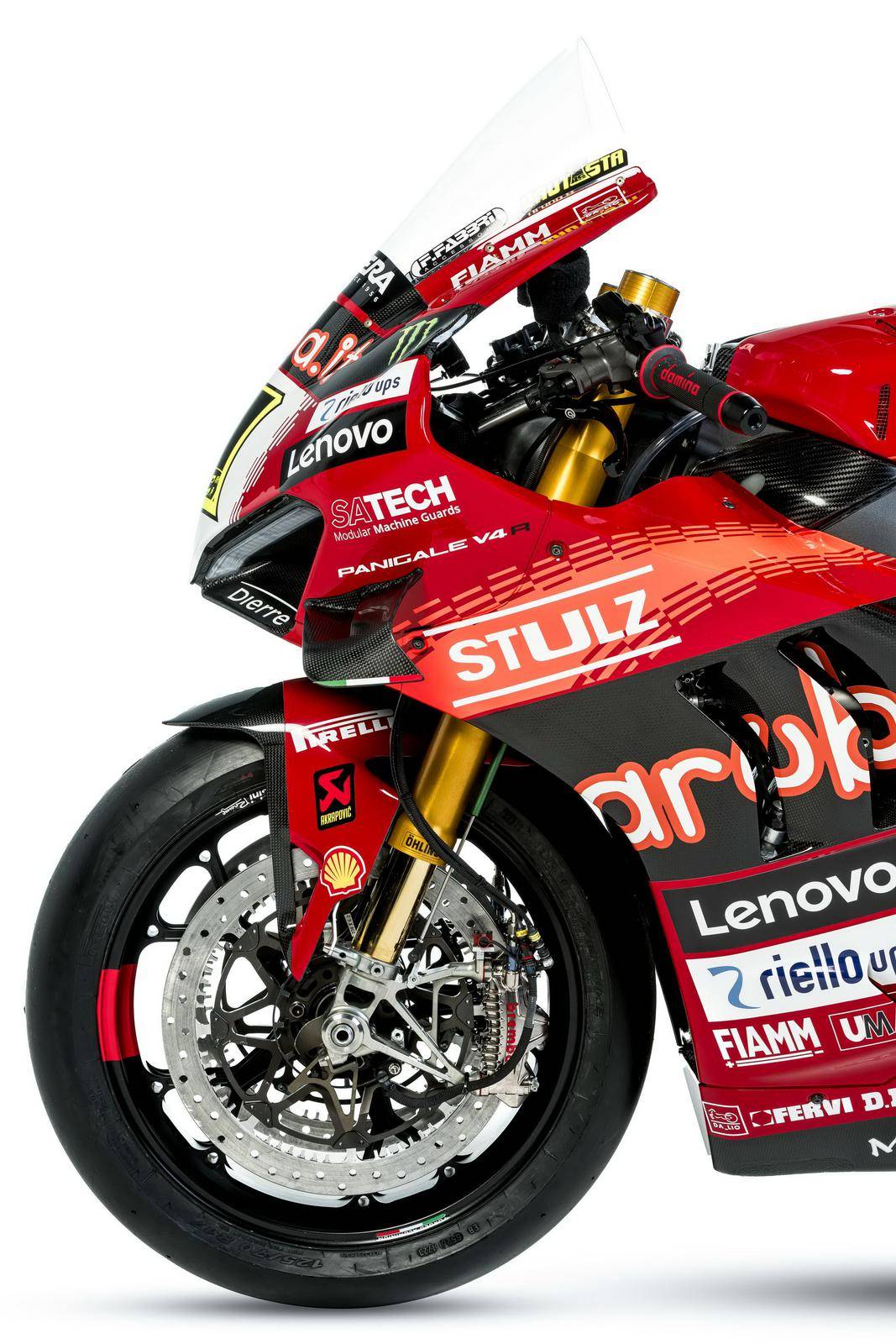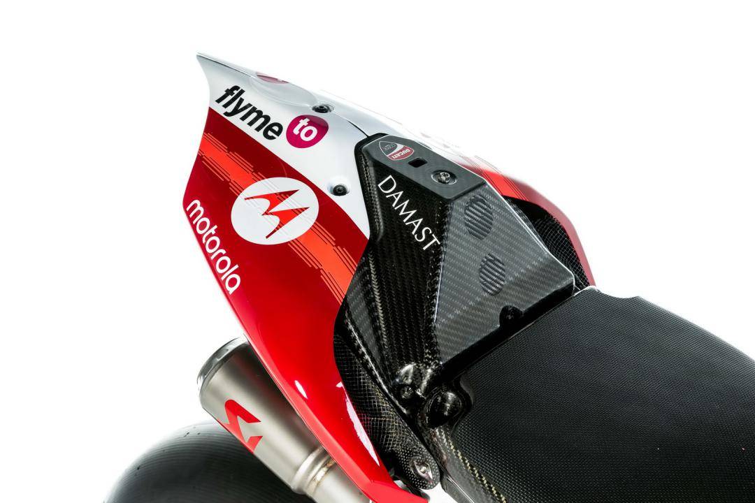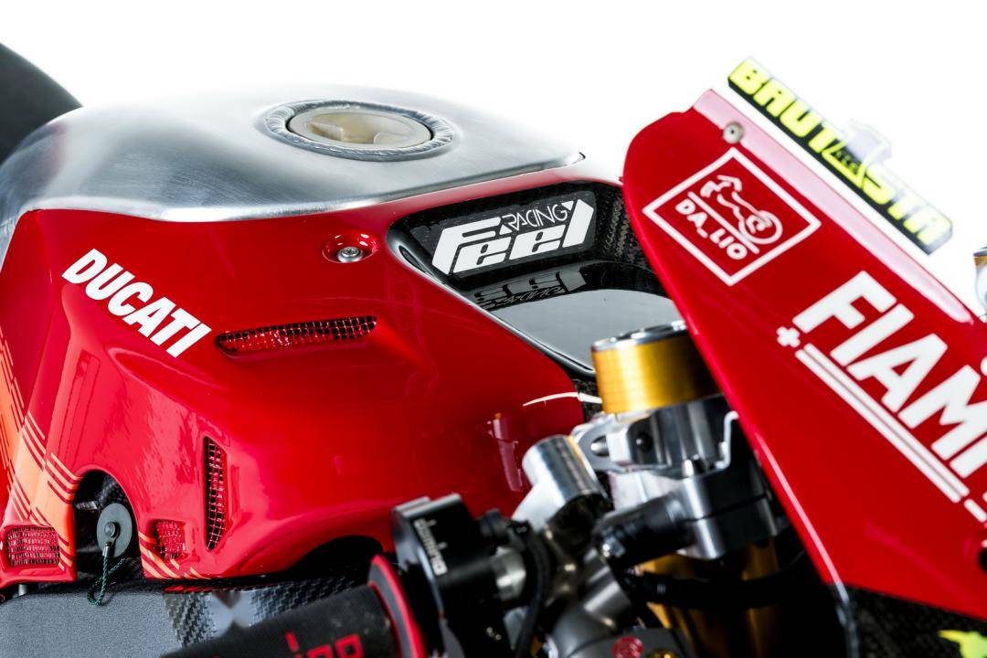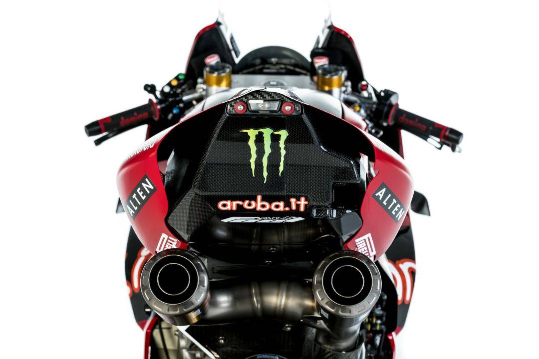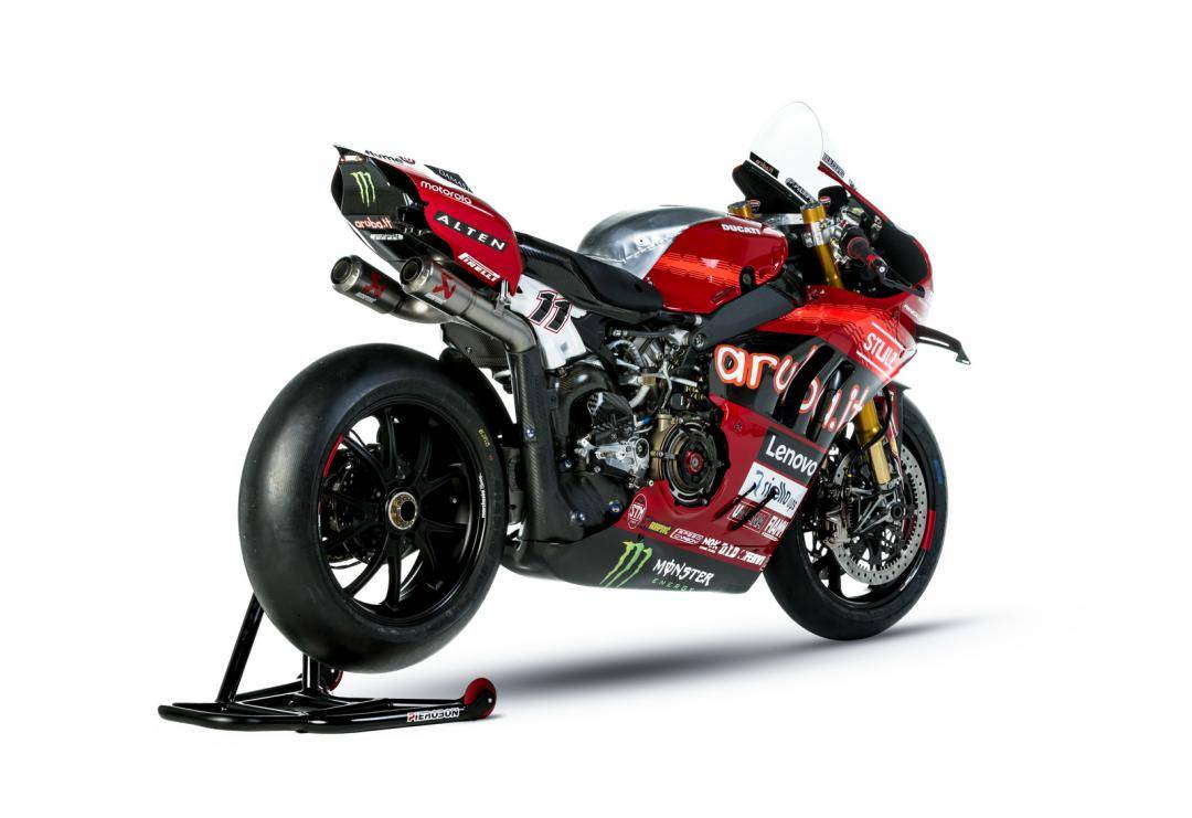 杜卡迪的 WorldSBK 工廠賽車是 Panigale V4 R,官方公布的資料,該車搭載一副水冷四沖程 V 型 90 度四氣缸、Desmosedici DOHC 每氣缸四氣閥的發(fā)動機,缸徑、行程為 81 mm x 48.4 mm,排氣量 998 cc,最大動力輸出 235 匹以下(曲軸輸出的測試方式。市售標(biāo)準(zhǔn)狀態(tài)下的 Panigale V4 R 最大馬力輸出為 218 匹)。車體采用一副鋁制車架、后單搖臂,Ohlins 奧林斯配套的前后懸掛系統(tǒng),全車重量(包括油和水)為 168 公斤。