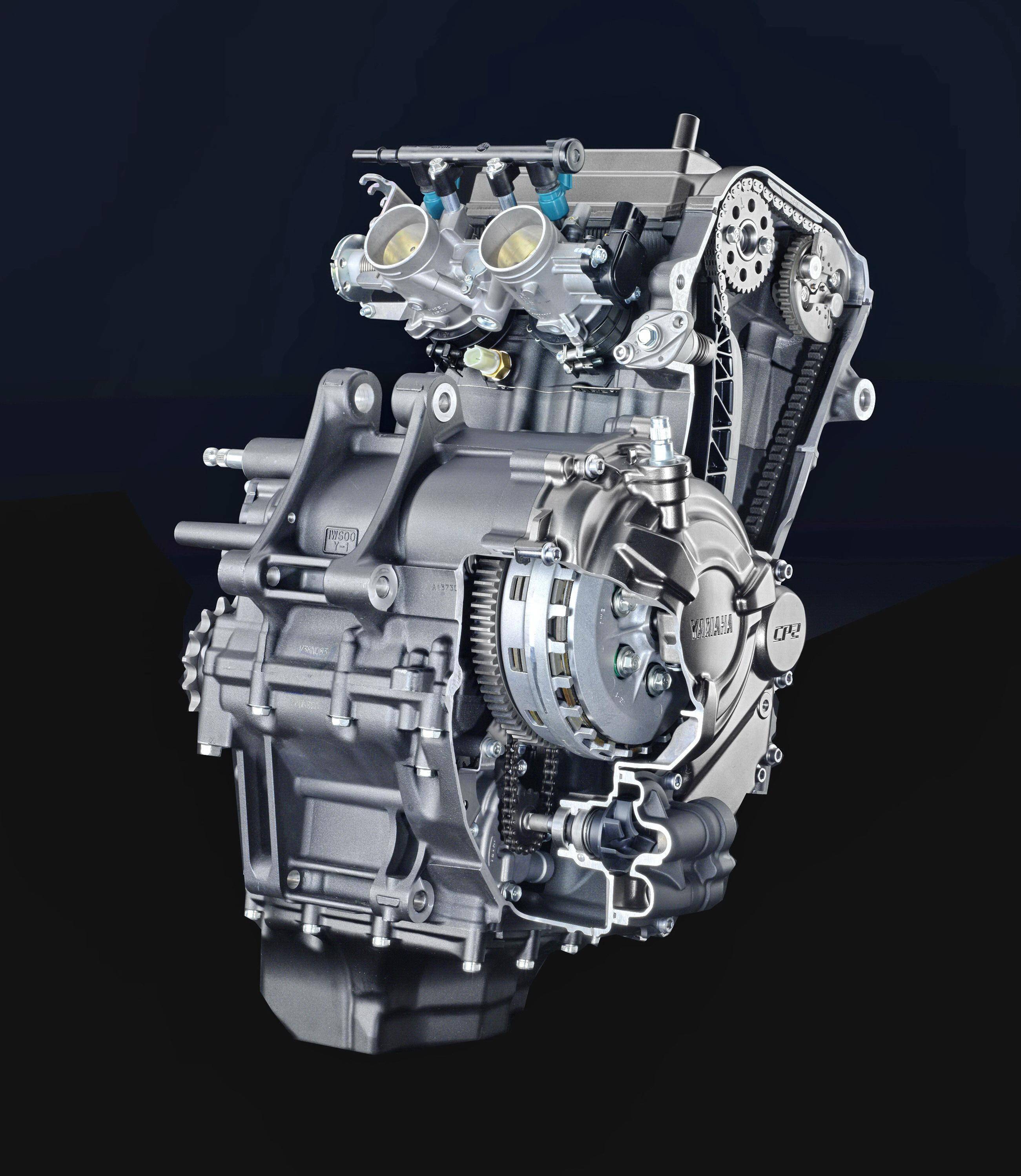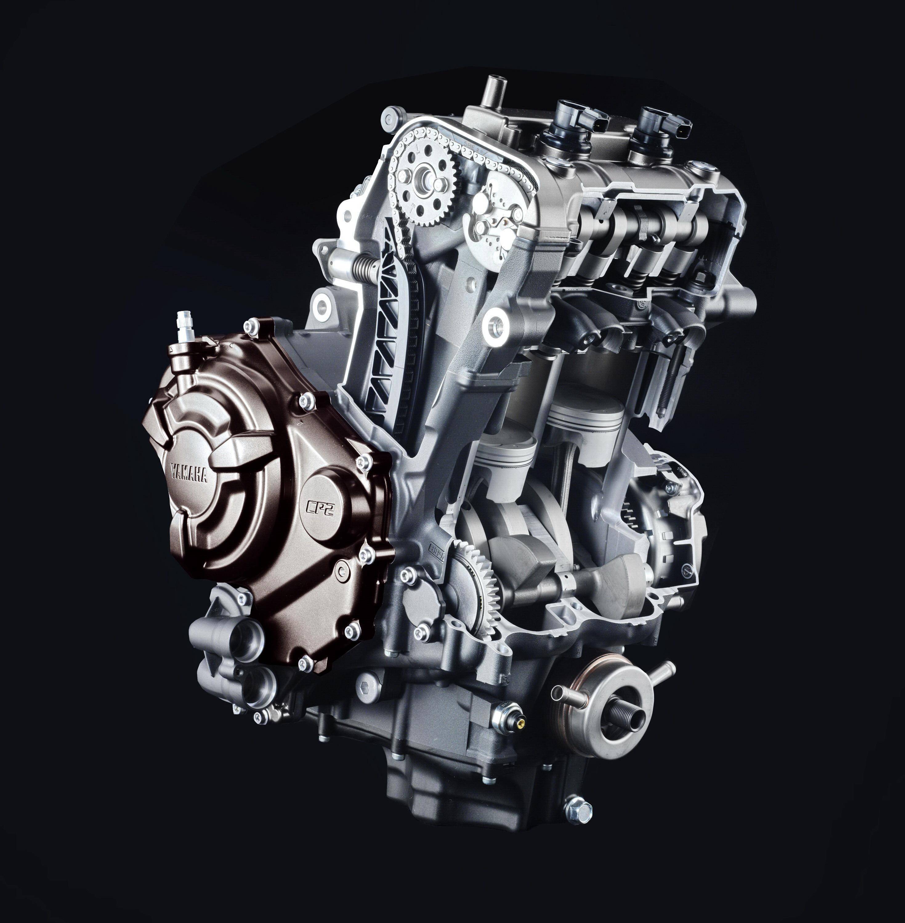 YZF-R7 搭載一副來(lái)自 MT-07 運(yùn)動(dòng)街車(chē)同平臺(tái)的水冷四沖程直列兩氣缸、DOHC 每氣缸四氣閥的 CP2 發(fā)動(dòng)機(jī),270 度曲軸點(diǎn)火相位,排氣量 689 cc,最大動(dòng)力輸出 54 kw(約 73.4 匹)。