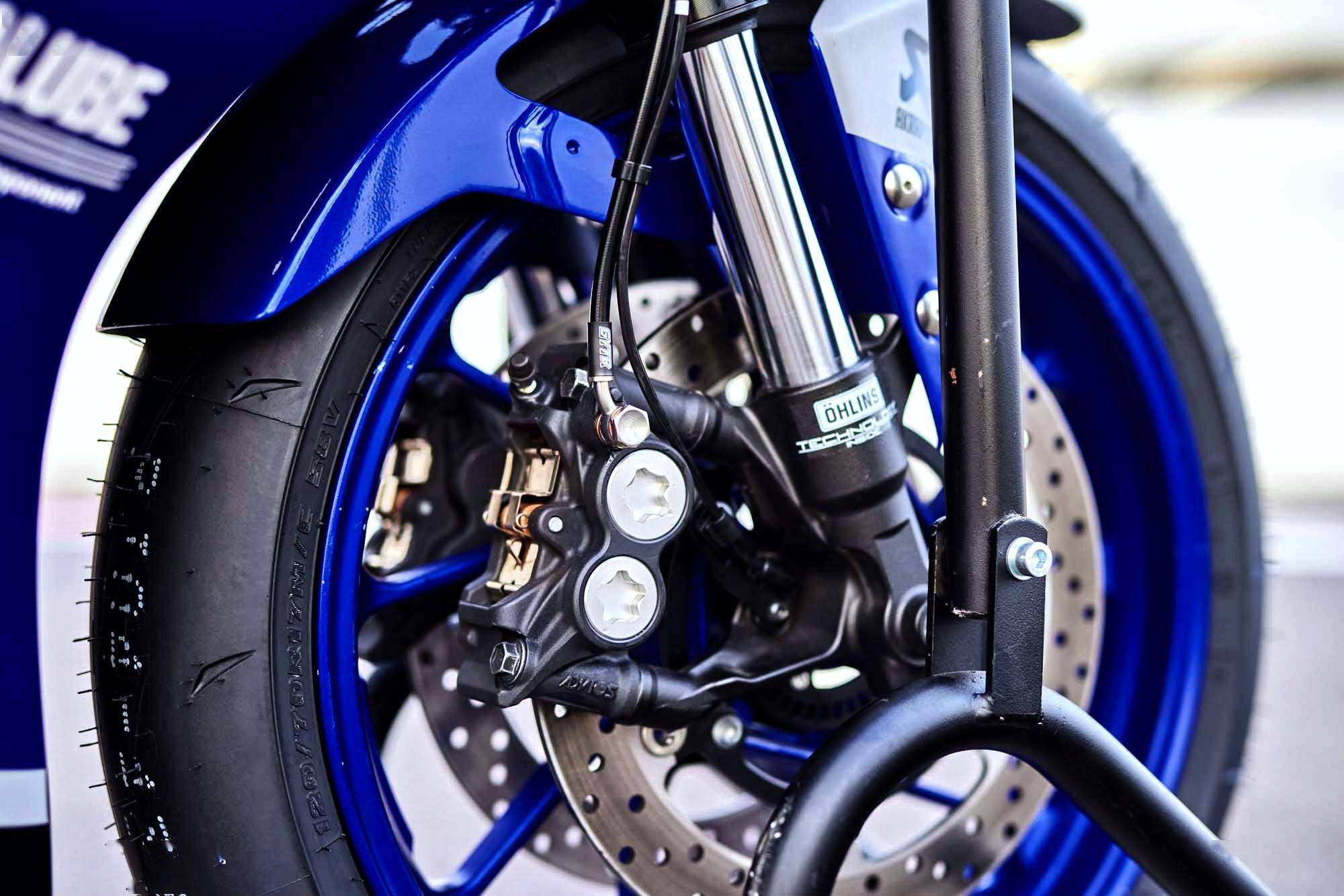 車(chē)體方面,采用一副鉆石型的管狀車(chē)架、左右不對(duì)稱(chēng)式設(shè)計(jì)的后搖臂;外觀造型上,該車(chē)的車(chē)頭中部、大燈的兩側(cè),采用了一個(gè) M 字型進(jìn)風(fēng)口的設(shè)計(jì),這一設(shè)計(jì)有著 MotoGP 工廠賽車(chē) YZR-M1 的影子。懸掛系統(tǒng)方面,前面的是 KYB 配套的、叉芯口徑為 41 mm 的倒立式前叉,預(yù)載、壓縮和回彈可調(diào);后面是連桿式聯(lián)接、近乎水平面安裝的單筒式后減震;其他方面,包括了 LED 的大燈、數(shù)字式的儀表板、Brembo 布博的前剎車(chē)上泵等。