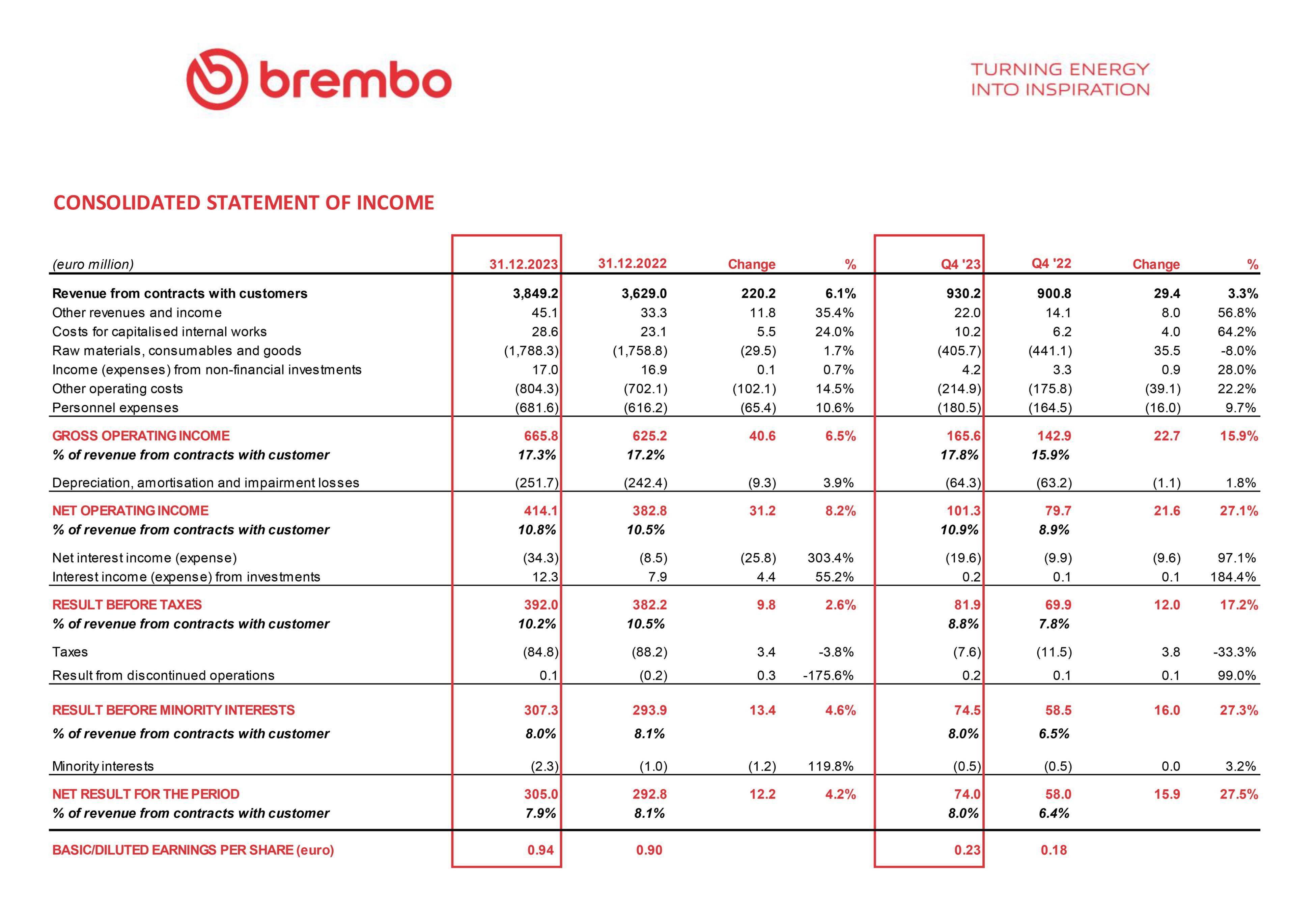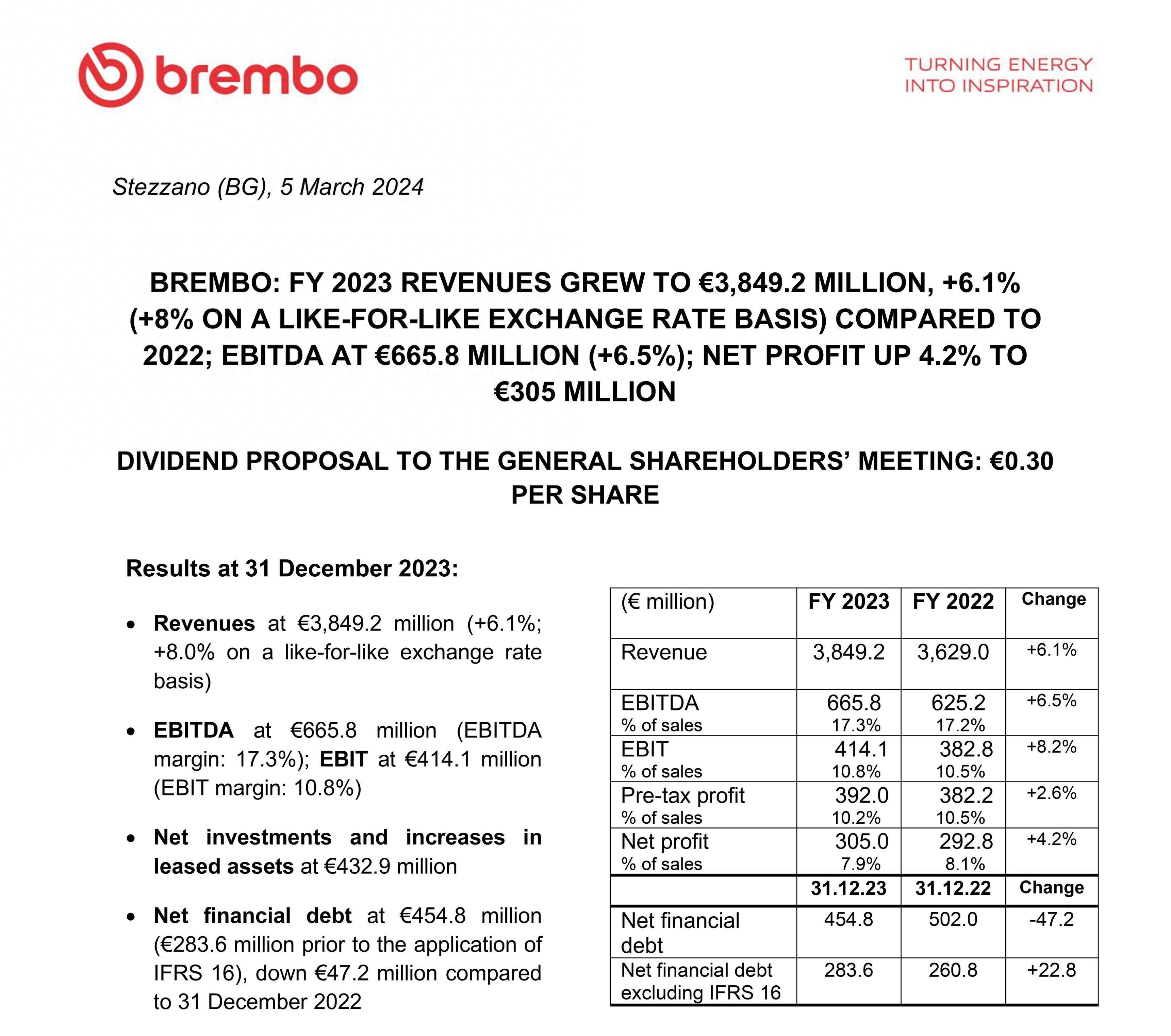 Brembo 布雷博 2023 業(yè)績(jī)、營(yíng)收比 2022 增長(zhǎng)約 6.1%