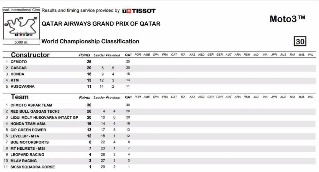 得益于Esteban的積分入賬,此役過后,目前Moto3的制造商積分榜、車手積分榜、車隊(duì)積分榜,CFMOTO均位居榜首!