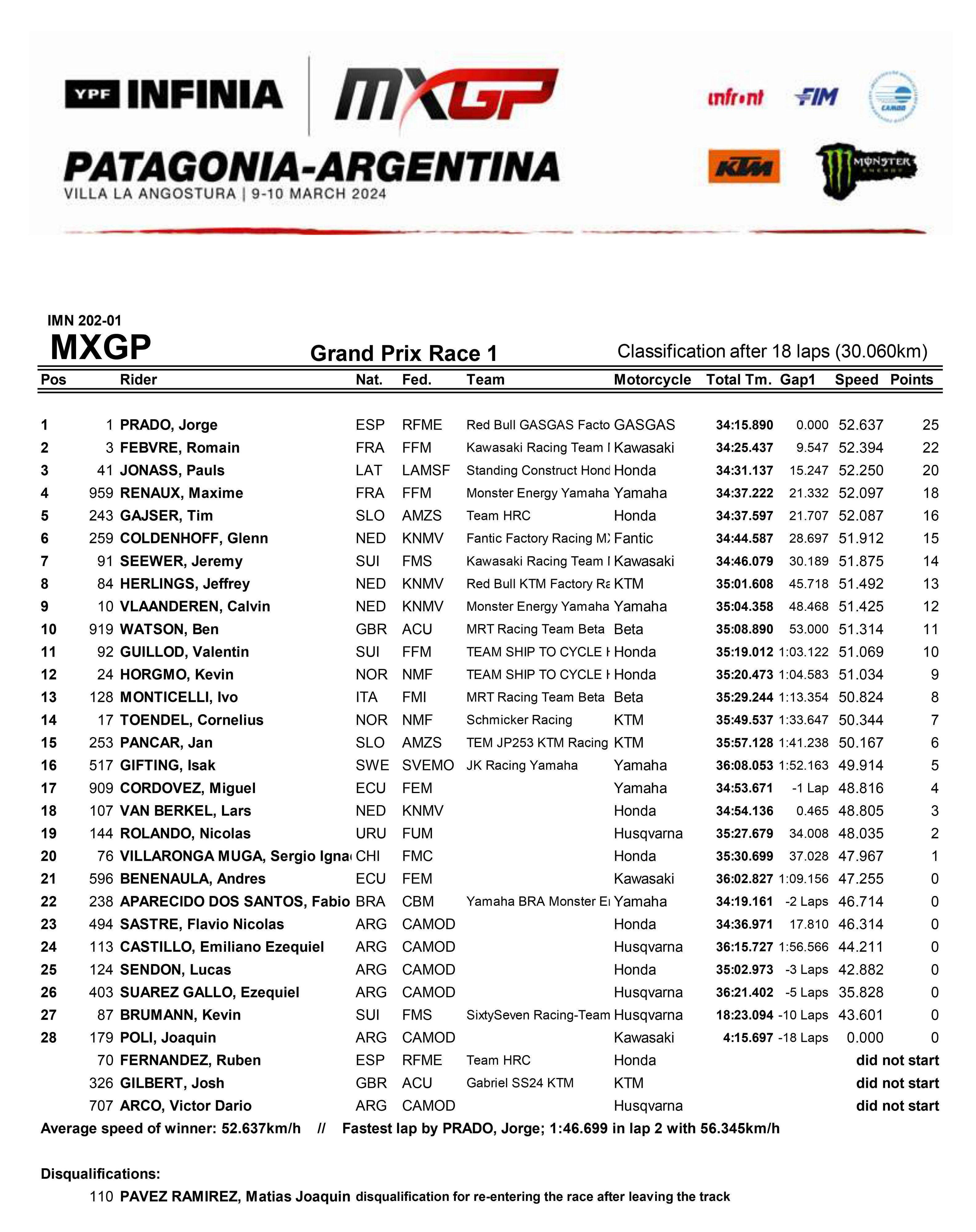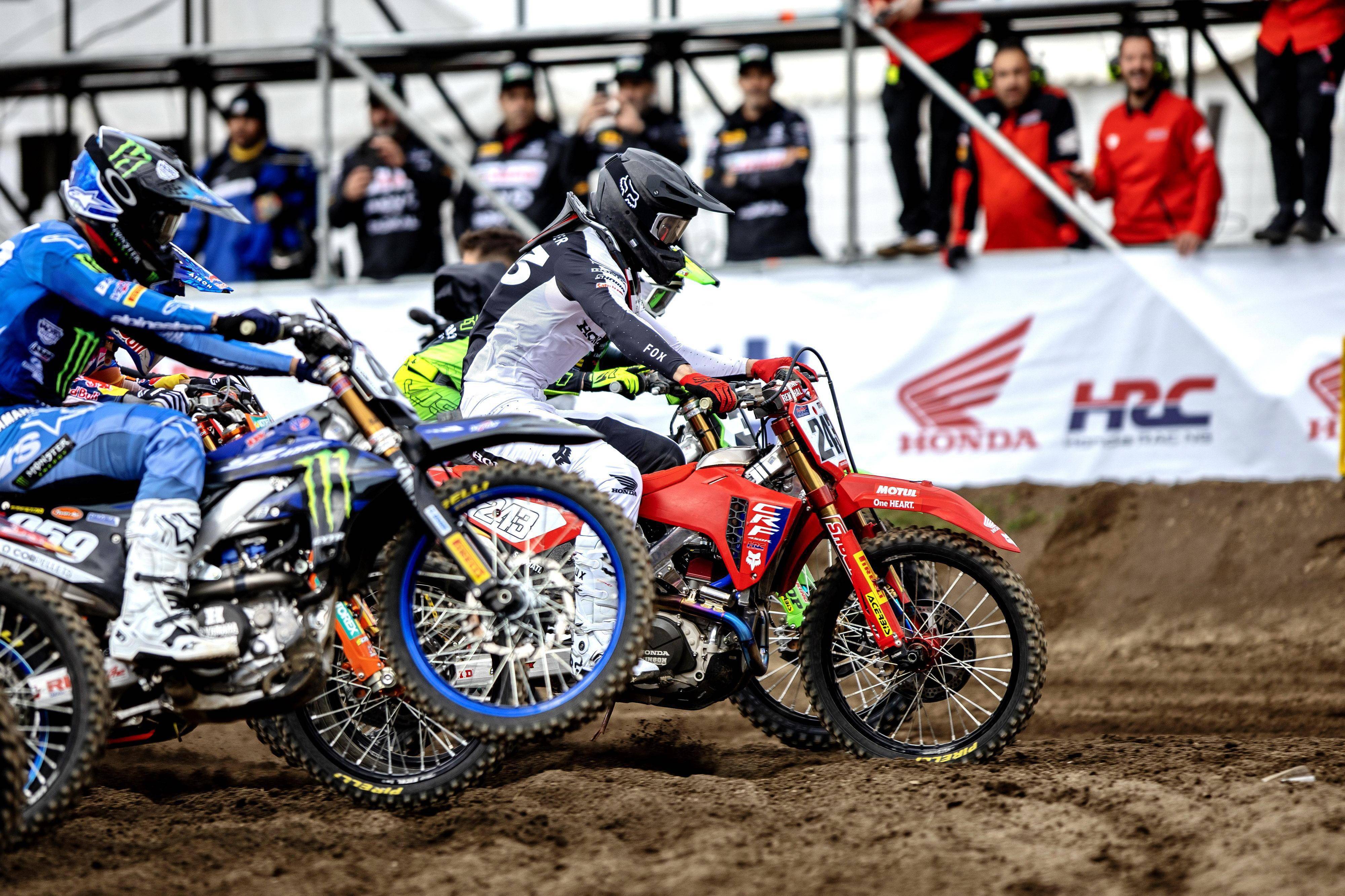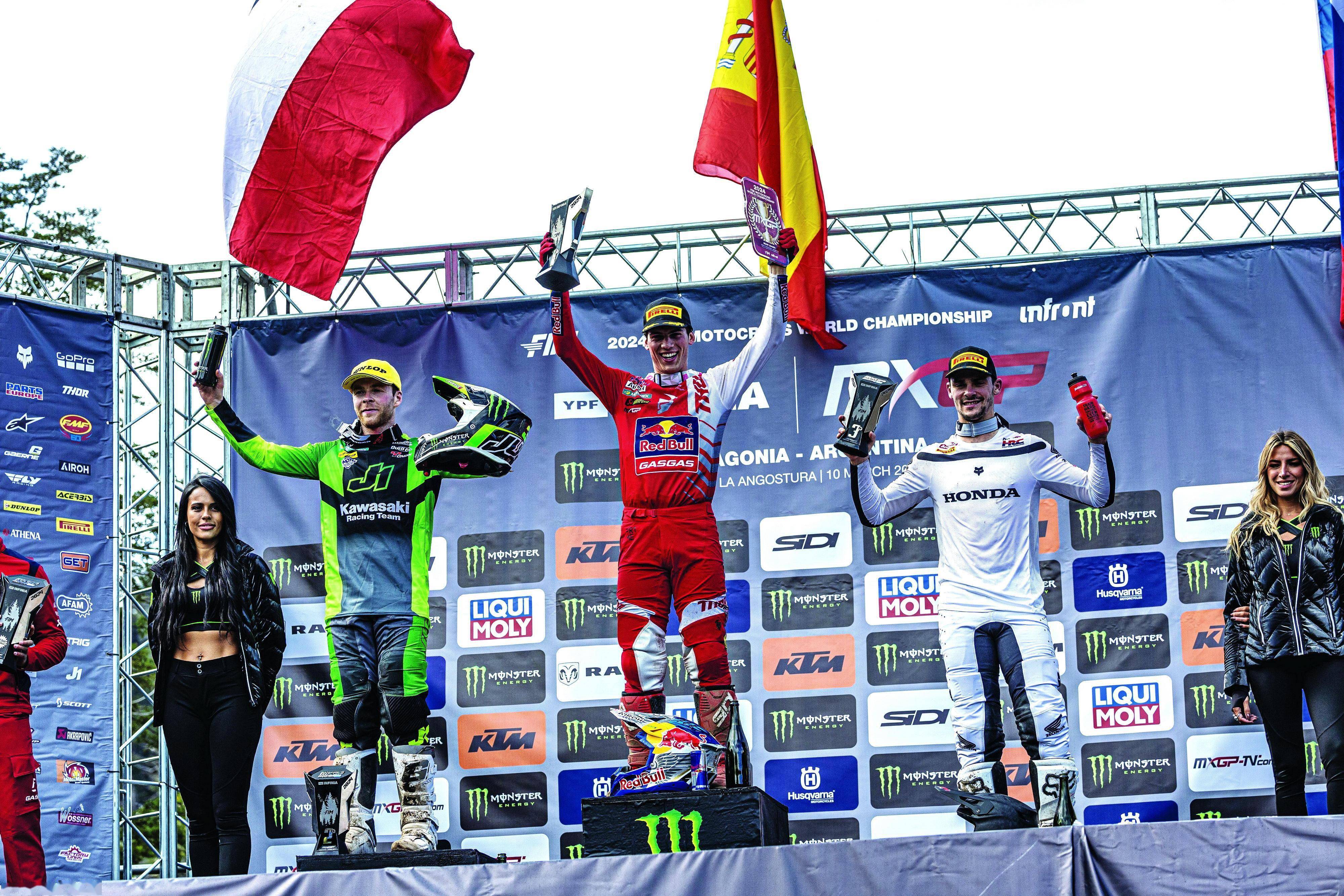 MXGP 級別,阿根廷舉行的這場揭幕戰(zhàn)是激烈的大混戰(zhàn),三家制造商 Gasgas、Honda、Kawasaki 成為了兩節(jié)比賽里、頒獎臺的贏家,第一節(jié)比賽,應(yīng)屆世界冠軍、1 號車普拉多(Jorge Prado)奪得了第一,3 號車費(fèi)布爾(Romain Febvre)、41 號車的喬納斯(Paul Jonass)分別獲得了第二、第三。
