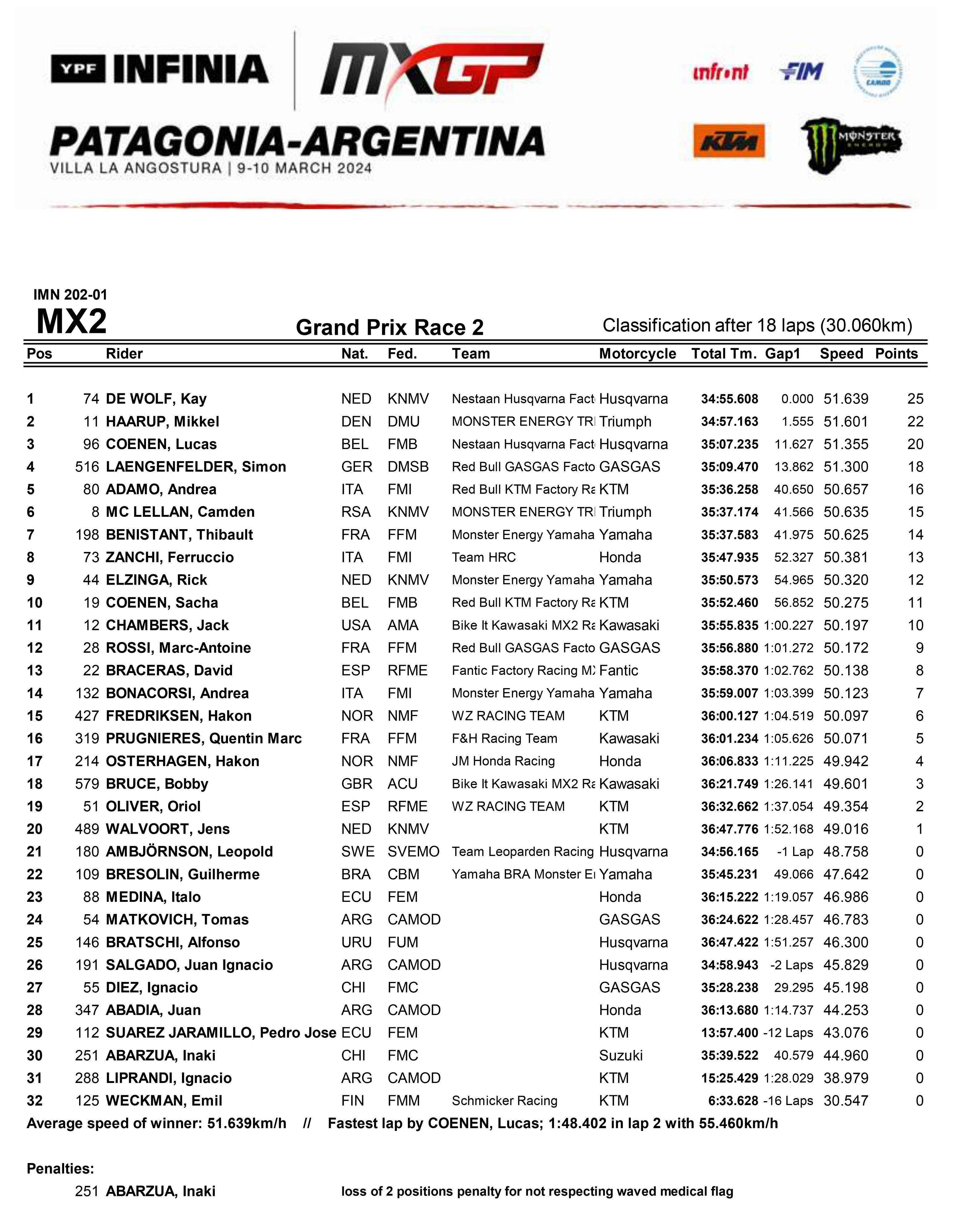 第二節(jié)的比賽,迪沃夫以微弱的優(yōu)勢奪得了冠軍;駕駛著首次在世界錦標(biāo)賽登場的凱旋賽車、11 號車哈魯普(Mikkel Haarup)落后前車大約 1.5 秒獲得亞軍,為 TF-250X 的首次出場拿下了歷史性的首個頒獎臺戰(zhàn)績;96 號車的科寧(Lucas Coenen)拿到了季軍。