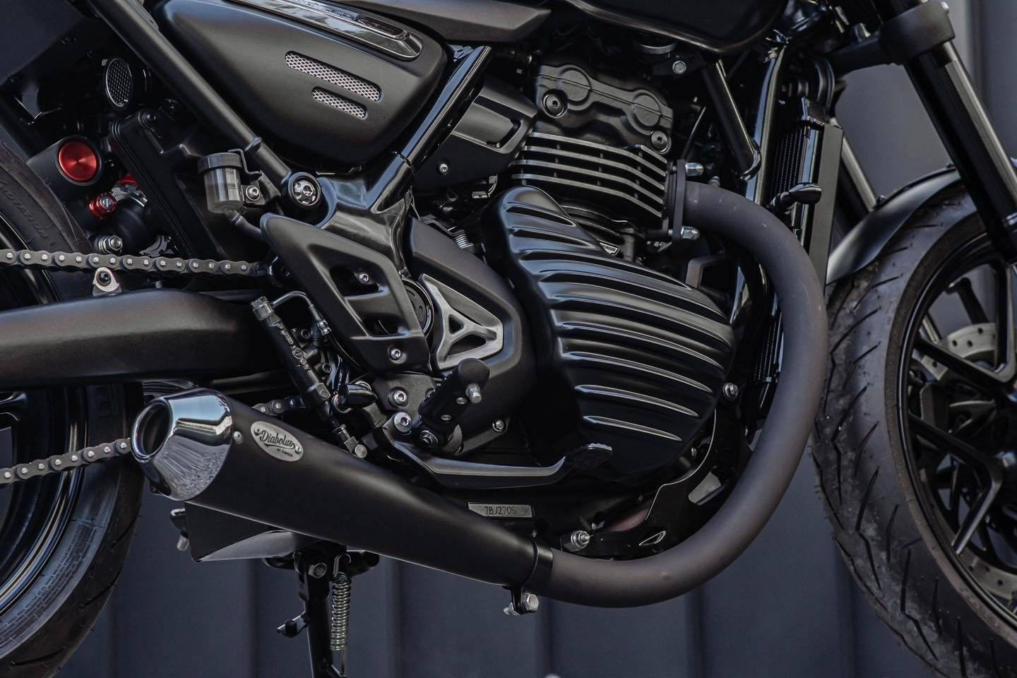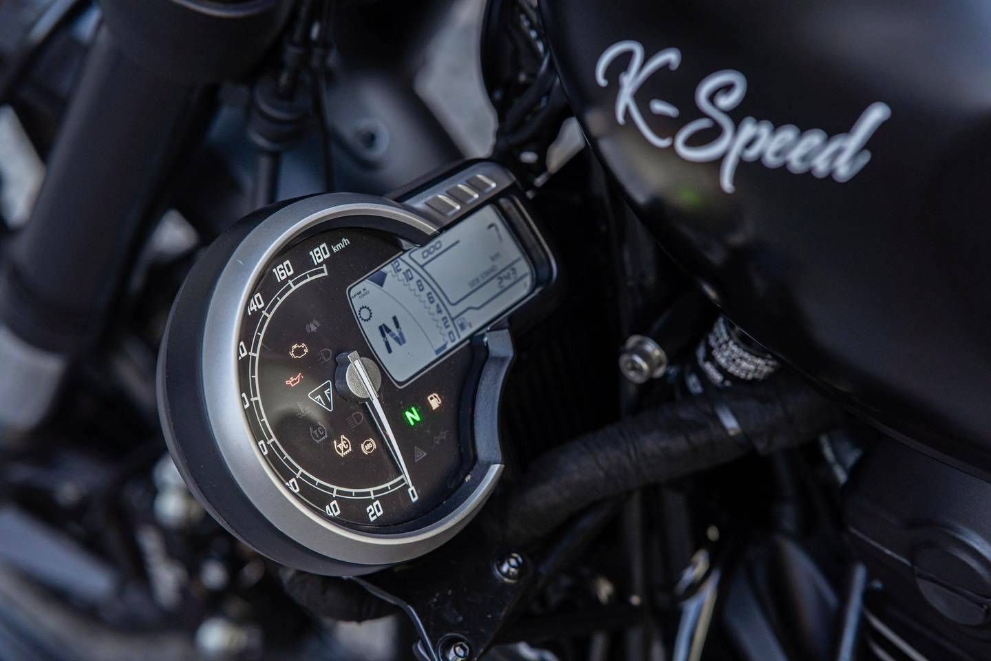 車頭正面,K-Speed替Diabolus Cafe Racer換上一組量體比原廠稍大一些的LED圓燈,并將握把改為更戰(zhàn)斗的分離式斜把,同時(shí)與先前Scrambler 400 X的改裝作品一樣,將原廠的儀表從握把上移除,改到車身左側(cè)、引擎旁邊的位置。