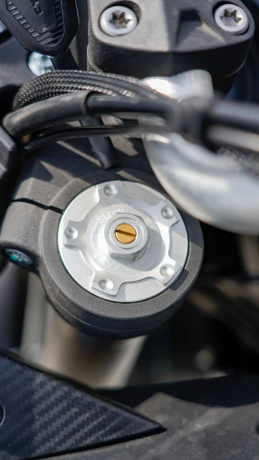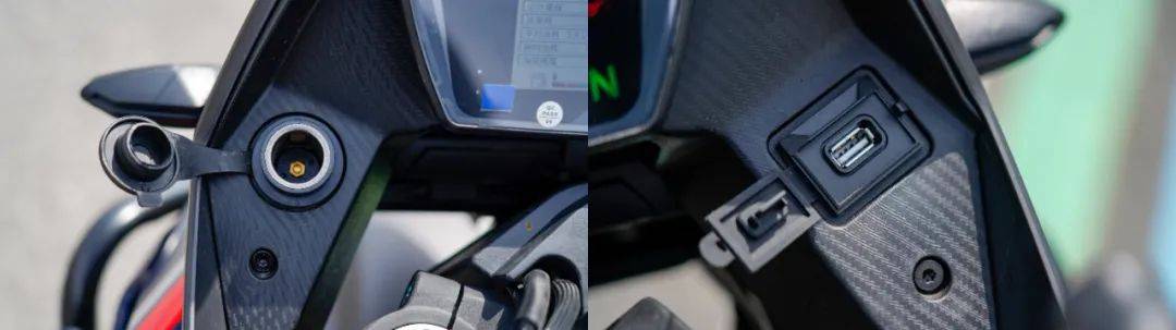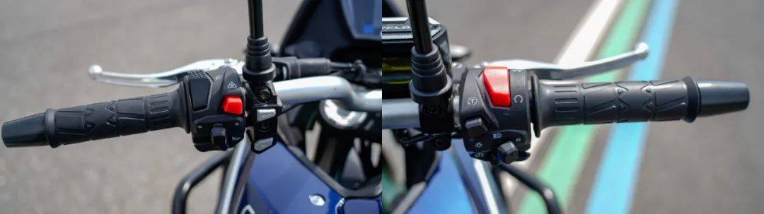 前后全部采用LED燈源,前照燈兩條LED燈帶所帶來的辨識度良好,夜間的照明效果如下圖,燈光的鋪路效果良好,下圖拍攝的圖和實際肉眼觀察效果非常接近??梢娊鉄翡伮贩秶浅4?,加上遠(yuǎn)光燈效果更強。這套家族式儀表出鏡率也是相當(dāng)高,顯示信息很全,提供三種UI頁面顯示,通過左手把上的MODE進(jìn)行切換,值得一提的是這塊兒儀表內(nèi)置了陀螺儀,可以實時顯示傾角角度,對于我們這種跑山愛好者來說,必須大贊。儀表兩側(cè)同時提供點煙器接口以及USB充電接口,功能性實用性兼顧,尤其是在旅行途中保不齊遇到扎胎的狀況,點煙器接口方便為充氣泵供電。開關(guān)部分依然是品牌通用件,按鍵背光在夜晚騎行時提示效果良好,同時功能性齊全,具備雙閃,TC關(guān)閉按鈕,自動大燈等功能。剎車及離合器拉桿均支持可調(diào)功能。