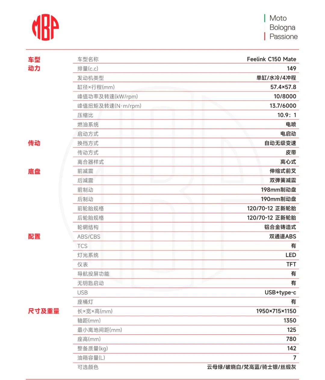 發(fā)動機與MBP之前上市的C150是同款,最大功率10千瓦/8000轉(zhuǎn),最大扭矩13.7牛米/6000轉(zhuǎn)。