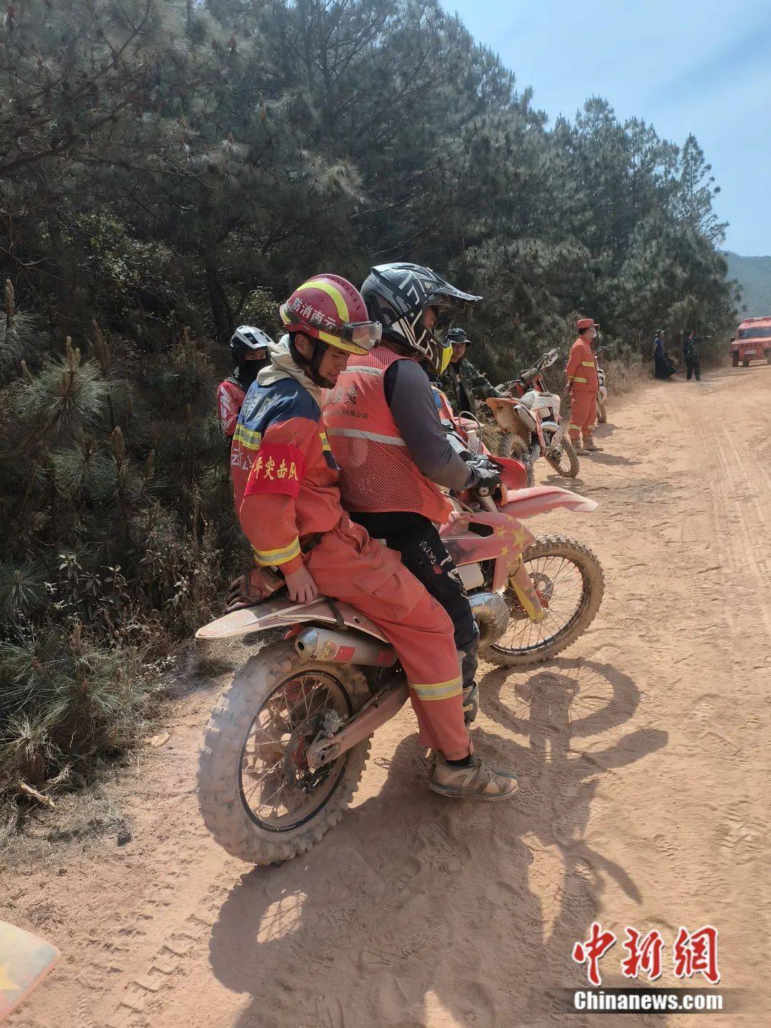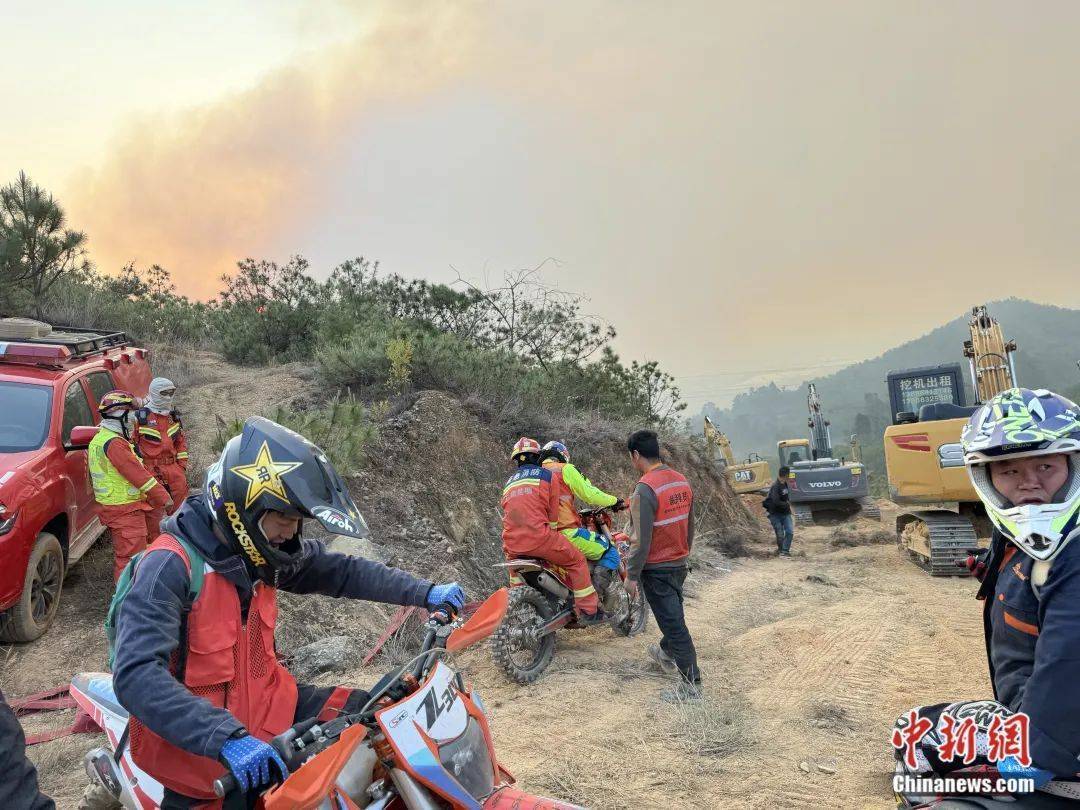 圖為摩托車志愿者在協(xié)助消防救援人員。黎建 供圖
