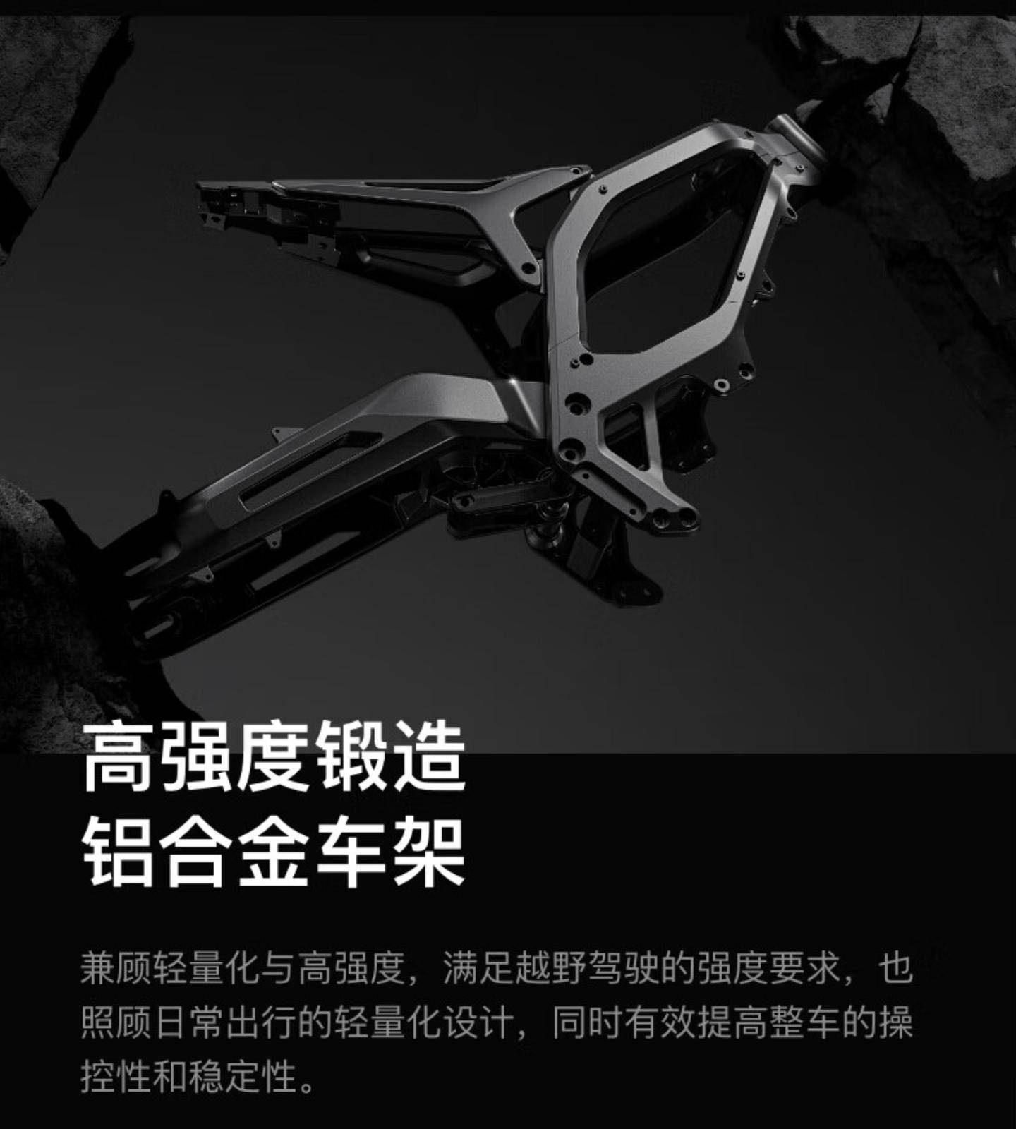 此外,X3 還使用高強(qiáng)度鍛造鋁合金車架,宣稱能兼顧輕量化與高強(qiáng)度,并搭載 KKE 前后可調(diào)避震,前減震行程達(dá) 200mm,標(biāo)配前后 19 寸越野輪胎。X3 前剎碟盤直徑 220mm,后剎碟盤直徑 203mm,并采用燒結(jié)剎車片。