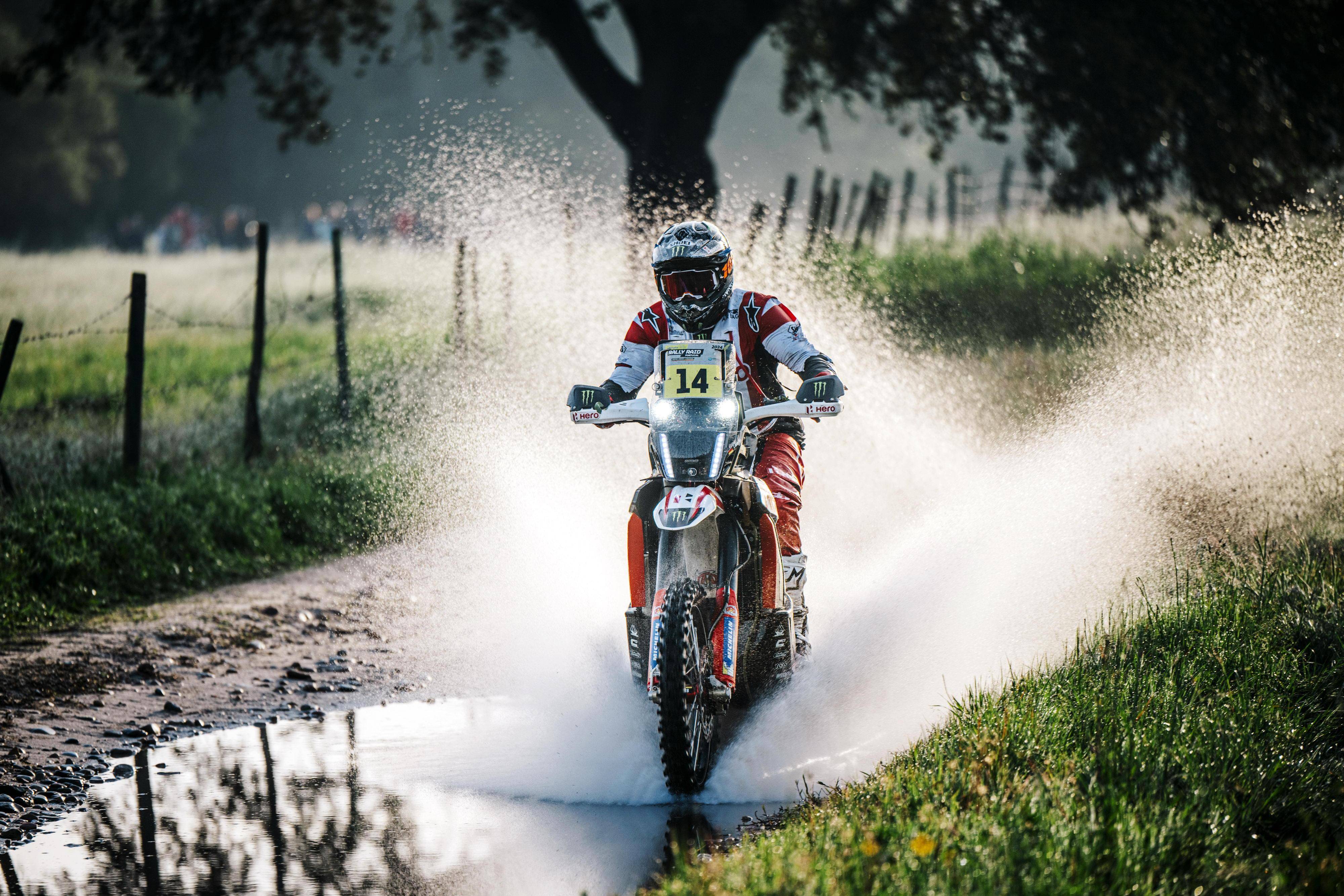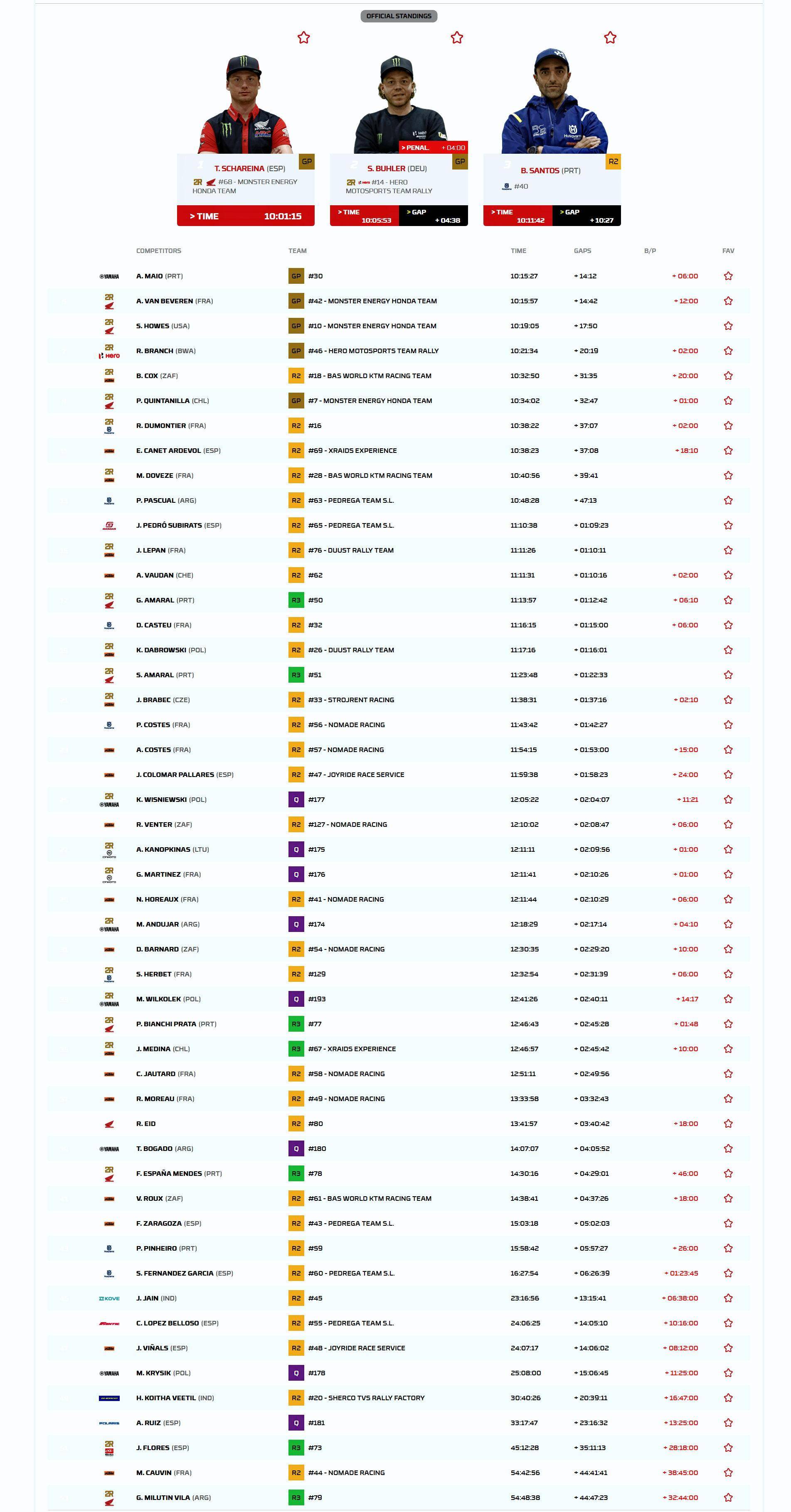 HRC 和 HERO 印度英雄都派出了工廠車隊參與葡萄牙站摩托車組的比賽,冠軍的爭奪戰(zhàn)也在這兩支工廠車隊間展開。最終,來自 HRC 工廠車隊、駕駛 68 號車的西班牙車手沙雷納(Tosha Schareina)奪得了冠軍,完賽的總時間是 10 小時 1 分 15 秒;來自 HERO 工廠車隊、駕駛 14 號車的德國車手布勒(Sebastian Buhler)落后四分多鐘、拿到了亞軍;來自葡萄牙、屬于 Rally2 級別的獨立車手桑托斯(Bruno Santos)奪得了全場的第三和級別冠軍,他落后全場第一名大約 10 分半鐘。