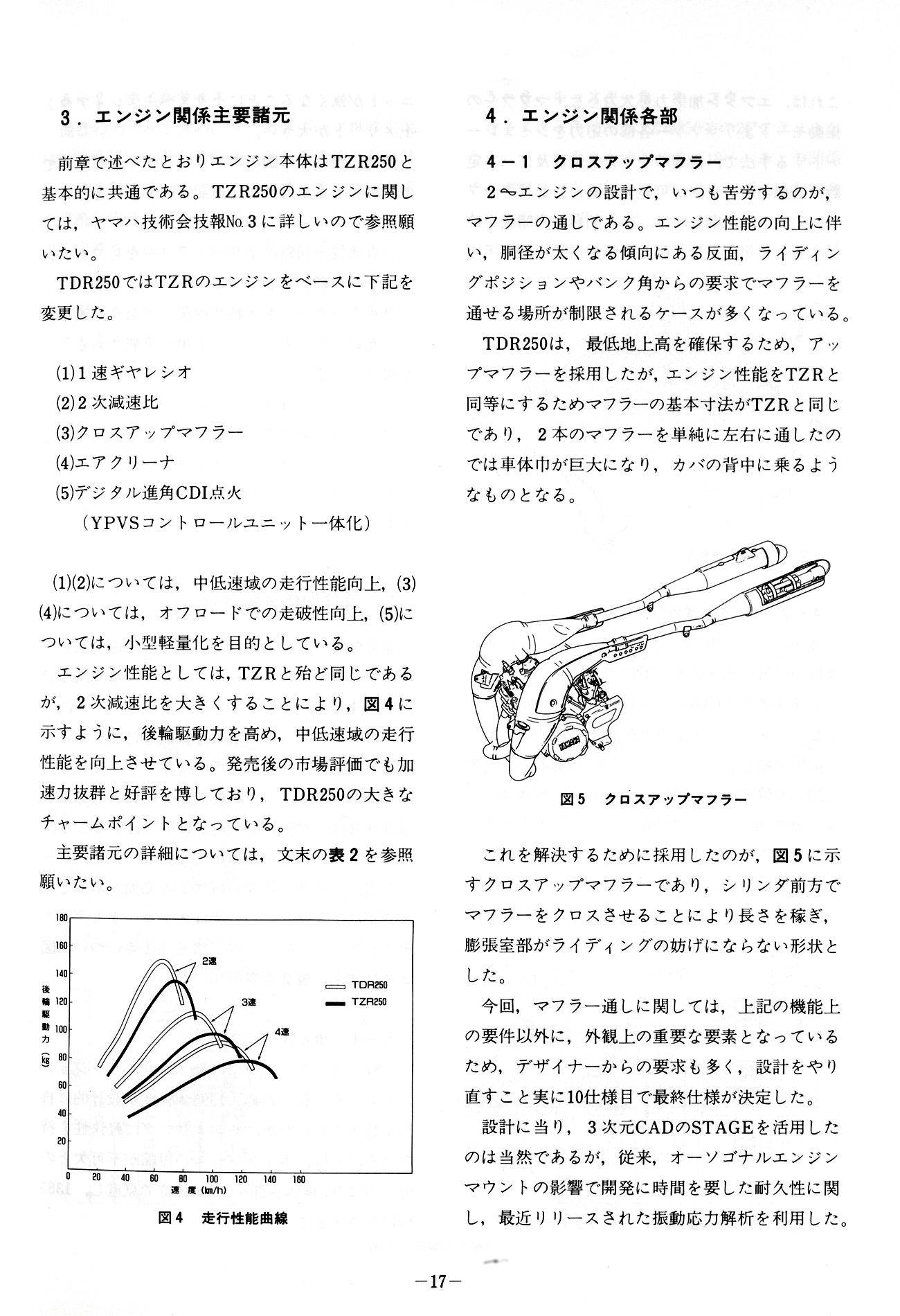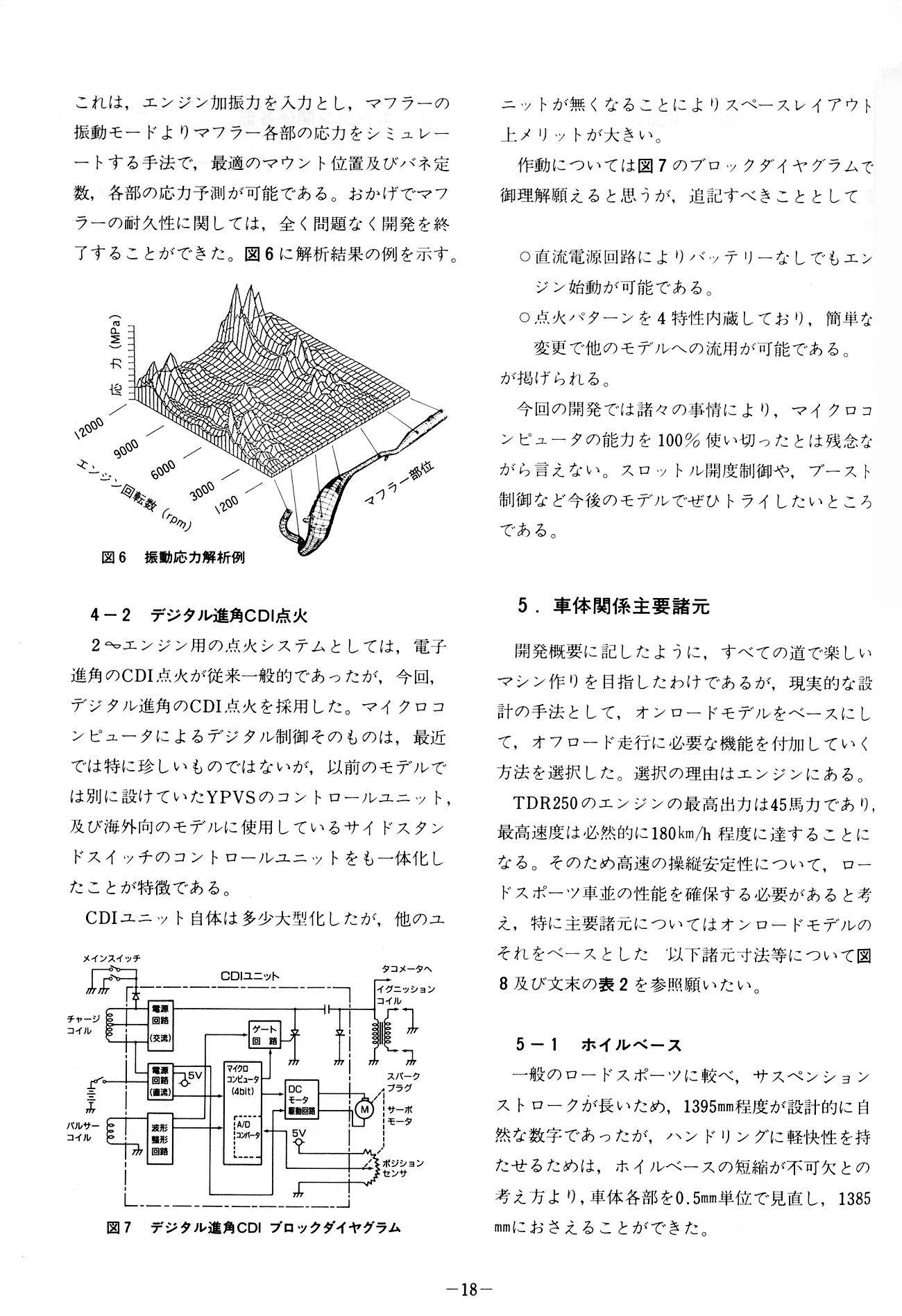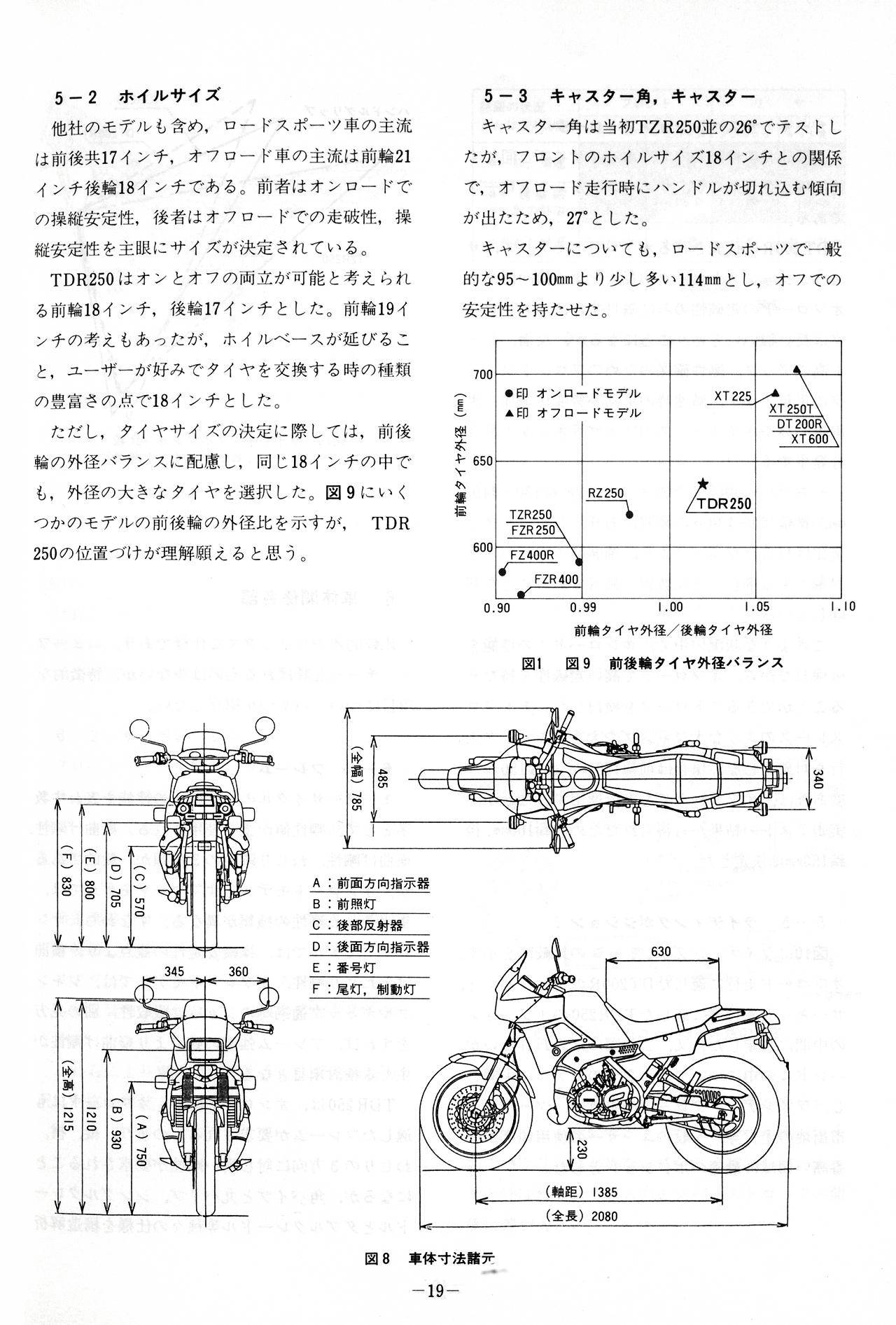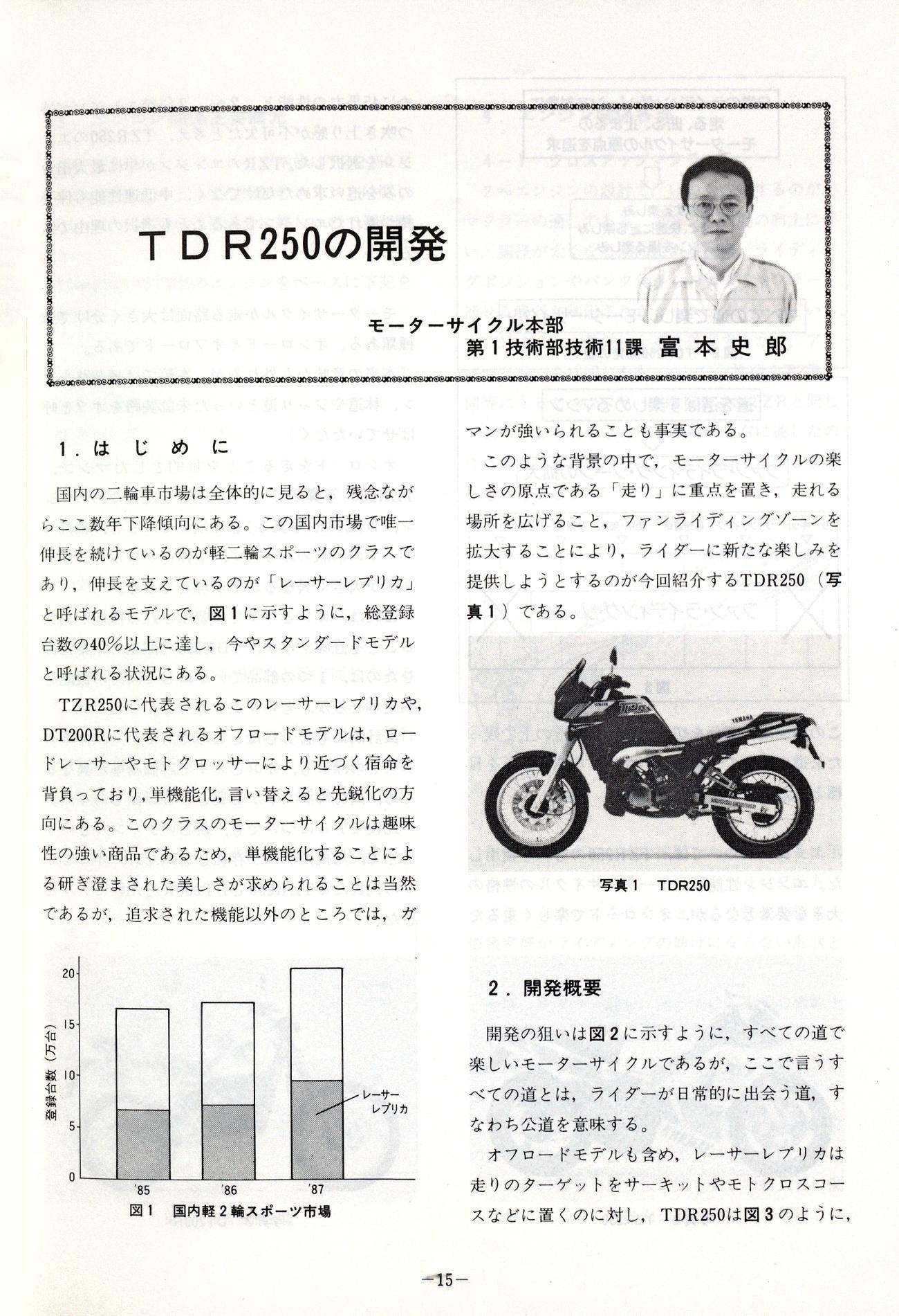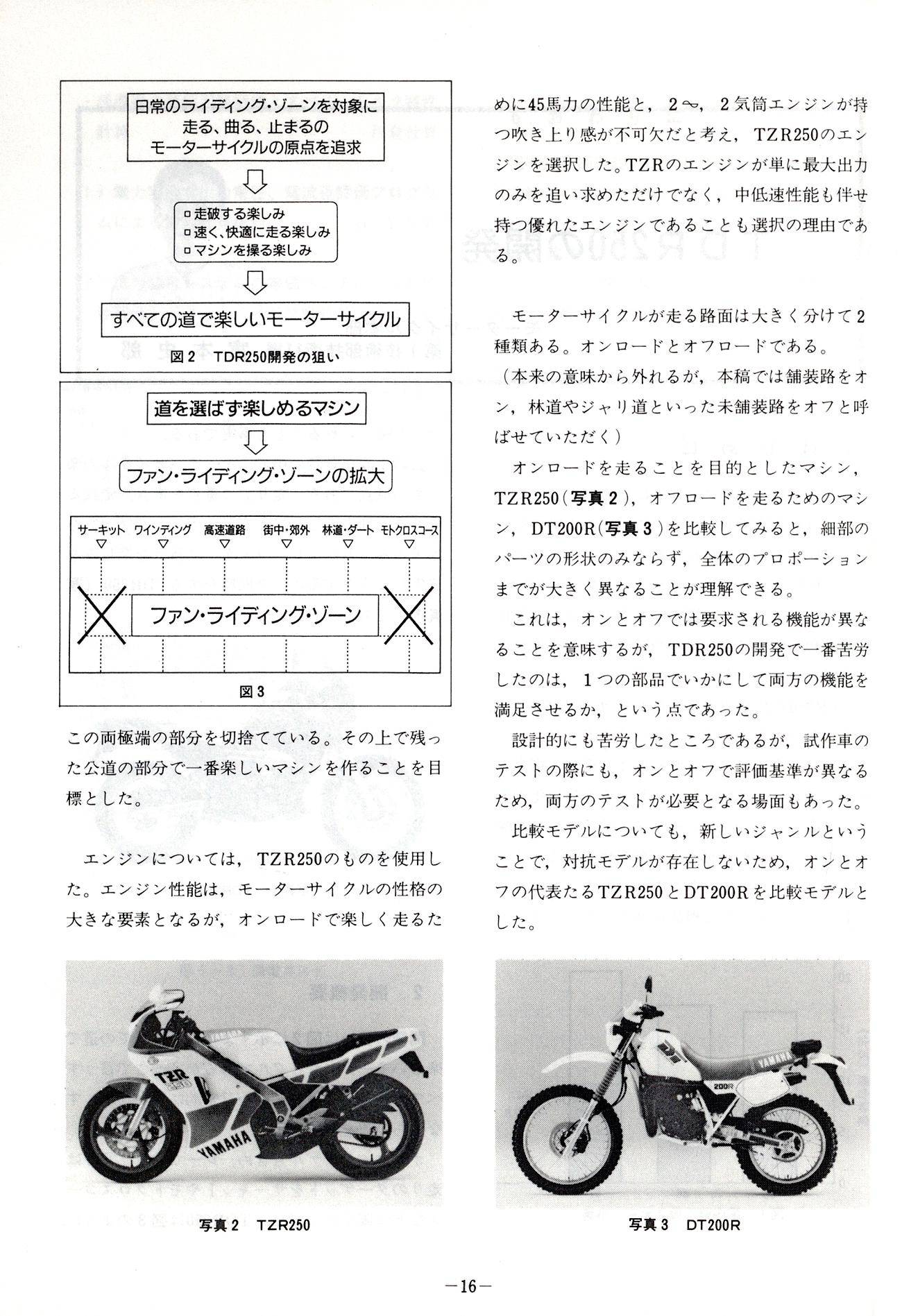 推出 TDR250 的同時,Yamaha 也以技術(shù)文獻(xiàn)的形式,公開了該車的一些設(shè)計理念。下面是編譯自 1988 年七月發(fā)布《Yamaha 技術(shù)會 技報 No.6》部分內(nèi)容的摘錄: