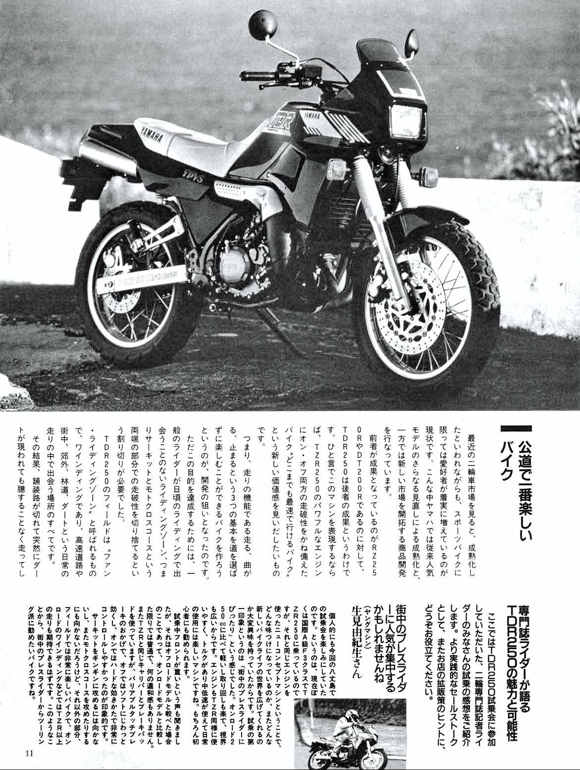 在新車發(fā)布時,廠方稱、新的 TDR250 為用戶提供了一個 “ 騎行新體驗(yàn) ”:它兼具了 TZR250 跑車、RZ250 運(yùn)動街車、DT200R 和 XT225 Serow 越野車的特性。由跑車衍生而來的動力單元,街車 + 越野車的坐姿,越野車的底盤(車架 + 懸掛系統(tǒng))、變速箱傳動比、輪胎,這就是那個年代里的 “ 跨界 ”。也許這種跨界,只是實(shí)現(xiàn)對各自功能(跑車、越野)、在某程度上的滿足,無法實(shí)現(xiàn)一個更加徹底的性能對標(biāo),但對于常規(guī)的駕駛者來說,卻能滿足大部分騎行場景的需要,多功能的意義或正在于此:讓一臺車滿足不同路況之下的需要,這樣就不用多買幾臺車、去跟不同的車友群集體出游,一車多用、從而減少了支出。