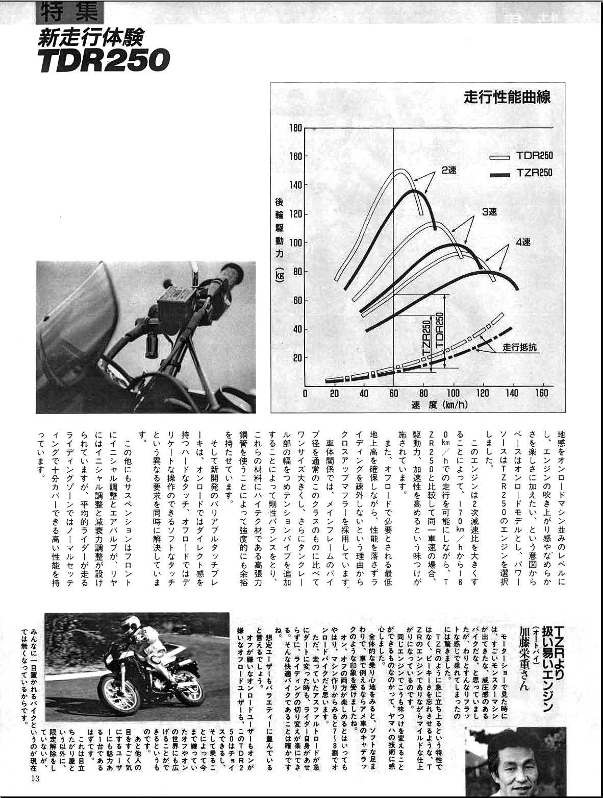 5、在整體性能上,TDR250 的發(fā)動機(jī)與 TZR250R 跑車基本相同,通過調(diào)整一檔的齒輪比、二次減速比,空氣濾清器、CDI 點(diǎn)火的變化和交叉式設(shè)計的排氣系統(tǒng),提高了 TDR250 的后輪驅(qū)動力和中、低轉(zhuǎn)速域的行走性能。上市之后,廠方收獲的 TDR250 市場評價中,其突出的加速能力、成為了該車核心魅力點(diǎn);