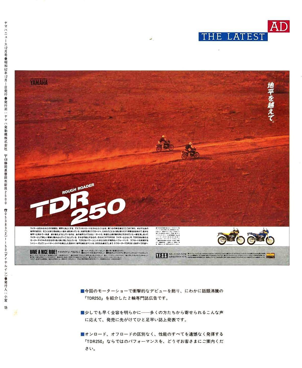 早在 1987 年十月底到十一月初舉行的第二十七屆日本東京車展上,Yamaha 就展示了全新的多功能車型 TDR250。該車當(dāng)時已經(jīng)被定義為 “ 參考出品車 ”,隨后在 1988 年正式上市。