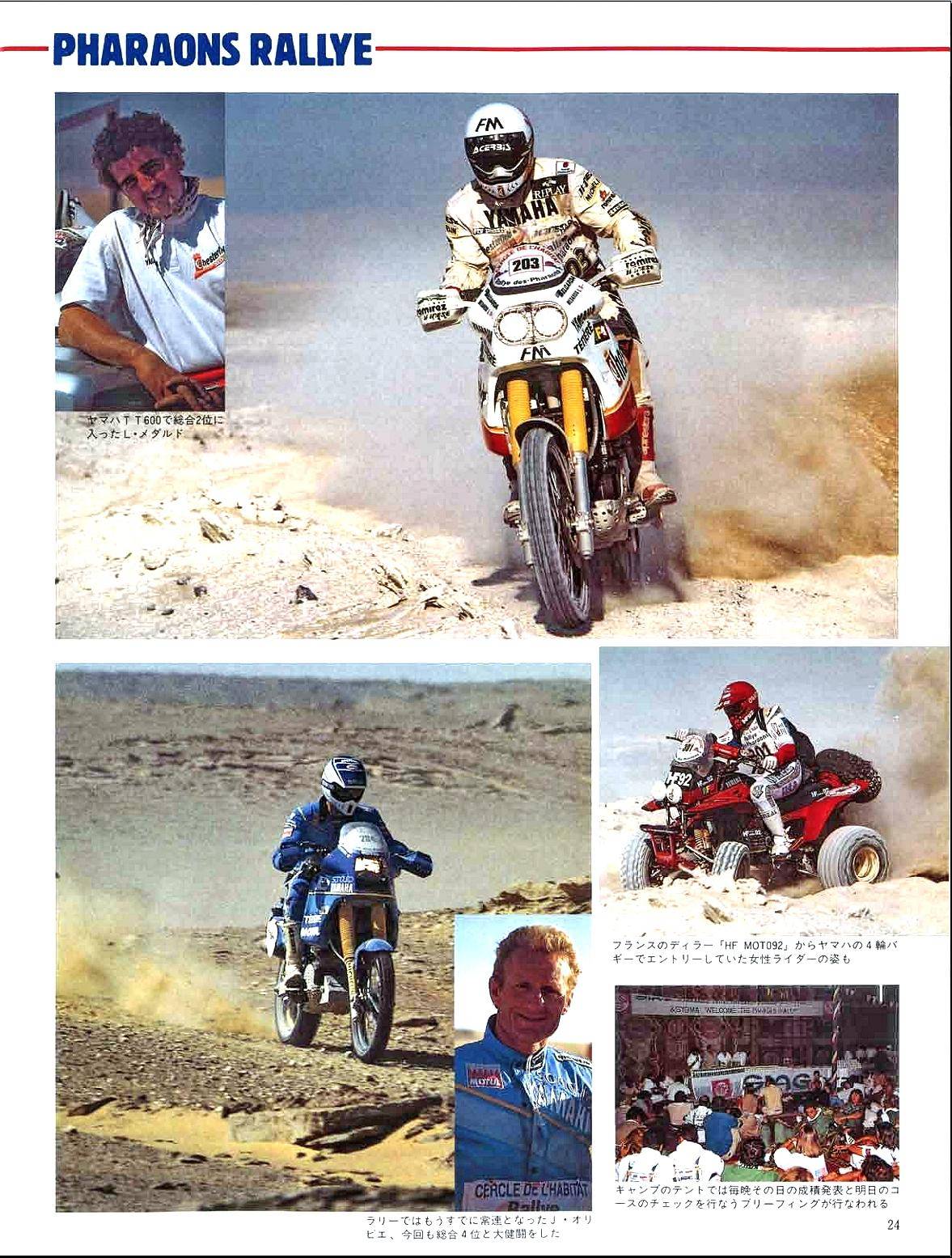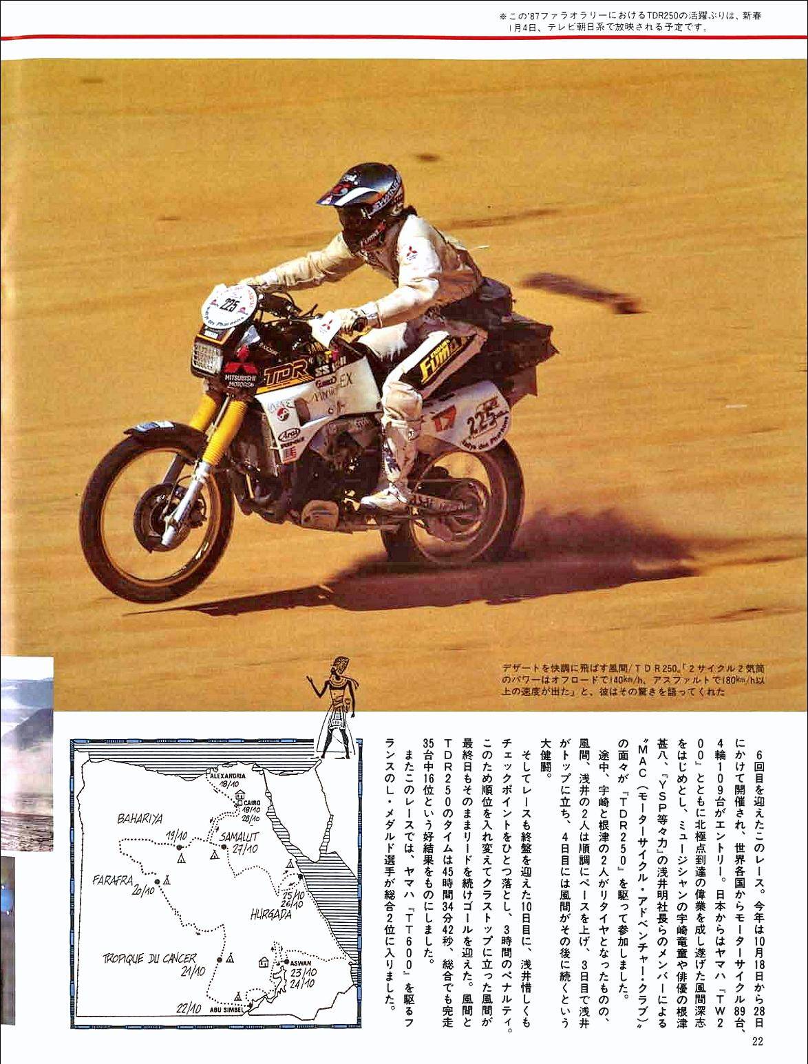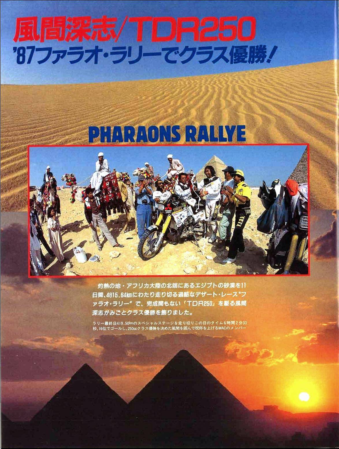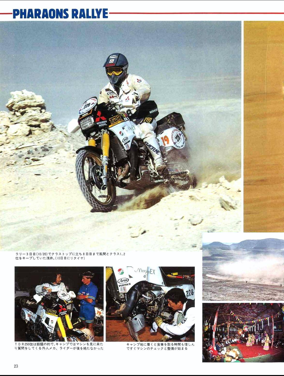 下面的圖片,參加 1987 年法老拉力賽的 TDR250(資料圖片。圖片來源:《Yamaha News》第 294 期,1987 年十二月號)。