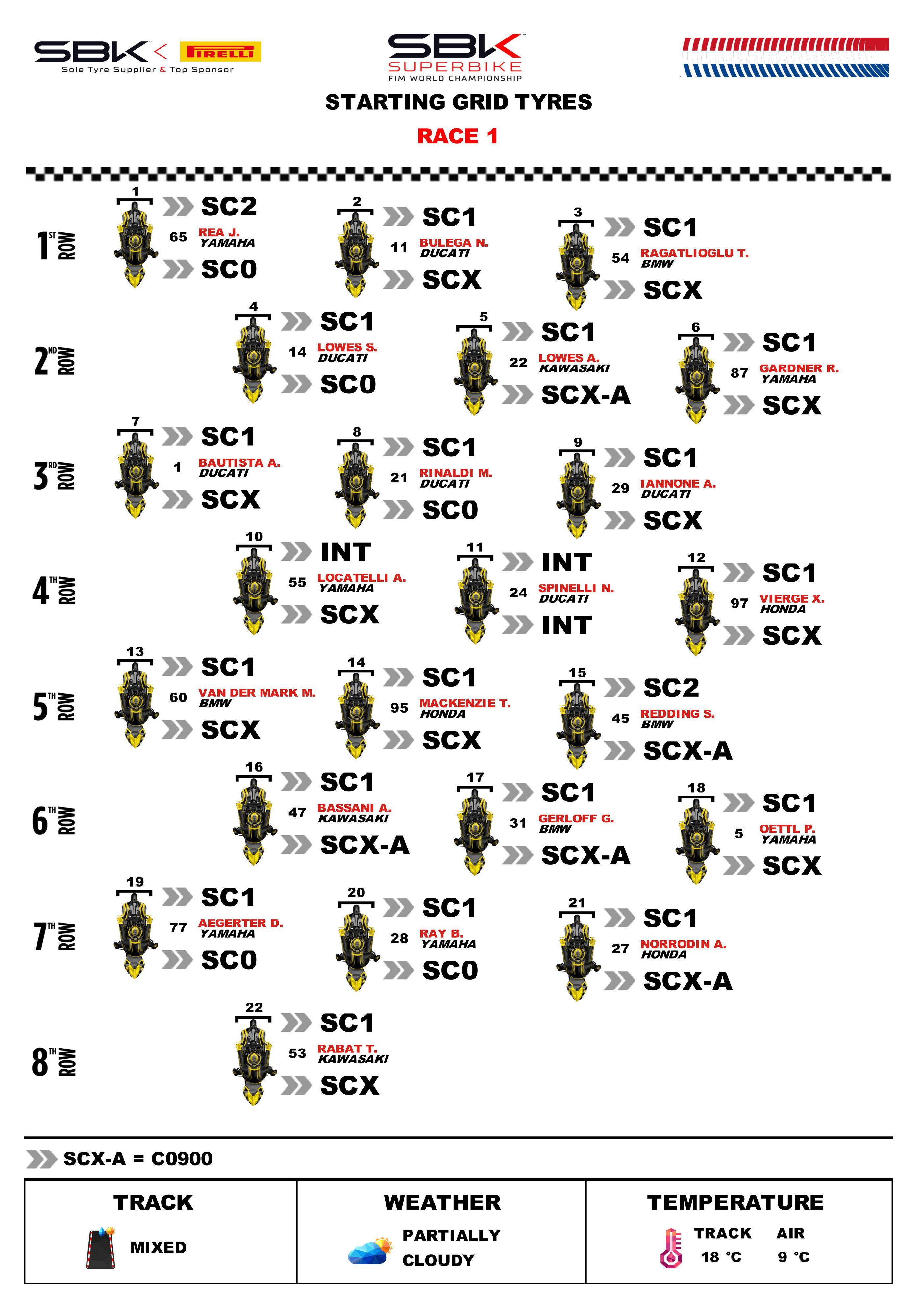 WSBK 級別,賽前的 Super Pole 超級排位賽,駕駛 65 號車、今年轉(zhuǎn)到 Yamaha 的英國車手雷亞(Jonathan Rea)在濕地之下、奪得了第一節(jié)比賽的排頭位出賽。后面,11 號車的布雷加(Nicolo Bulega)、54 號車的拉格里奧盧(Toprak Razgatlioglu)分別排在第二、第三位發(fā)車。