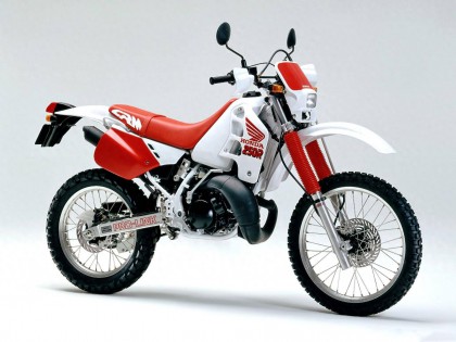 1989 年三月,Honda 正式推出全新的 On-Road 越野車 CRM250R(工廠編號 MD24)。這是廠方第一款搭載兩沖程 250 cc 級別發(fā)動機的可上牌車型,主要面向日本本土市場。該車搭載一副工廠編號為 MD24E 的水冷兩沖程單氣缸,缸徑、行程為 66 mm x 72 mm,排氣量 246 cc,節(jié)氣閥口徑為 32 mm 的化油器,能夠根據(jù)轉(zhuǎn)速去獲取最佳點火特性的 DC-CDI 點火系統(tǒng)、可變 RC 排氣動力閥門,六檔的變速齒輪箱,具有高冷卻性能的左、右分割式配置的雙散熱器,最大動力輸出 37 匹。