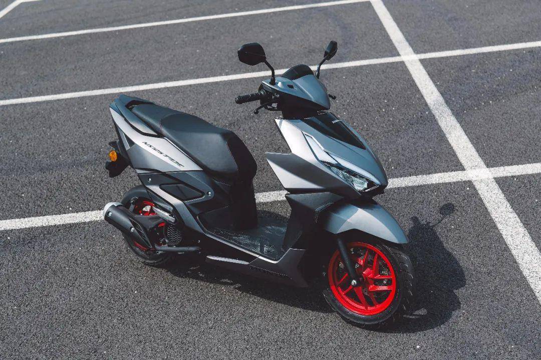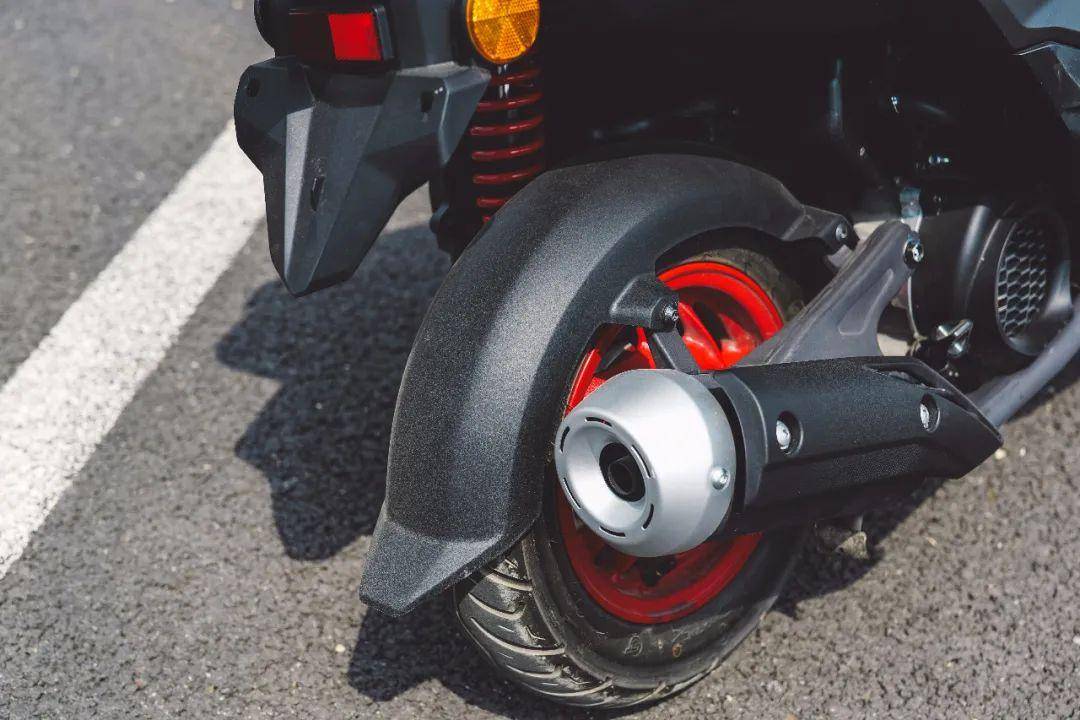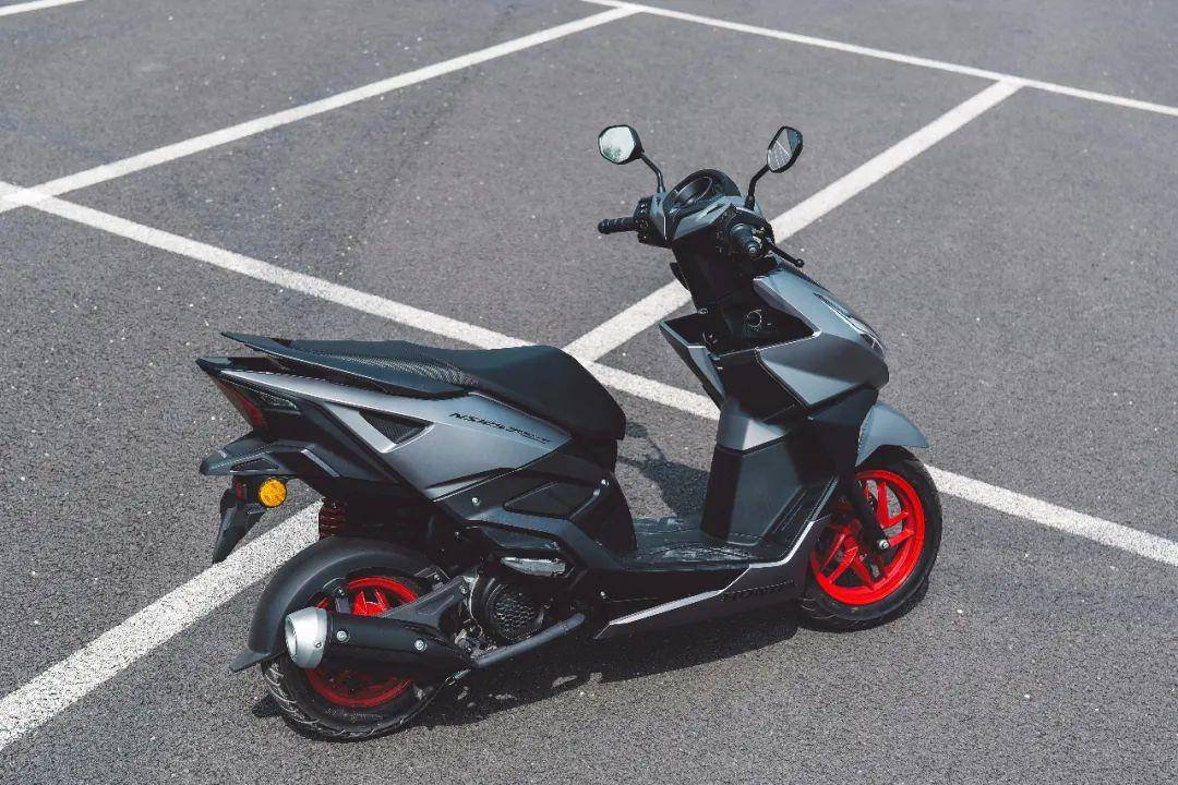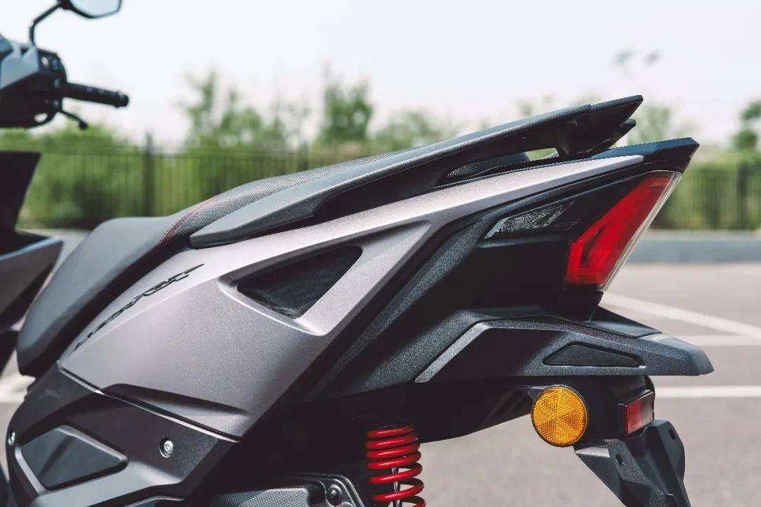 車身的線條變化豐富了,車頭側(cè)面,腳踏板下和車身側(cè)面的變化更多。尾部則依舊保留了上翹的特點,并且側(cè)面看比老款更尖,向后延伸的效果也更明顯。尾燈是這款車外觀的一大亮點,深邃立體式尾燈采用了3D設(shè)計,開啟后一層層的漸進效果明顯,深邃感覺讓人一眼就能知道這款車的型號,算是這個級別踏板車中辨識度非常高的一款尾燈造型。我們拿到的這款車是火山灰配色,加上紅色的輪轂,運動感十足。