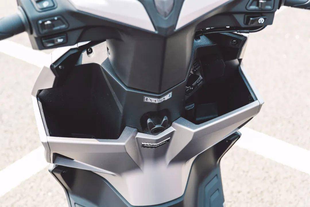 除了外觀的大改款,裂刃在配置上也進行了升級。初期的裂是前后10英寸輪轂,后期升級了前12英寸輪轂,而裂刃直接采用了前12英寸輪轂,所以在車頭造型上也更加協(xié)調(diào)。全車LED燈具,儀表依舊采用了這款圓形液晶儀表,儀表臺的造型也和裂行很像。車把下方是兩個開放式儲物格,右邊儲物格上方是無鑰匙啟動開關(guān),下面還有Type-C充電接口。