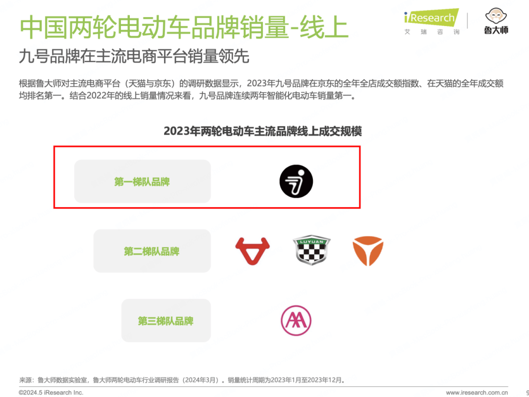 近日,艾瑞咨詢正式發(fā)布《2024年中國兩輪電動車行業(yè)研究報告》,據(jù)報告內(nèi)容顯示,九號智能兩輪電動車拿下多個行業(yè)第一的成就——連續(xù)兩年蟬聯(lián)行業(yè)銷量第一、智能化程度評測連續(xù)三年蟬聯(lián)行業(yè)第一、4000元以上高端車型銷量第一、線上銷售成交額第一,這無疑是對九號品牌實力和市場影響力的最佳證明。這一系列輝煌戰(zhàn)績的取得,不僅依賴于九號在產(chǎn)品質(zhì)量、技術(shù)創(chuàng)新方面的不懈追求,更得益于其對市場趨勢的準確把握和對消費者需求的深刻理解。