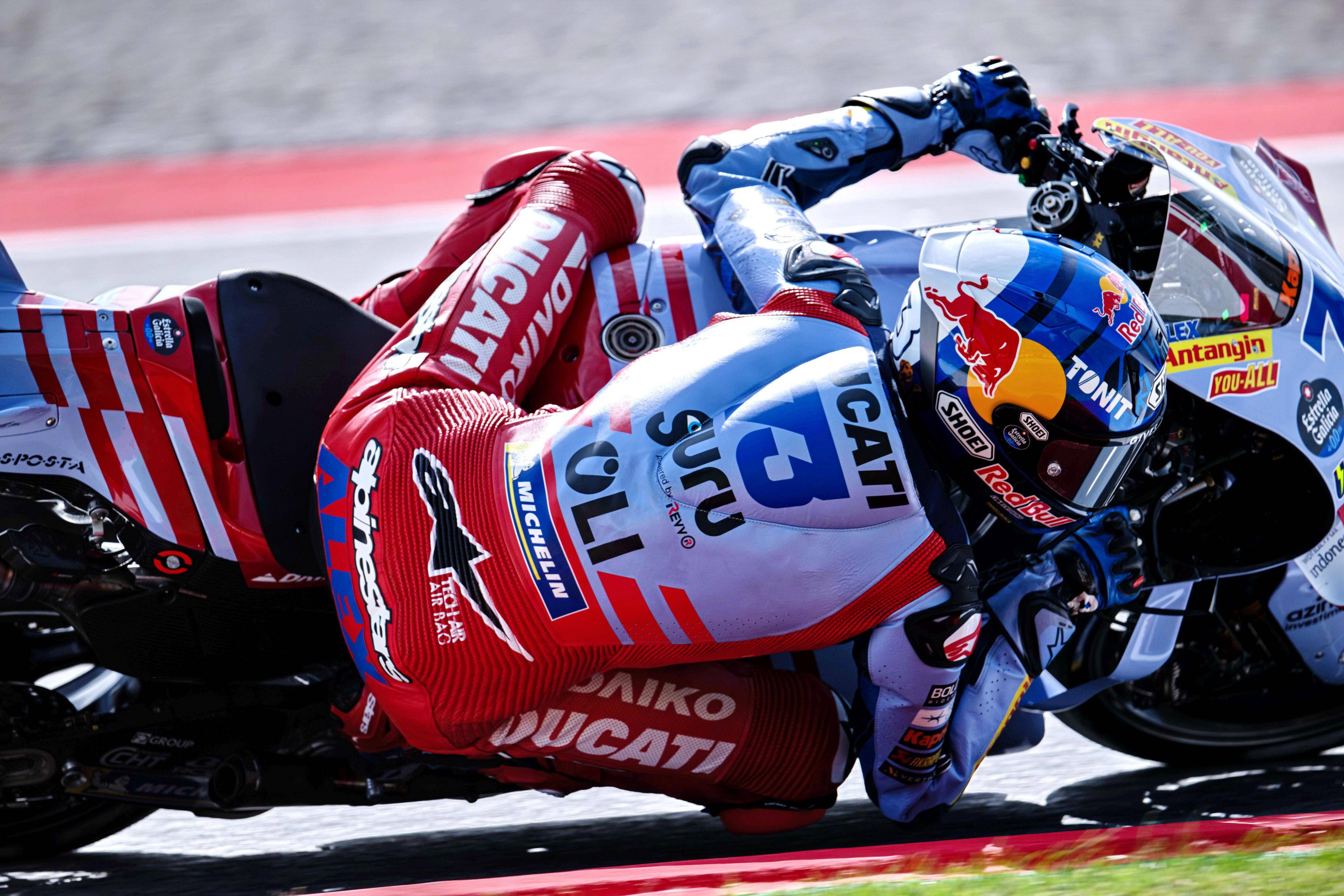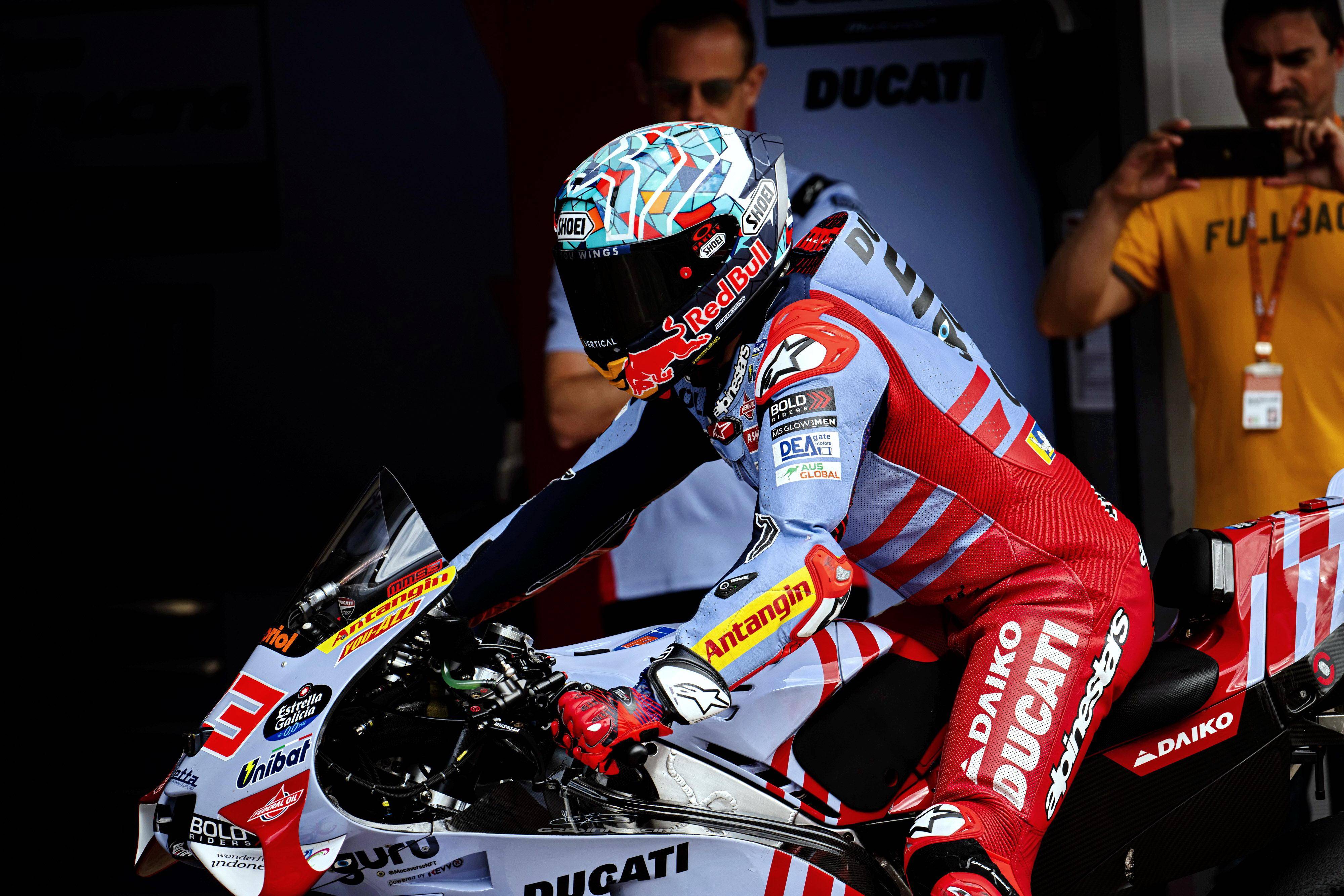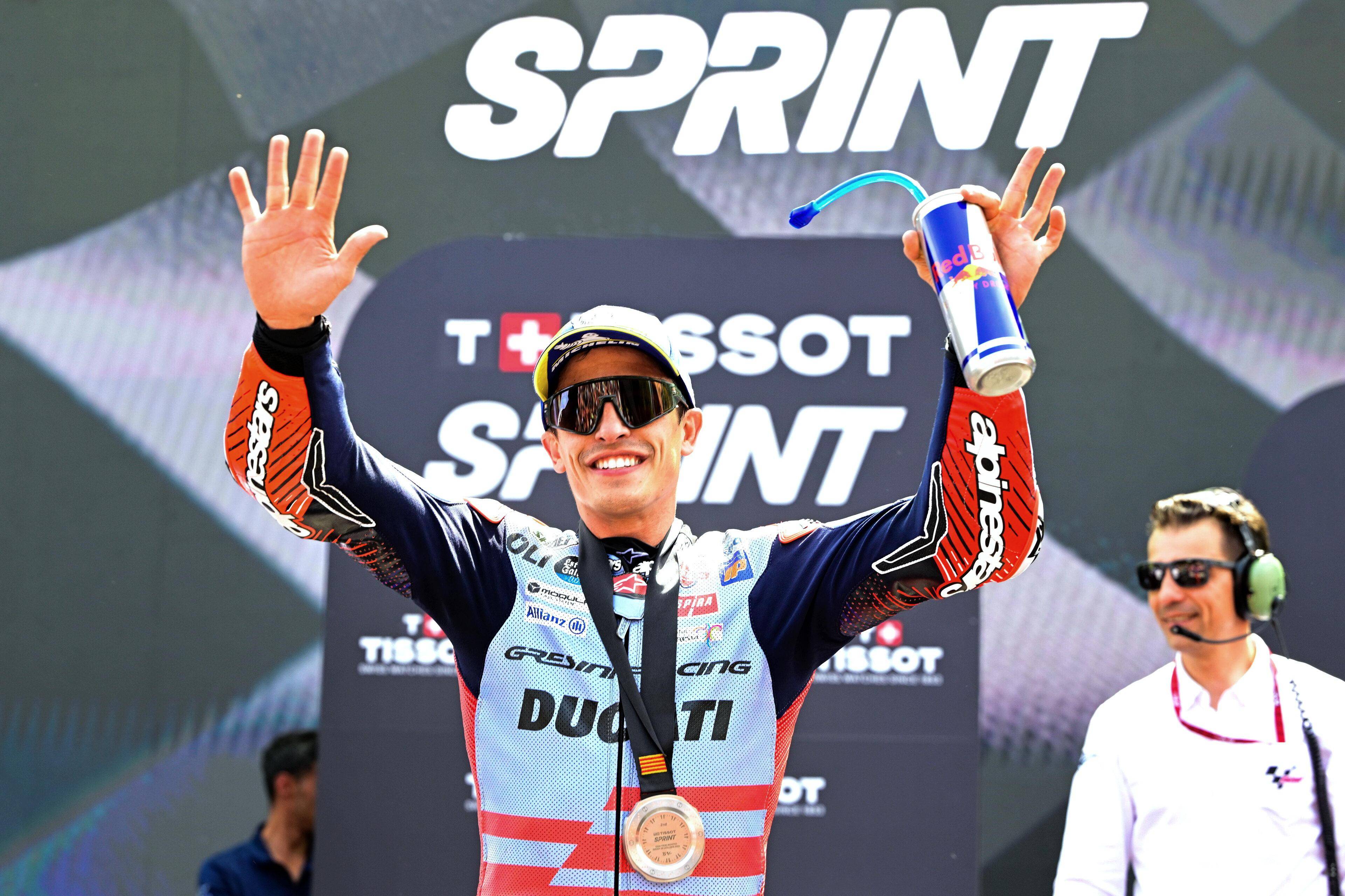 隨后進(jìn)行的 MotoGP 級(jí)別沖刺賽,賽程為 12 圈、折合近 56 公里。吉斯尼 MotoGP 車(chē)隊(duì)的兩位車(chē)手,在正式發(fā)車(chē)后不久、都遭遇了突發(fā)狀況:車(chē)群中的擦碰、讓馬昆斯的 Desmosedici GP23 失去了一邊的定風(fēng)翼,小馬昆斯在四號(hào)彎的一個(gè)失誤、也讓他掉到了隊(duì)尾的最后。