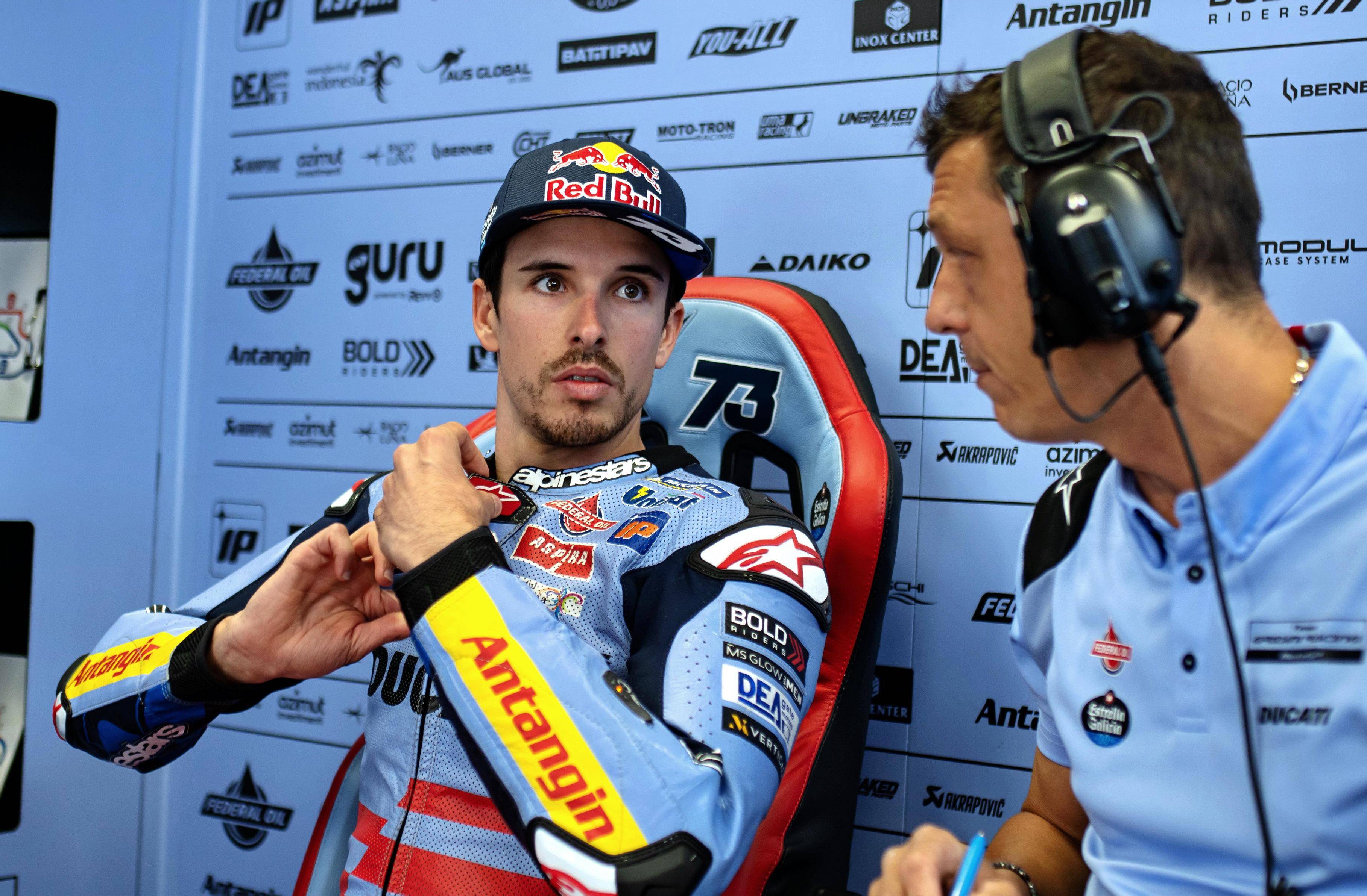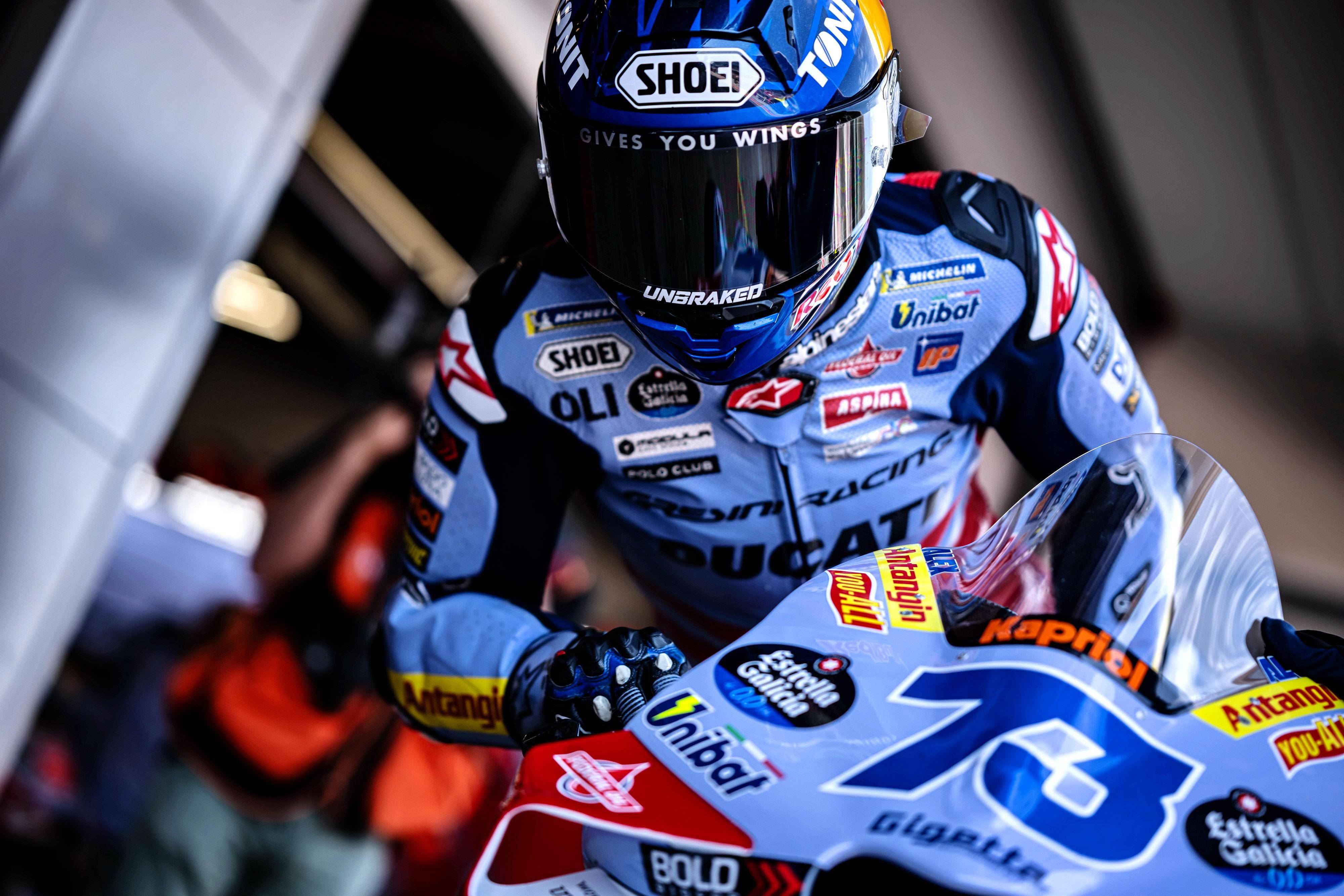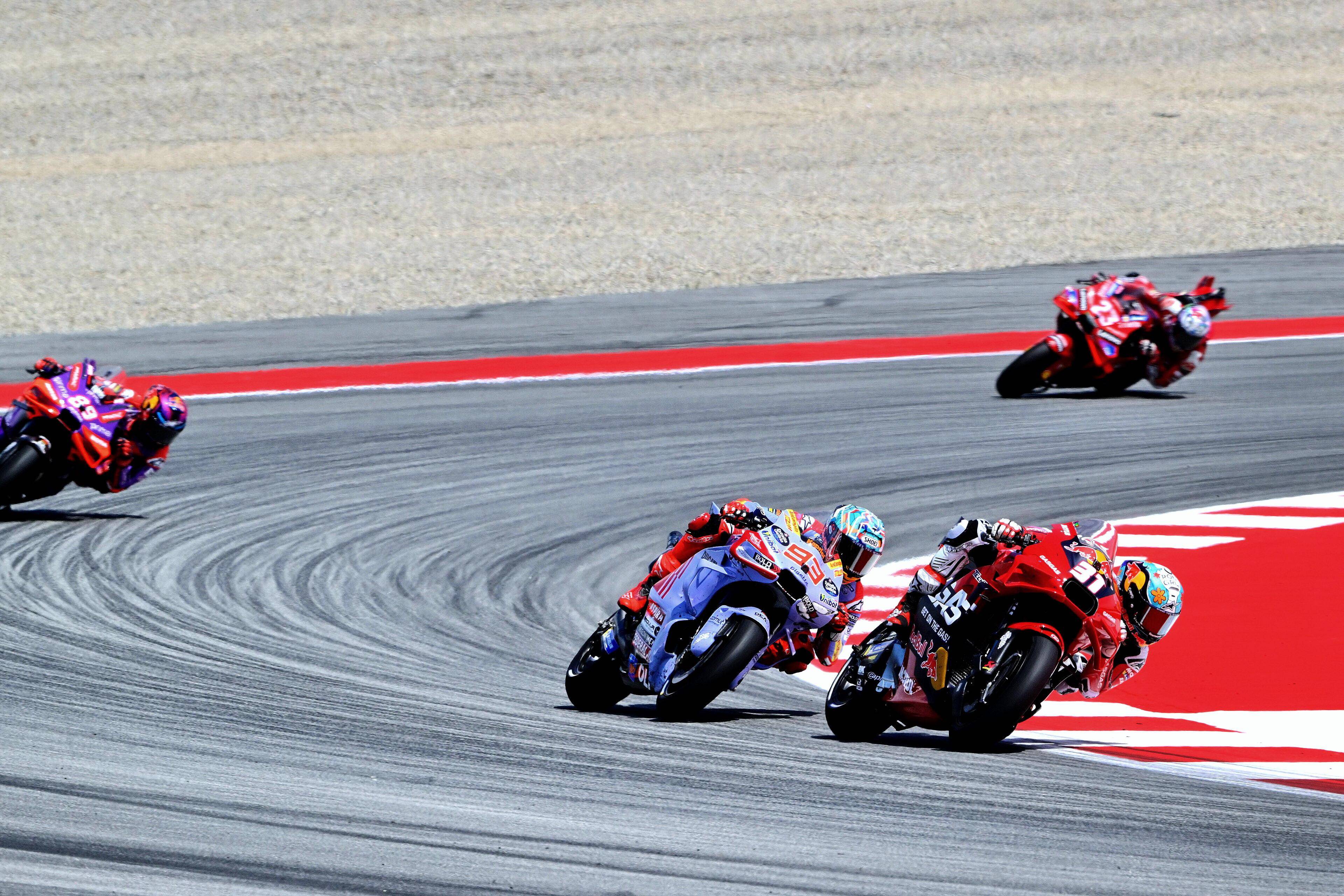 隨后進(jìn)行的 MotoGP 級(jí)別沖刺賽,賽程為 12 圈、折合近 56 公里。吉斯尼 MotoGP 車(chē)隊(duì)的兩位車(chē)手,在正式發(fā)車(chē)后不久、都遭遇了突發(fā)狀況:車(chē)群中的擦碰、讓馬昆斯的 Desmosedici GP23 失去了一邊的定風(fēng)翼,小馬昆斯在四號(hào)彎的一個(gè)失誤、也讓他掉到了隊(duì)尾的最后。