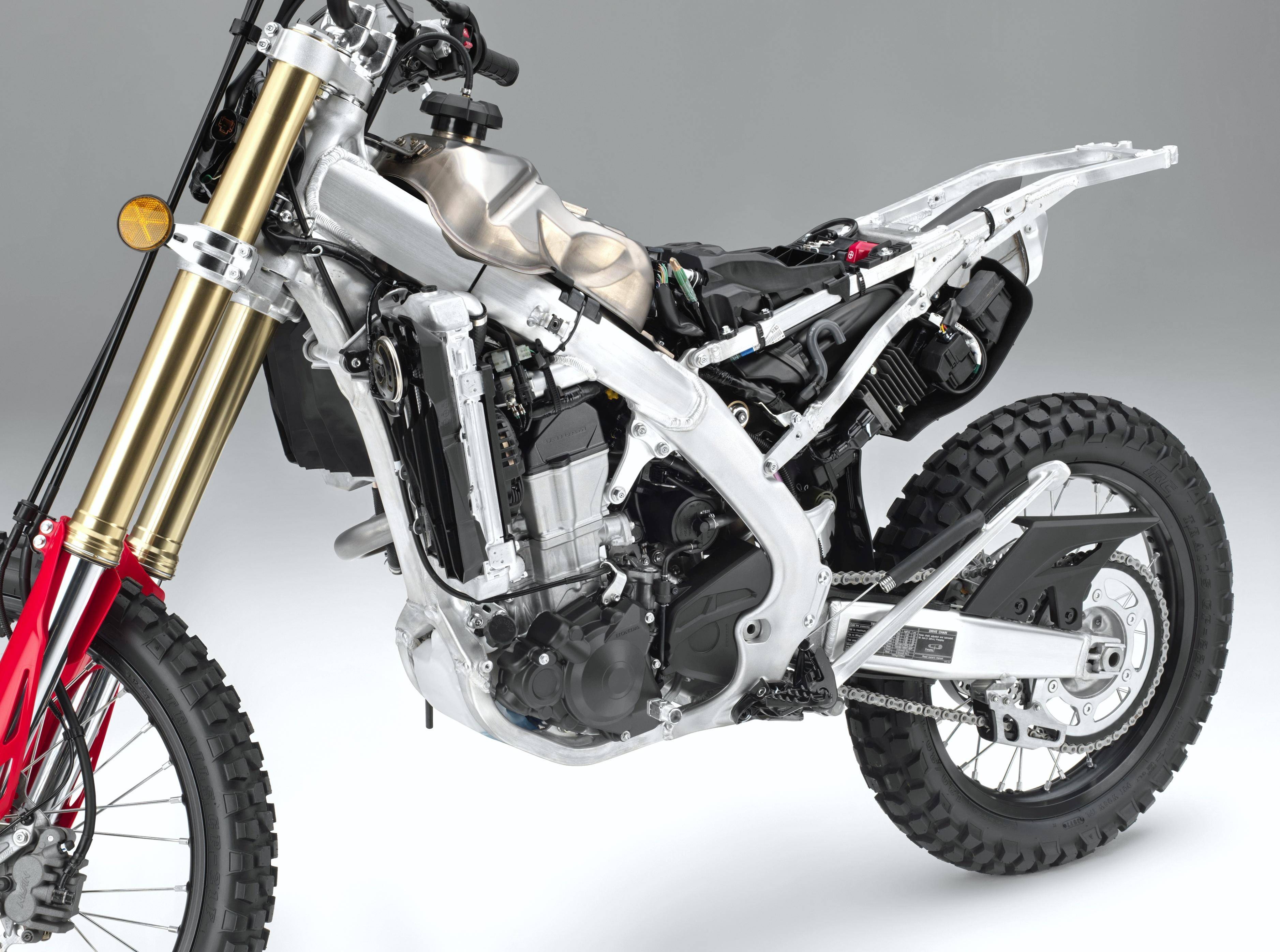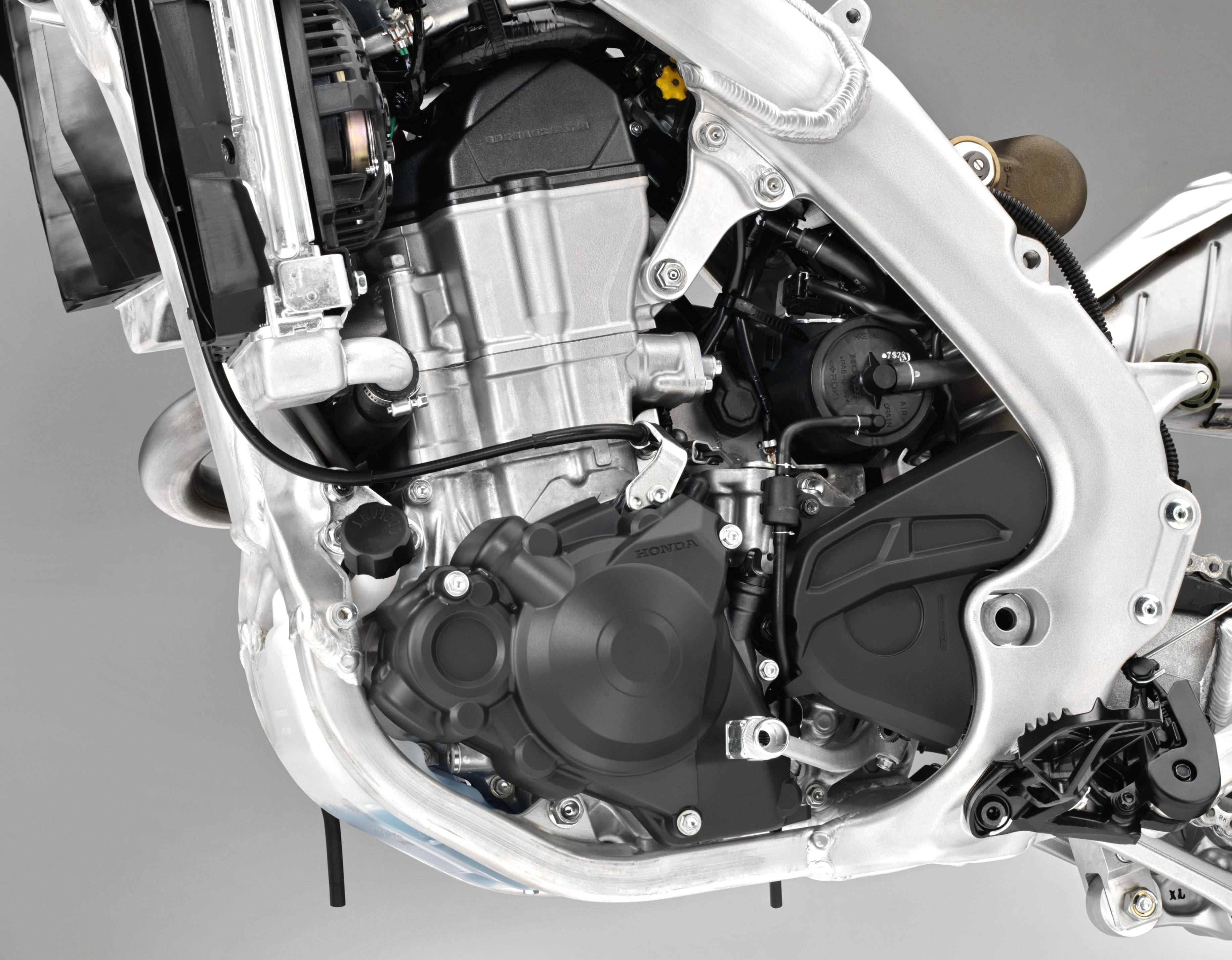1、搭載一副來自市售越野賽車 CRF450R 的水冷四沖程單汽缸、SOHC 四汽閥(Unicam)發(fā)動機,缸徑、行程為 96.0 mm x 62.1 mm,排氣量 449 cc,壓縮比從賽車的 13.5:1、調(diào)低至 12.0:1;