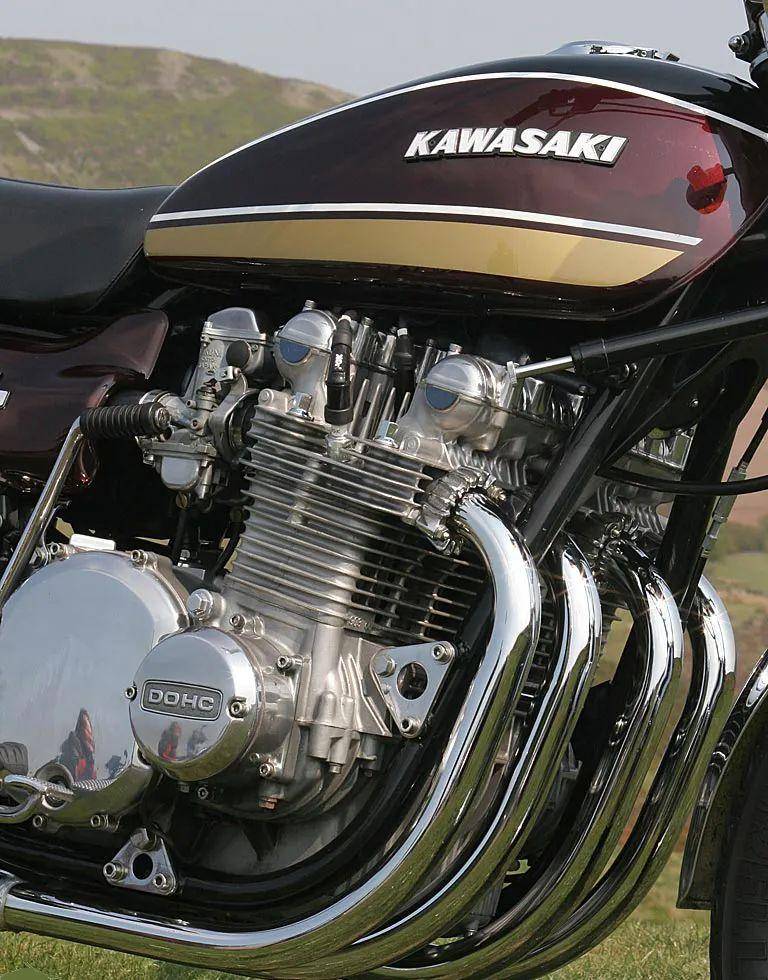 Z1搭載的動(dòng)力裝置也是并列四缸發(fā)動(dòng)機(jī),但是汽缸排量擴(kuò)大到903mL,壓過(guò)本田CB750的風(fēng)頭,成為當(dāng)時(shí)日本生產(chǎn)的最大汽缸排量摩托車,超過(guò)了意大利摩托·古茲850。更令人吃驚的是,為了全面占取上風(fēng),川崎工程師放棄了本田CB750采用的SOHC氣門機(jī)構(gòu),為這臺(tái)并列四缸發(fā)動(dòng)機(jī)配置了DOHC氣門機(jī)構(gòu),實(shí)現(xiàn)了低轉(zhuǎn)速到高轉(zhuǎn)速范圍內(nèi)的高性能輸出。這是川崎第一次嘗試在量產(chǎn)型摩托車上采用DOHC氣門機(jī)構(gòu),而當(dāng)時(shí)國(guó)際范圍內(nèi)采用DOHC氣門機(jī)構(gòu)的量產(chǎn)型摩托車同樣屬于鳳毛麟角!