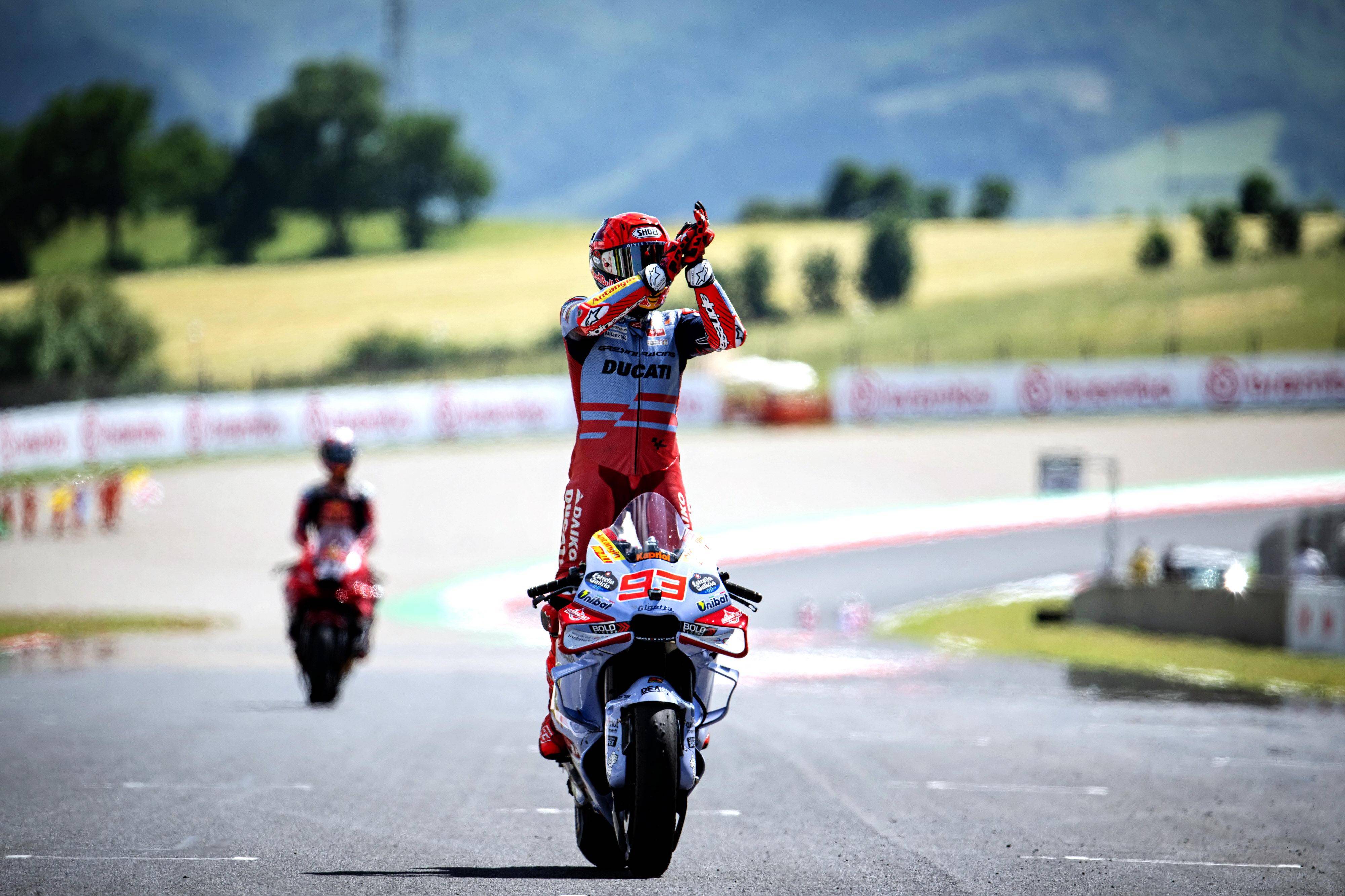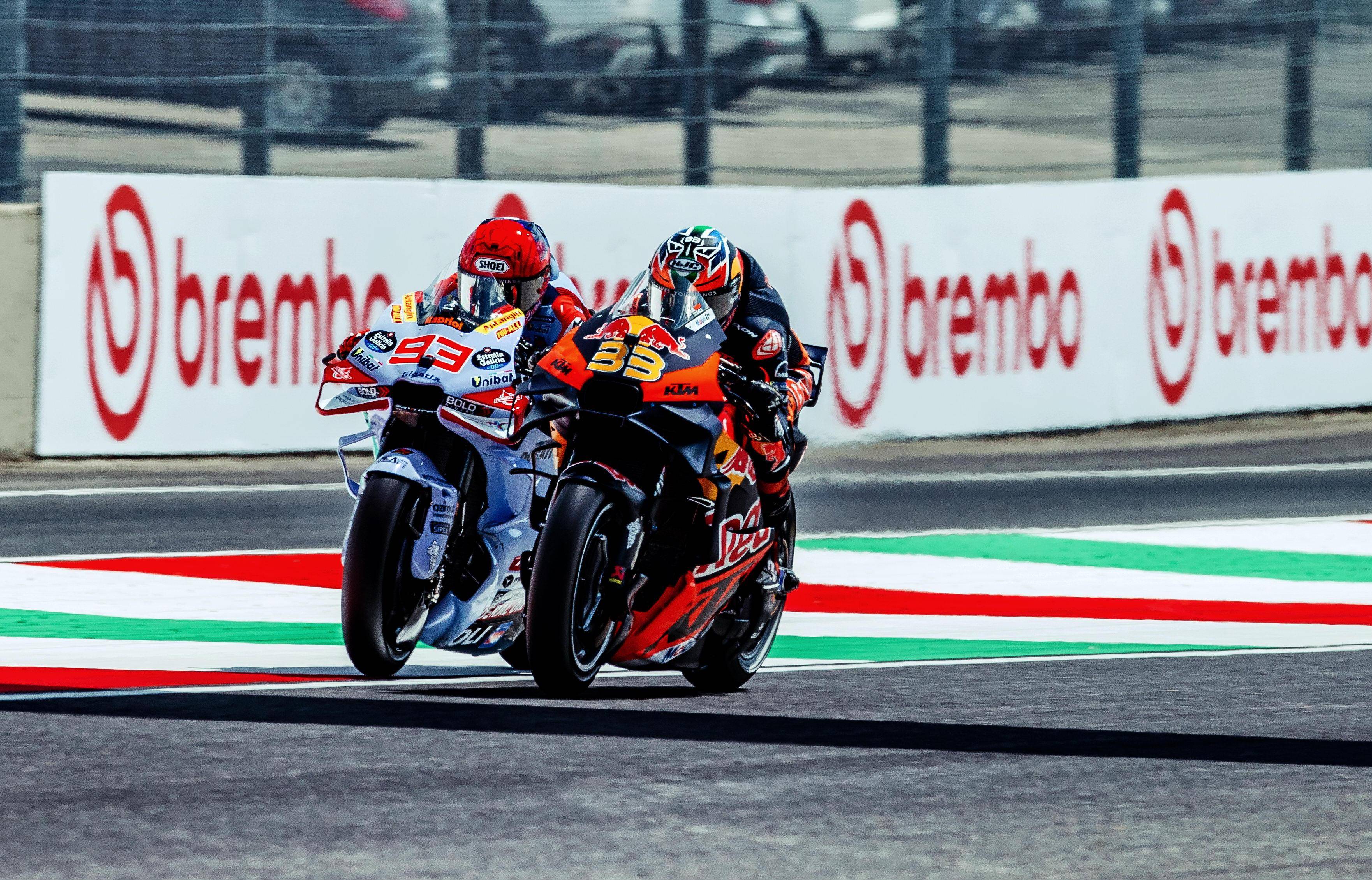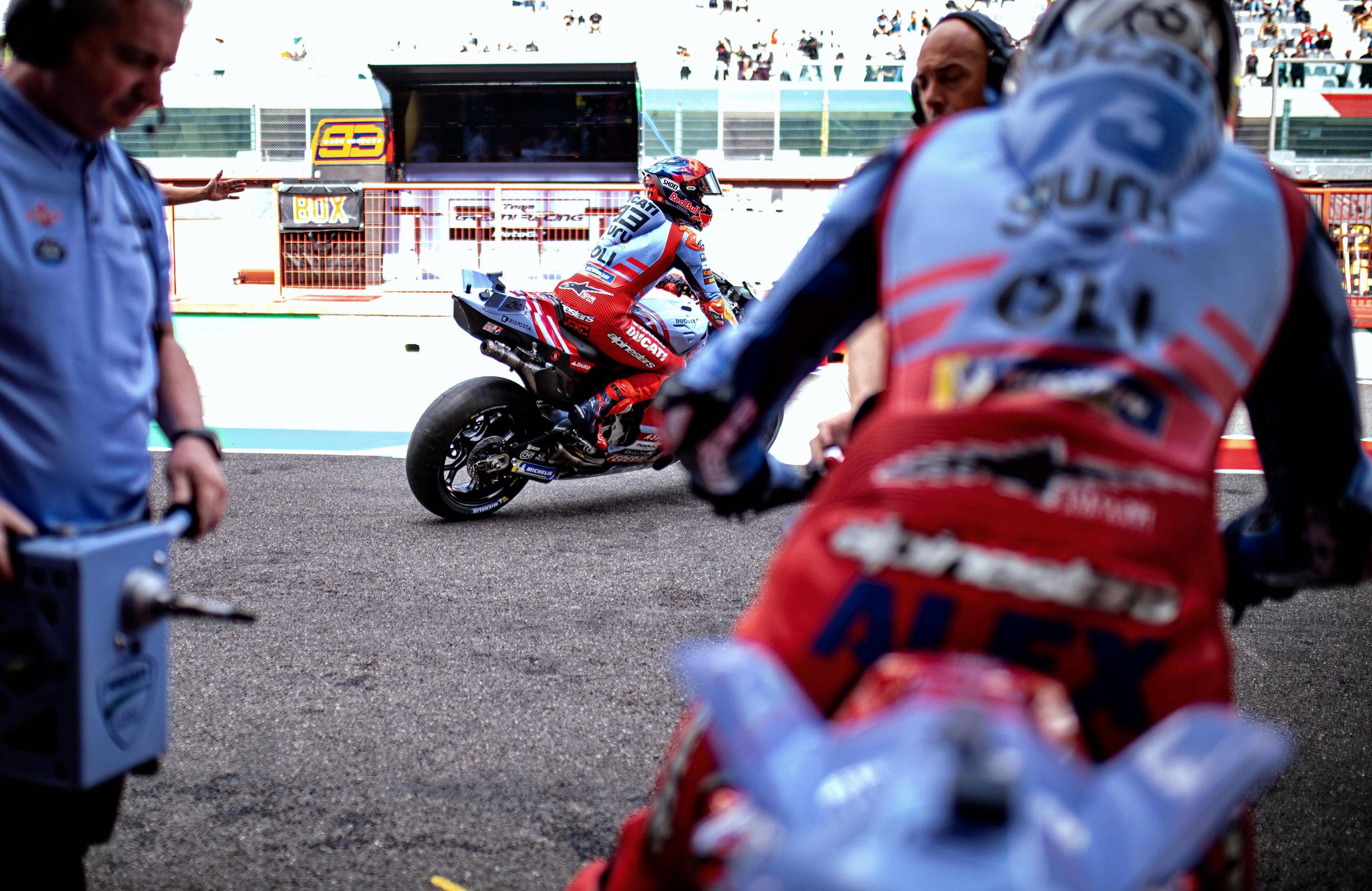 當(dāng)?shù)貢r(shí)間午后 2 點(diǎn) 45 分開始的 Sprint 短途沖刺賽,賽程為 11 圈、折合約 57 公里。兩位車手起跑平平,完成了第 1 圈比賽后,馬昆斯排在第五、小馬昆斯則掉到了第十一名;隨后的比賽里,兩位車手開啟的急起直追的模式,而馬昆斯駕駛著 Desmosedici GP23 在大直路尾與賽道極速紀(jì)錄保持者賓達(dá)(Brad Binder,他在去年的沖刺賽里跑出了 366.1 km/h 的最大極速紀(jì)錄)的決斗、更是這場(chǎng)角逐里的經(jīng)典場(chǎng)景之一。