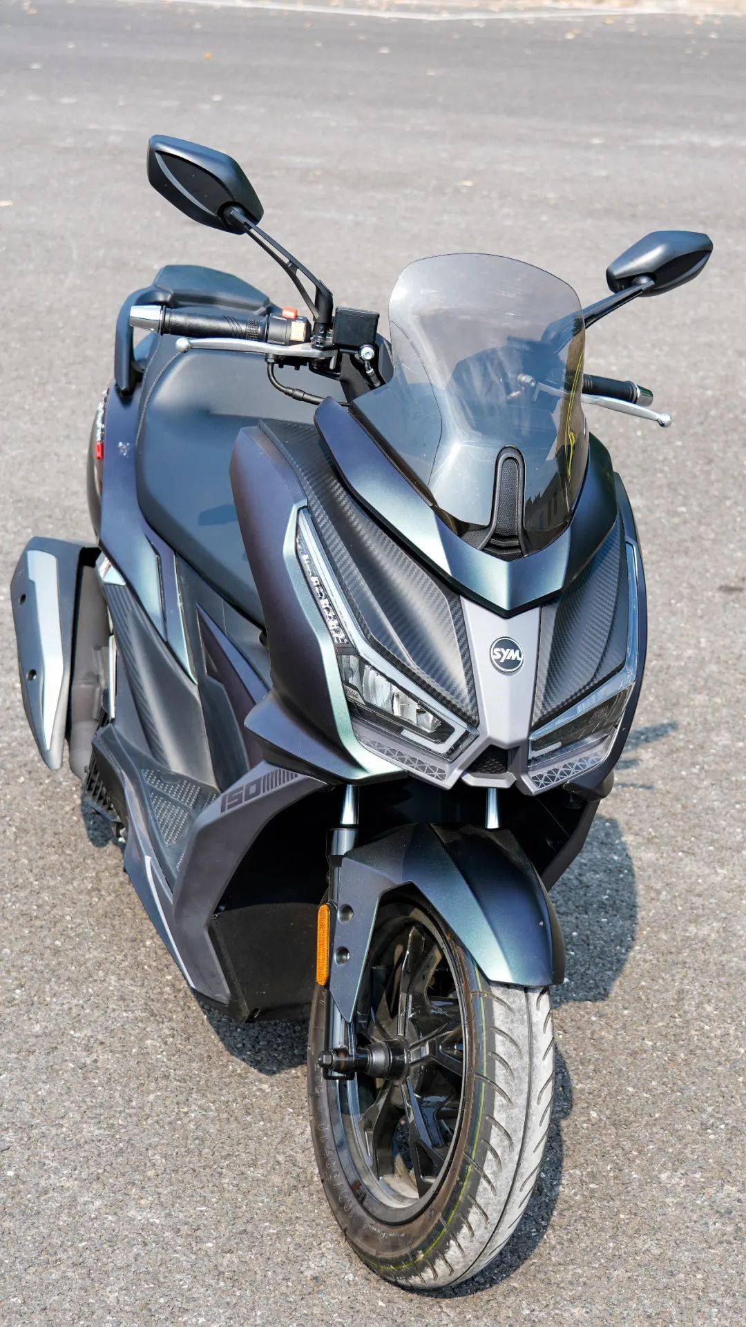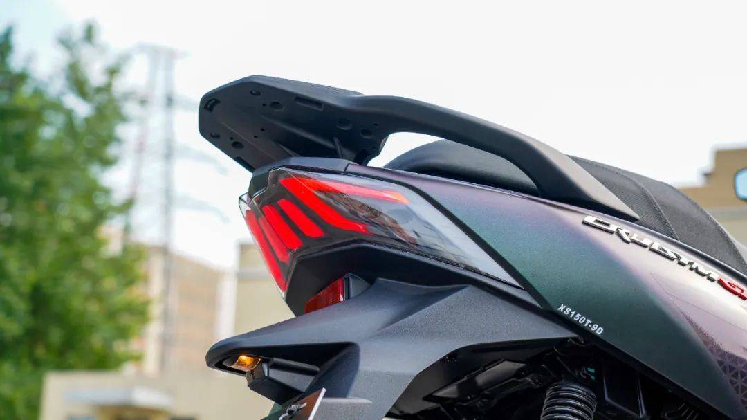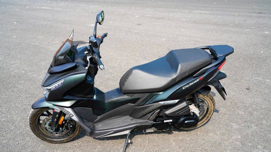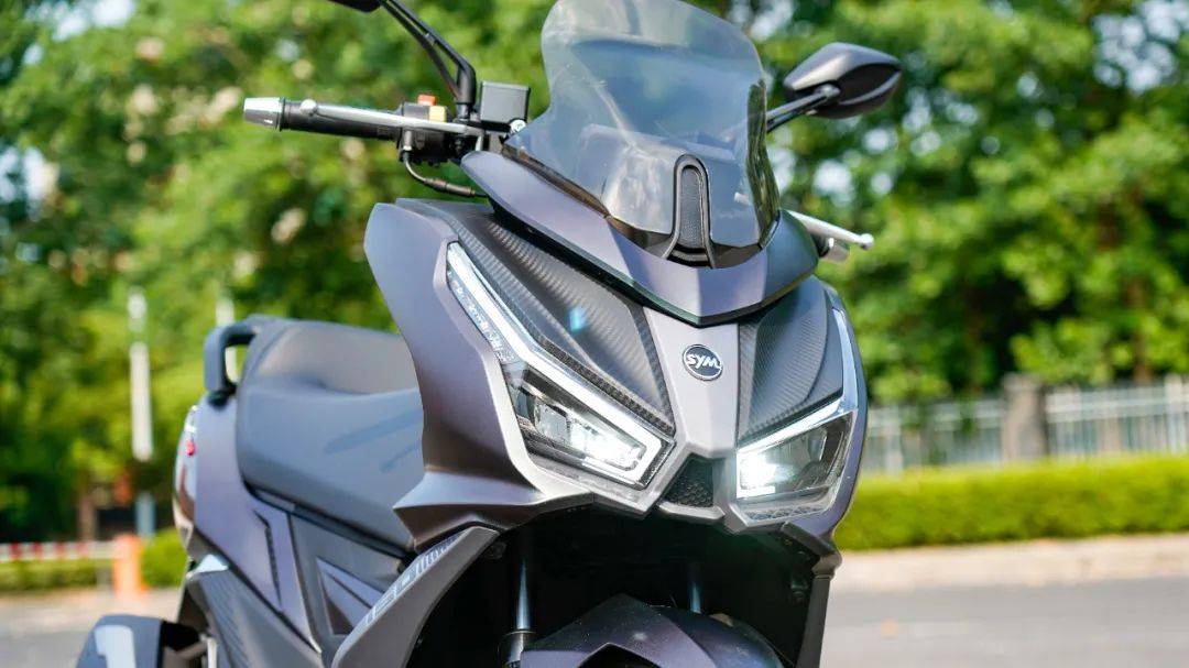 外觀設(shè)計上與自家的Joymax z300系列保持家族化外觀,銳利扁平化的前燈組,搭配凌厲的車身和尾部線條,整體呈現(xiàn)一種機甲戰(zhàn)斗風(fēng)格,給人運動化以及侵略性的感受,尤其是今天拿到的這臺曼巴綠的配色,漆水質(zhì)感高端,采用了仿生學(xué)原理,側(cè)面觀感偏向褐色,正面則是啞光綠,有些變幻莫測的視感。風(fēng)擋較平踏版巡弋150略有增高,捎帶一些擋風(fēng)效果。