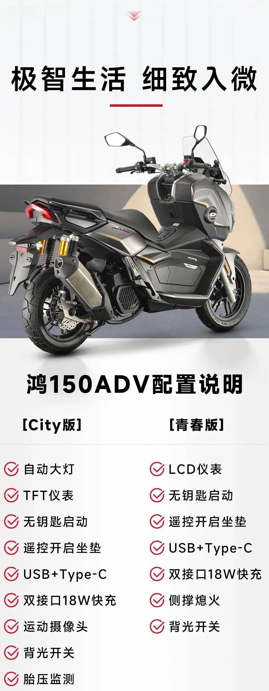 同時(shí)推出了鴻150ADV青春版,同樣12999元,24款CITY版同樣為13999元,配置差異與鴻150相同。