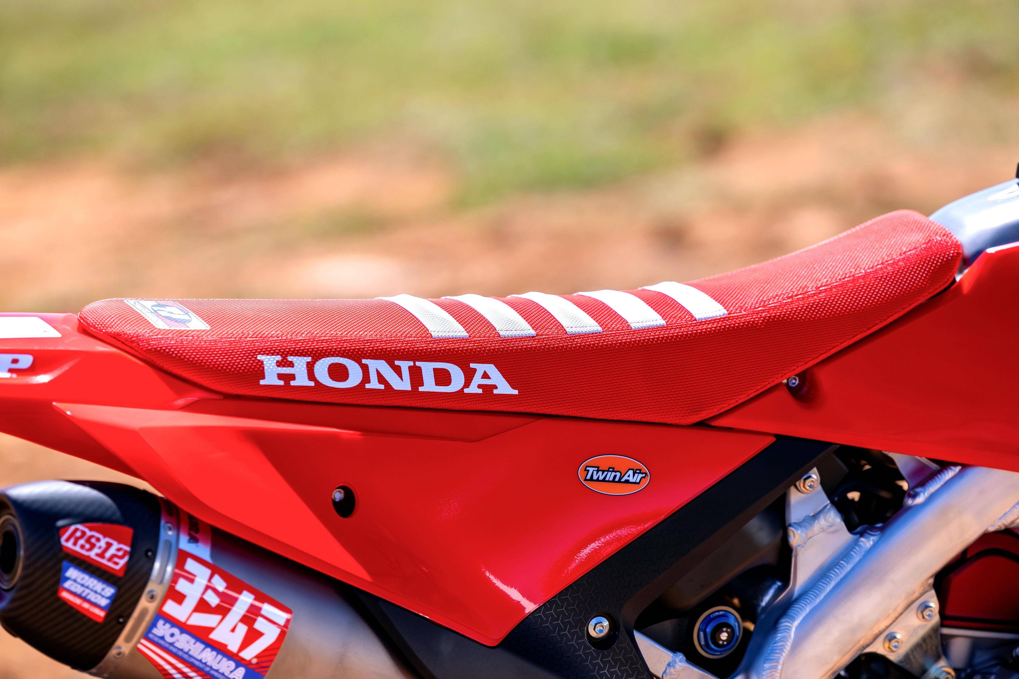 配置和設(shè)計(jì)上,WE 版汽缸蓋內(nèi)的進(jìn)氣/排氣口均由 Honda 熊本工廠的專業(yè)工匠以手工形式打磨、制作而成,從而讓空氣能以更加順暢的姿態(tài)進(jìn)入氣缸。此外,氣缸蓋上有激光雕刻的 “ CRF WORKS EDITION ” 字樣,以進(jìn)一步突出其高性能的角色;換裝了 Yoshimura 吉村的排氣、Tein Air 的空氣過濾器;點(diǎn)火正時(shí)和電子控制系統(tǒng)經(jīng)過對(duì)應(yīng)硬件變化的重新設(shè)置。