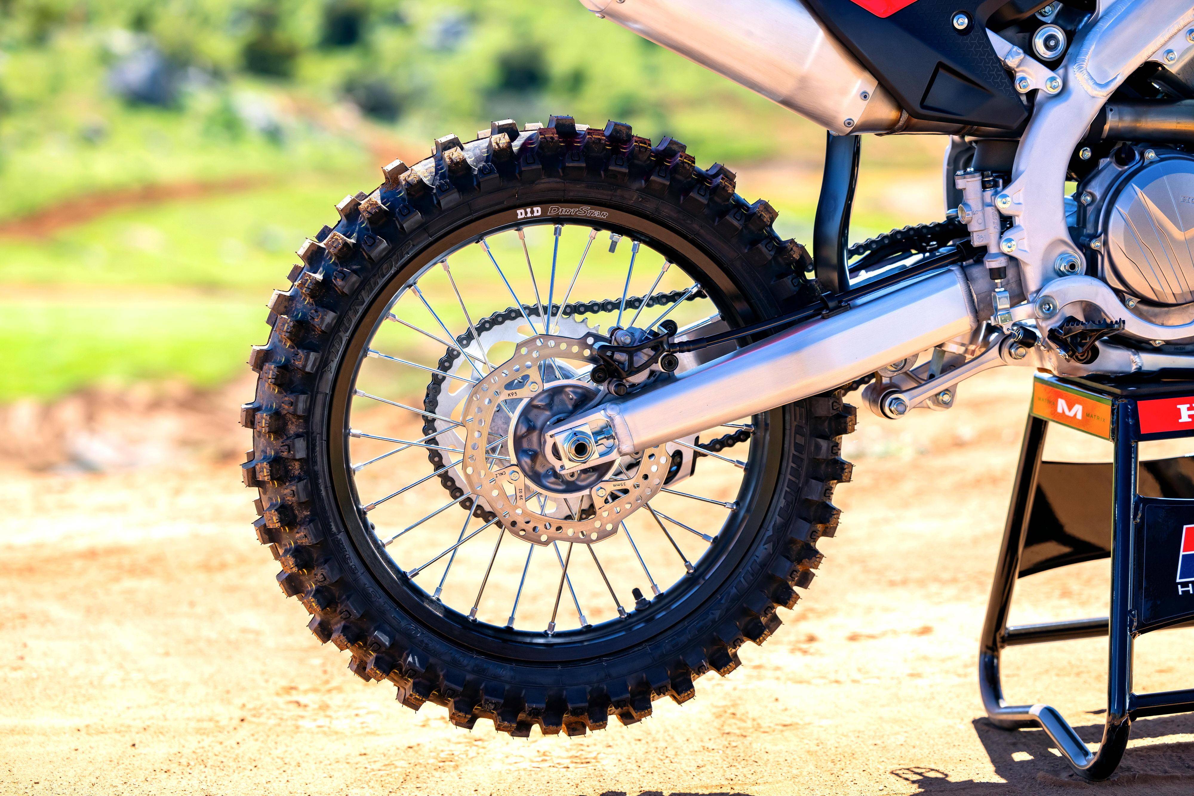 9、標(biāo)配了 D.I.D 的前后鋼線式車輪,Dunlop 鄧祿普的前 MX33F、后 MX33 輪胎。