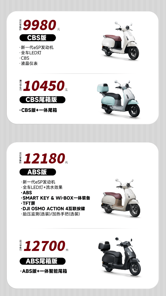 F125的配置版本也極其豐富,有四大色系8種車色,其次用戶可根據(jù)不同的車輛配置選擇心儀的版本,6個(gè)配置版本的售價(jià)從9980元到13400元,可滿足不同騎手的需求。