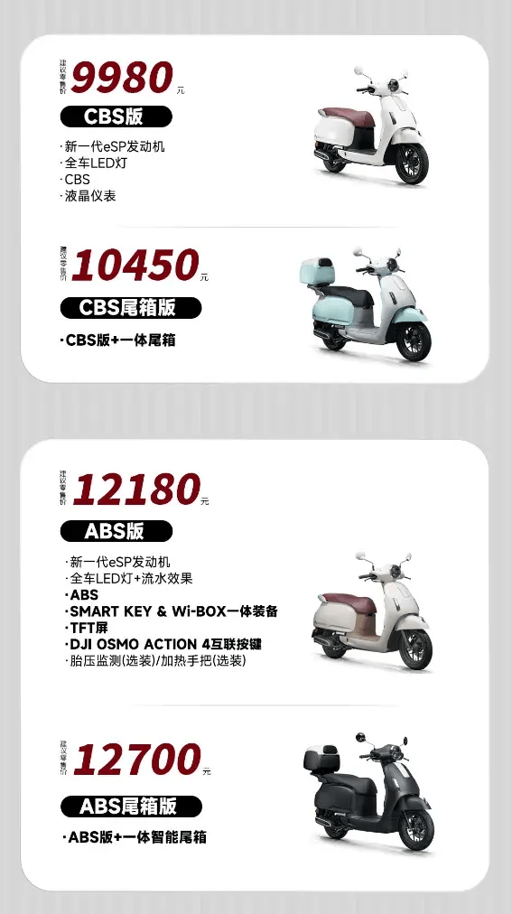 F125的配置版本也極其豐富,有四大色系8種車色,其次用戶可根據(jù)不同的車輛配置選擇心儀的版本,6個配置版本的售價(jià)從9980元到13400元,可滿足不同騎手的需求。