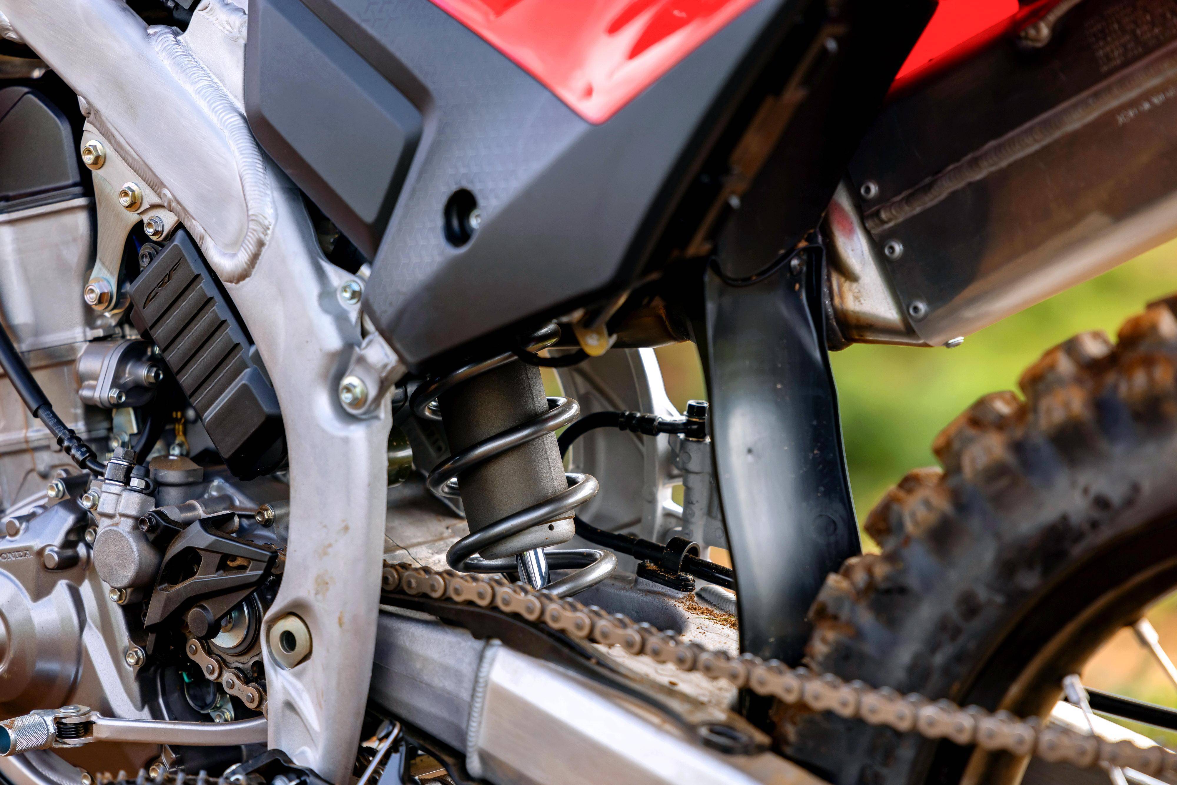 4、與 R 版相同的前后懸掛系統(tǒng),前面是叉芯口徑為 49 mm、行程為 310 mm 的 Showa 倒立式前叉,后面是行程為 308 mm 的后減震,以及結(jié)構(gòu)剛性提高了大約 11% 的 Pro link 多連桿結(jié)構(gòu)。與 R 版相比,RX 版懸掛系統(tǒng)的基礎(chǔ)設(shè)置經(jīng)過(guò)對(duì)應(yīng)性的修改;