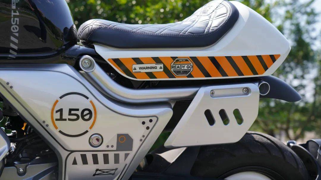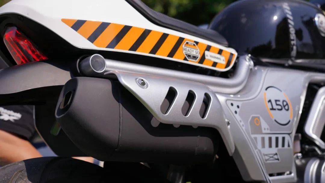 單座設(shè)計(jì),原廠也沒有提供后排乘客腳踏,因此泡泡的后座,也變成了仿賽上才會看到的駝峰,駝峰與坐墊下方的裝飾板為一體式的設(shè)計(jì),右側(cè)的排氣管防燙罩和左側(cè)類似號碼牌的裝飾相對稱,整體設(shè)計(jì)渾然一體。