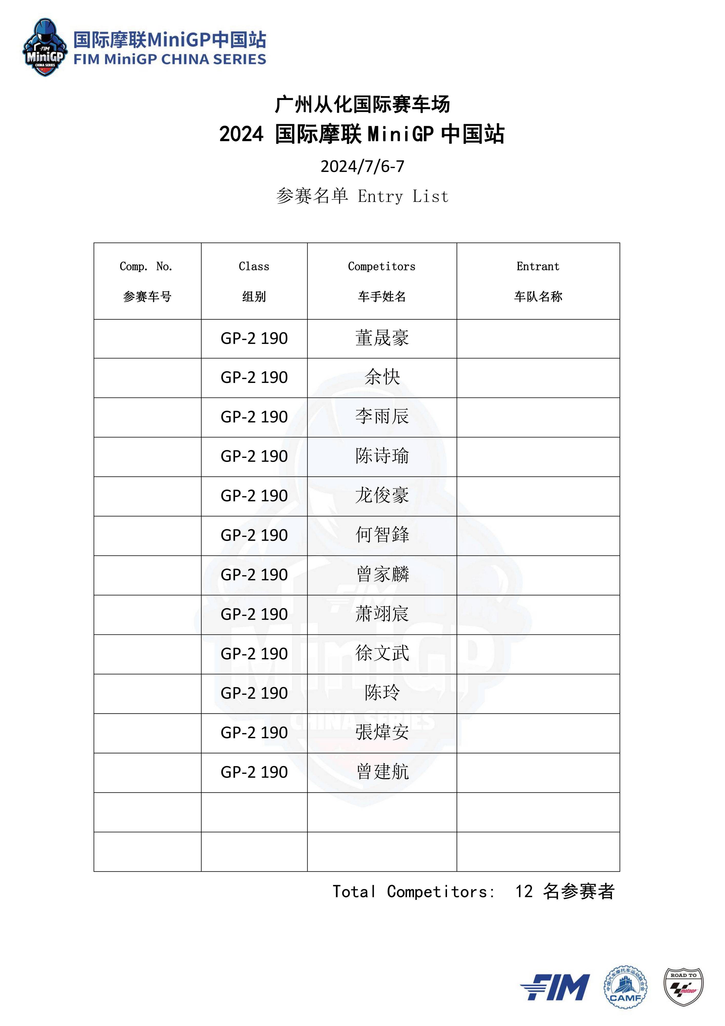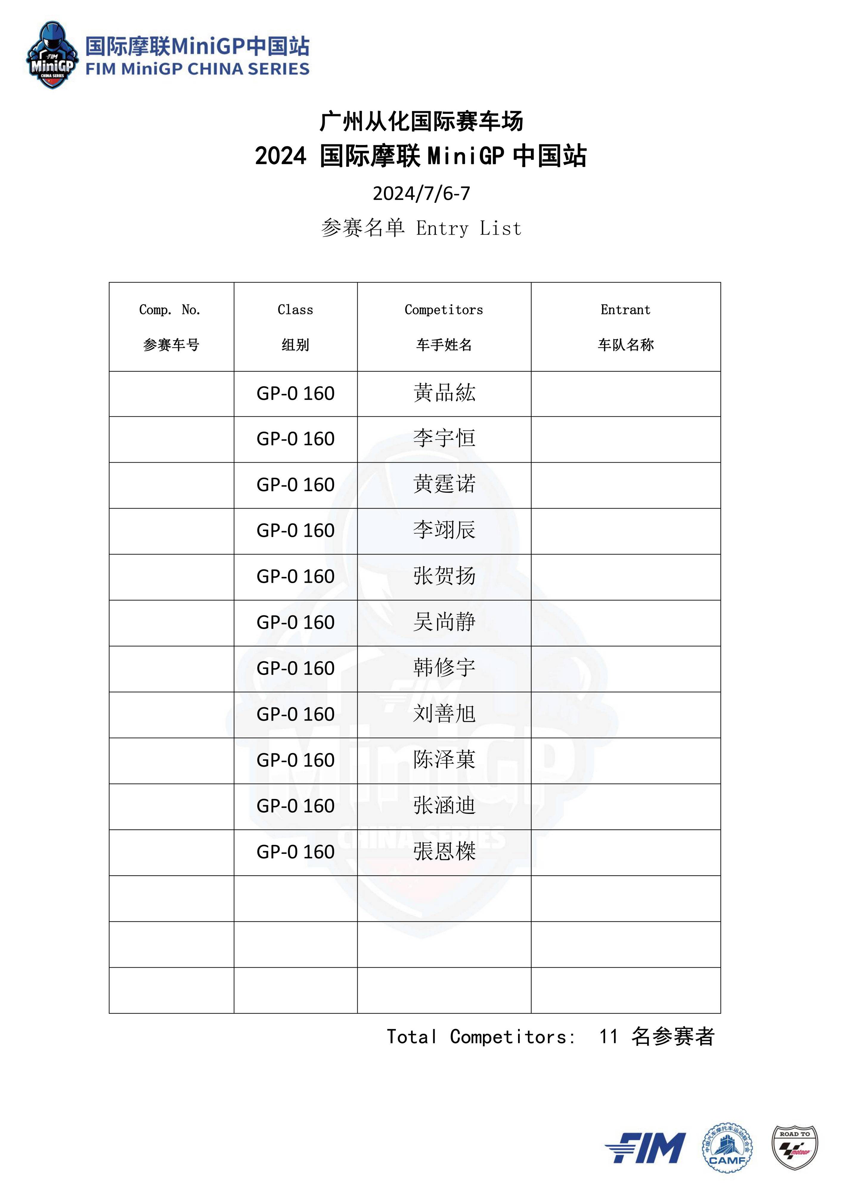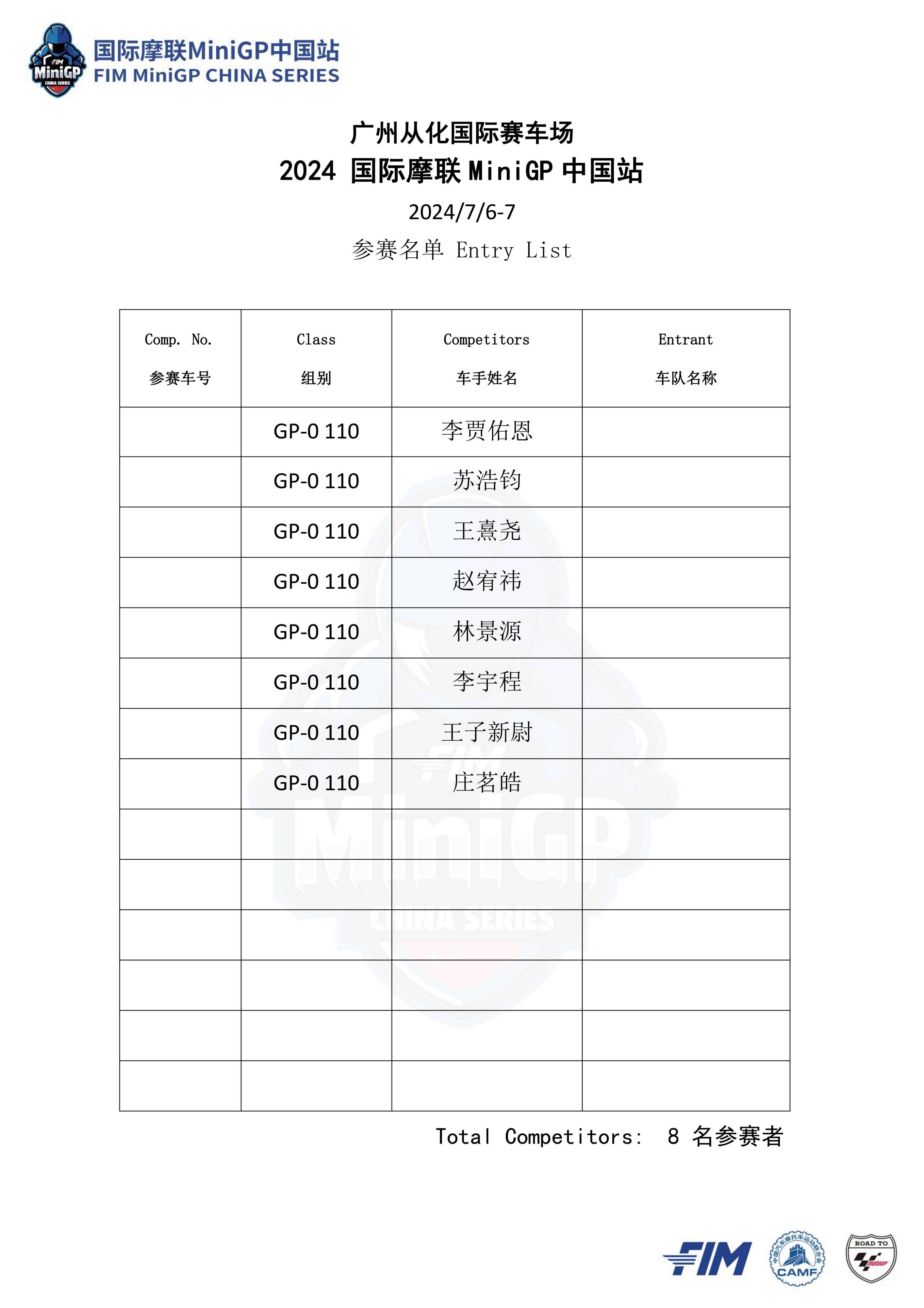 本站賽事將設(shè)立 Ohvale GP-0 110 Auto 組(自動檔)、FIM MiniGP GP-0 160 Evo 組、Ohvale GP-2 190 組,以及同場舉行的 GCIC 從化國際賽車場會賽、統(tǒng)一采用 Aprilia GPR250R 作為賽車的會賽,以及采用迷你越野車 KMB60、面向小童參賽者的幼苗組。