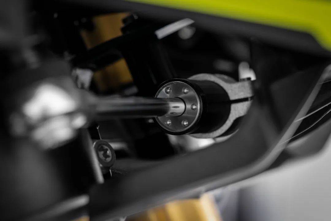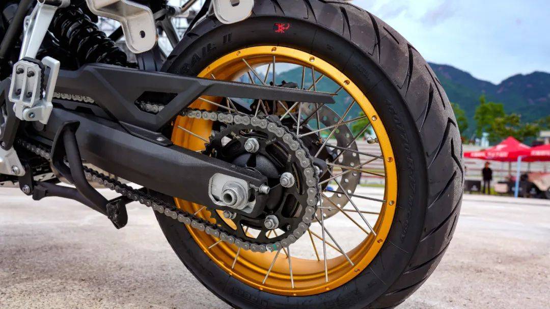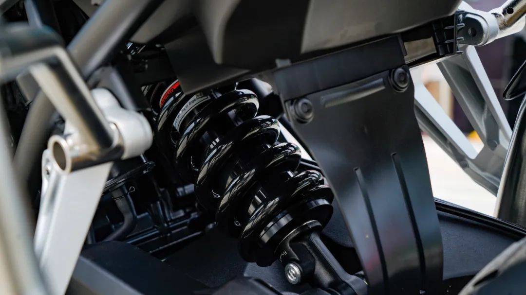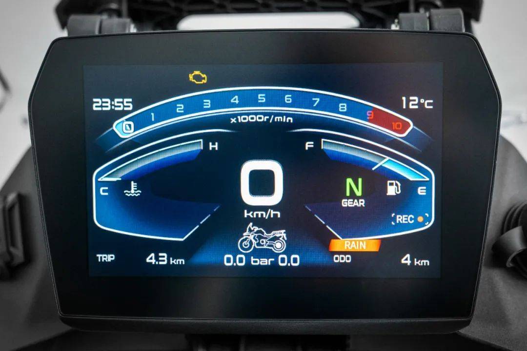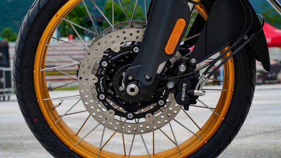 全LED光源, 標(biāo)配一對輔助射燈、鋁合金發(fā)動機(jī)底部護(hù)板、保險杠、后貨架、手把護(hù)弓、轉(zhuǎn)向阻尼器、鋁合金后平叉。全可調(diào)的KYB前倒置減震,以及全可調(diào)的內(nèi)置氣囊KYB中央后減震,后減震自帶預(yù)載調(diào)節(jié)旋鈕,可以直接手動調(diào)節(jié)。前雙浮動碟,每碟單向雙活塞Brembo卡鉗,后單活塞Brembo卡鉗,配備Brembo上泵。鋁合金真空輻條輪轂,配倍耐力蝎子胎,前90/90-21后150/70-17。在舒適性方面,專為國人定制的人機(jī)三角和加高靠后手把,優(yōu)化騎行姿態(tài),配備了電熱手把、加熱座墊、無鑰匙啟動、行車記錄儀、手動可調(diào)風(fēng)擋,全部配齊。