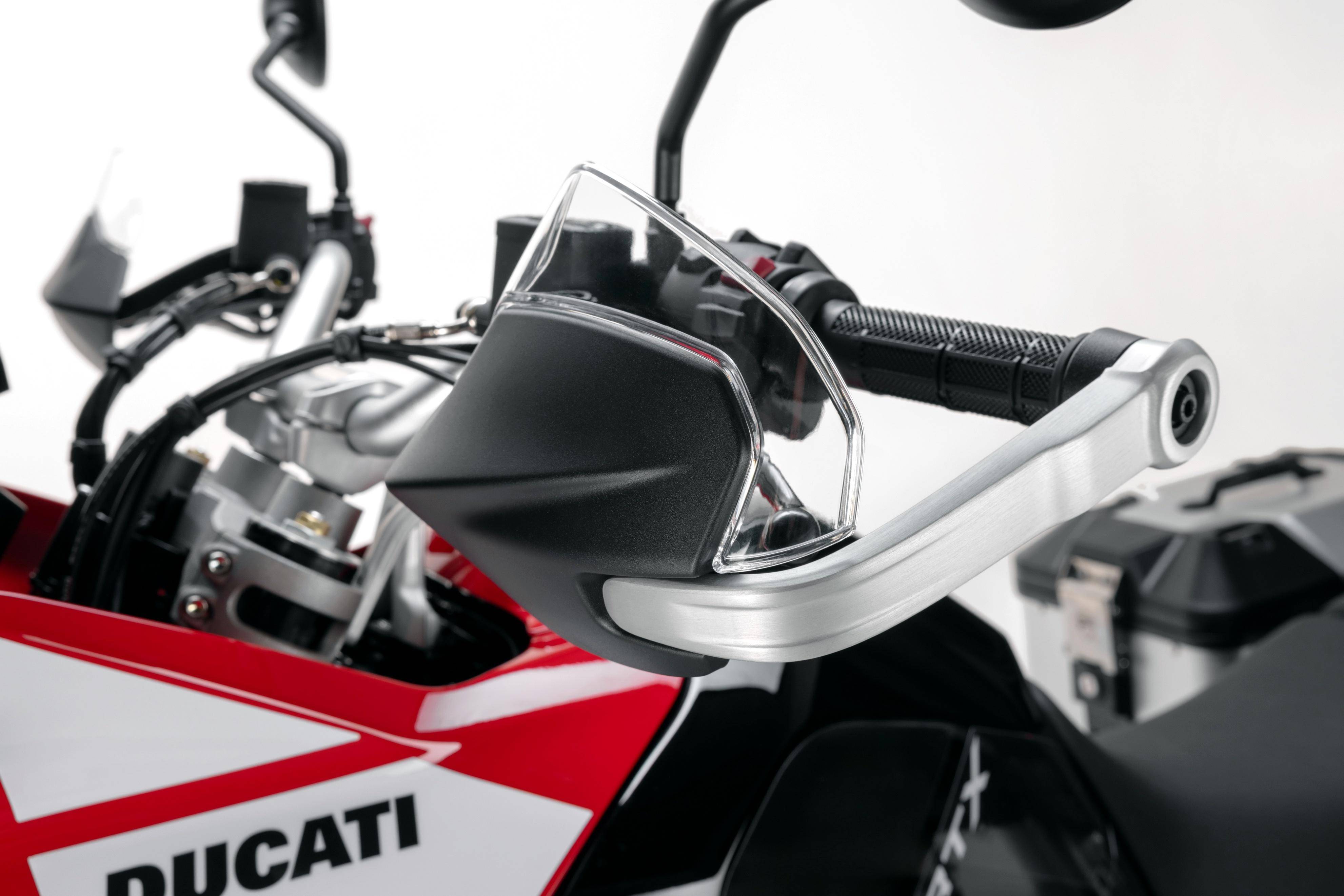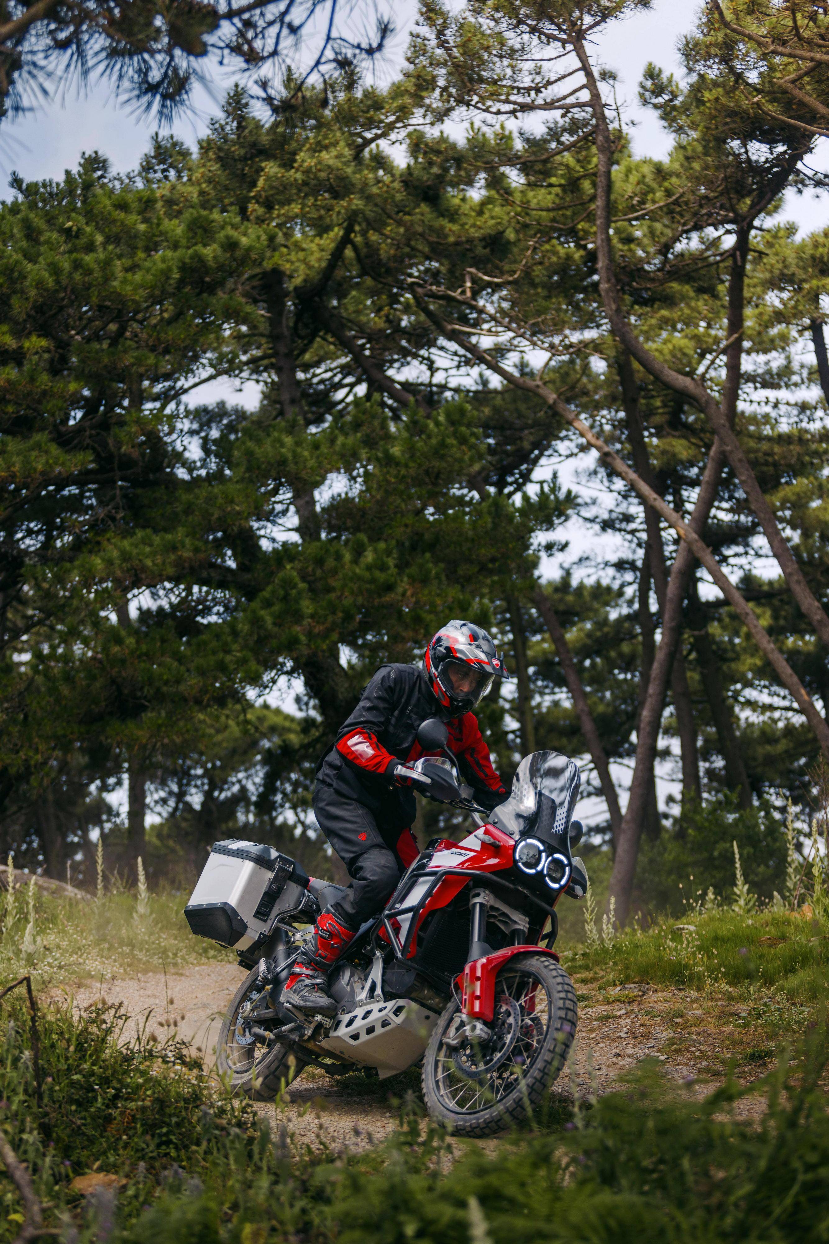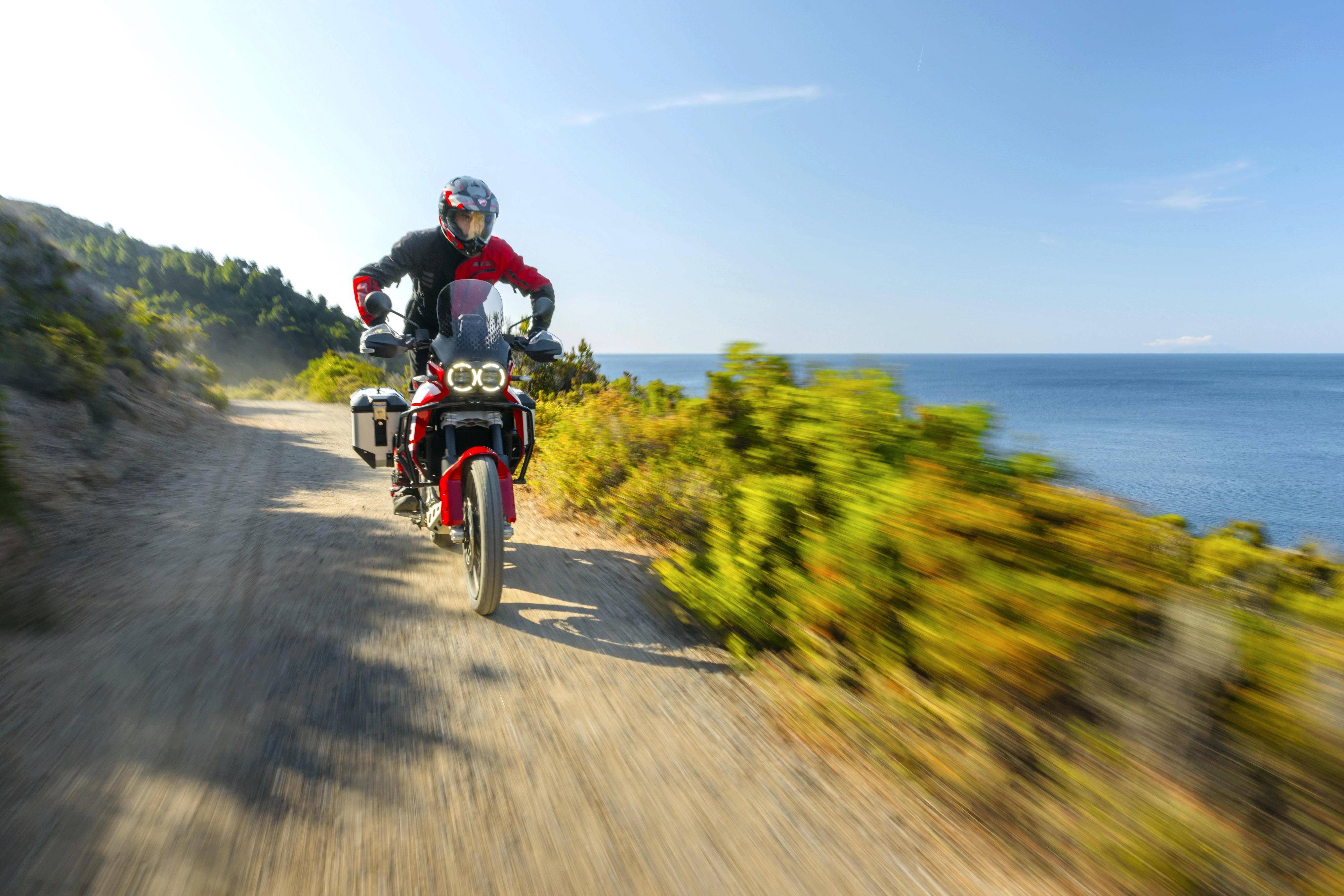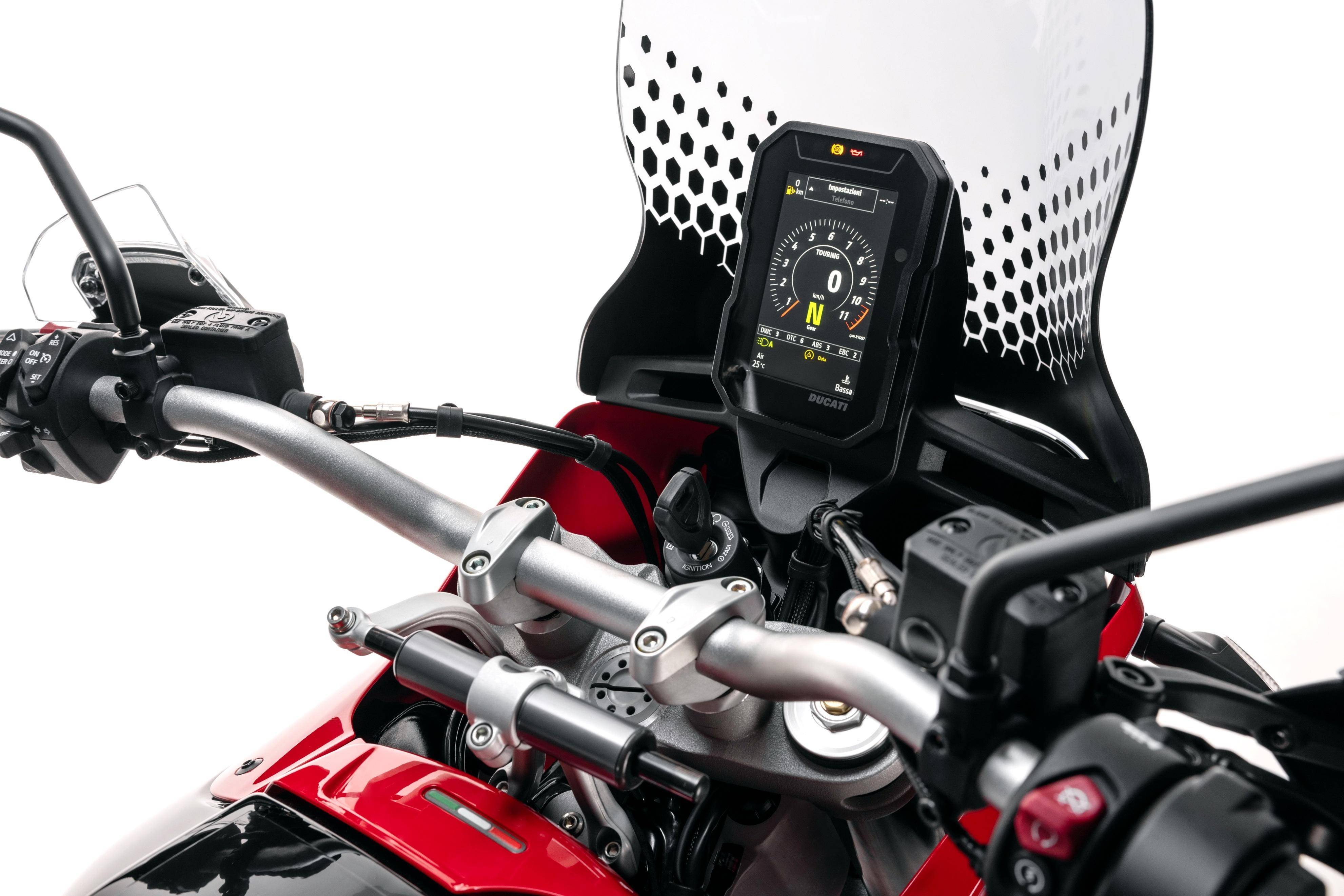 車體采用一副鋼管式的車架、鋁合金制的后搖臂;KYB 配套的懸掛系統(tǒng),前面是叉芯口徑 46 mm、行程為 230 mm 的倒立式前叉,后面是行程為 220 mm 的單減震;越野規(guī)格的前 21、后 18 英寸直徑的車輪;包括六種可選的騎行模式、四個(gè)動(dòng)力輸出模式可選,八個(gè)級(jí)別可調(diào)的 DTC 杜卡迪牽引力控制系統(tǒng),DWC 杜卡迪車輪控制系統(tǒng),DQS 快速換檔系統(tǒng),巡航控制,彎道 ABS 等多項(xiàng)的電子控制系統(tǒng)。