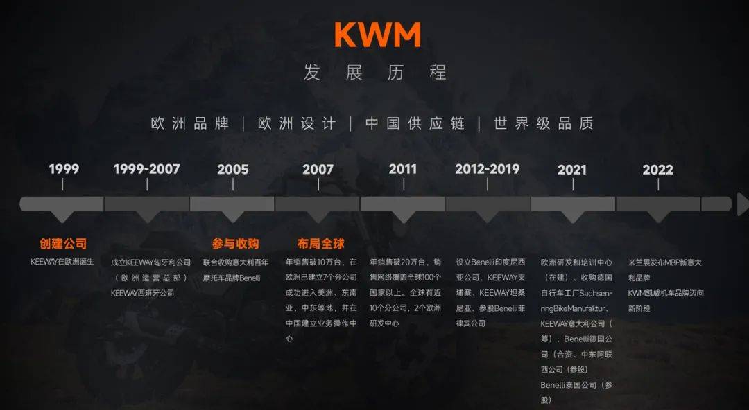 實(shí)力范,全球化運(yùn)營(yíng)凱威MBP的運(yùn)營(yíng)模式和所有國(guó)內(nèi)傳統(tǒng)企業(yè)都不同,是真正的全球化運(yùn)營(yíng),掌握了約40萬(wàn)輛的國(guó)際市場(chǎng)銷(xiāo)量份額、手握約一萬(wàn)家海外經(jīng)銷(xiāo)門(mén)店,擁有全球化的研發(fā)設(shè)計(jì)團(tuán)隊(duì)(目前上市的幾款車(chē)均為國(guó)際設(shè)計(jì)團(tuán)隊(duì)原創(chuàng)設(shè)計(jì))、國(guó)際零部件資源,獨(dú)立完善的產(chǎn)品試驗(yàn)評(píng)價(jià)體系,能充分利用國(guó)內(nèi)優(yōu)質(zhì)過(guò)剩摩托車(chē)產(chǎn)能和價(jià)格優(yōu)勢(shì),驅(qū)動(dòng)全球市場(chǎng),同時(shí)做大國(guó)內(nèi)市場(chǎng)銷(xiāo)售。客觀的說(shuō),MBP的起點(diǎn)、格局、實(shí)力,比這幾年出現(xiàn)的國(guó)內(nèi)新銳摩托車(chē)品牌,都要強(qiáng)幾個(gè)檔次。S150 、Mate、U150在國(guó)內(nèi)的熱賣(mài)僅僅只是開(kāi)始,知名度剛剛開(kāi)啟,MBP的產(chǎn)品線(xiàn)不止于此,踏板、巡航、仿賽、街車(chē)、拉力、復(fù)古車(chē)、MINI、邊三輪、電摩等幾乎所有品類(lèi)(除了電動(dòng)汽車(chē))的全品類(lèi)陣列,累計(jì)有近40款車(chē)型,將在未來(lái)2-3年內(nèi)陸續(xù)上市。這也使我們更加期待凱威MBP后續(xù)的發(fā)展?jié)摿?,為激烈?jìng)爭(zhēng)的國(guó)內(nèi)市場(chǎng)帶來(lái)更多的優(yōu)秀產(chǎn)品。2024年4月18日,MBP正式收購(gòu)了意大利傳奇品牌摩比德利(Morbidelli),同時(shí)在博洛尼亞將會(huì)建設(shè)“摩比德利設(shè)計(jì)中心”和一個(gè)新的研發(fā)中心,以最大化運(yùn)營(yíng)好摩比德利的品牌資產(chǎn),持續(xù)研究摩托車(chē)新技術(shù)、新材料、新工藝,并不斷提升設(shè)計(jì)和性能。這意味著MBP的發(fā)展將進(jìn)入新的階段,MBP摩托的前沿設(shè)計(jì)和創(chuàng)新技術(shù)將與摩比德利非凡的賽事精神與品牌資產(chǎn)相結(jié)合,兩個(gè)品牌的強(qiáng)強(qiáng)聯(lián)合,將讓摩比德利品牌煥發(fā)全新的生命力。目前摩托車(chē)行業(yè)進(jìn)入真正的洗牌階段,今后一批實(shí)力不足、產(chǎn)品競(jìng)爭(zhēng)力一般、缺乏海外銷(xiāo)售的中小品牌必然會(huì)被洗掉。與此同時(shí),一些有強(qiáng)大產(chǎn)品開(kāi)發(fā)能力、擁有豐厚海外市場(chǎng)支撐的品牌,將能活下來(lái)甚至得到壯大。對(duì)凱威MBP來(lái)說(shuō),大洗牌時(shí)代,反而更具發(fā)展機(jī)會(huì)。