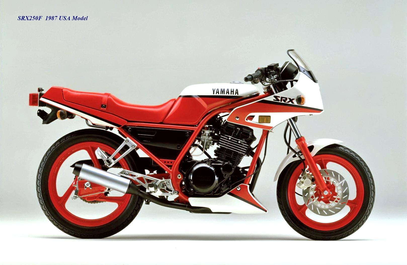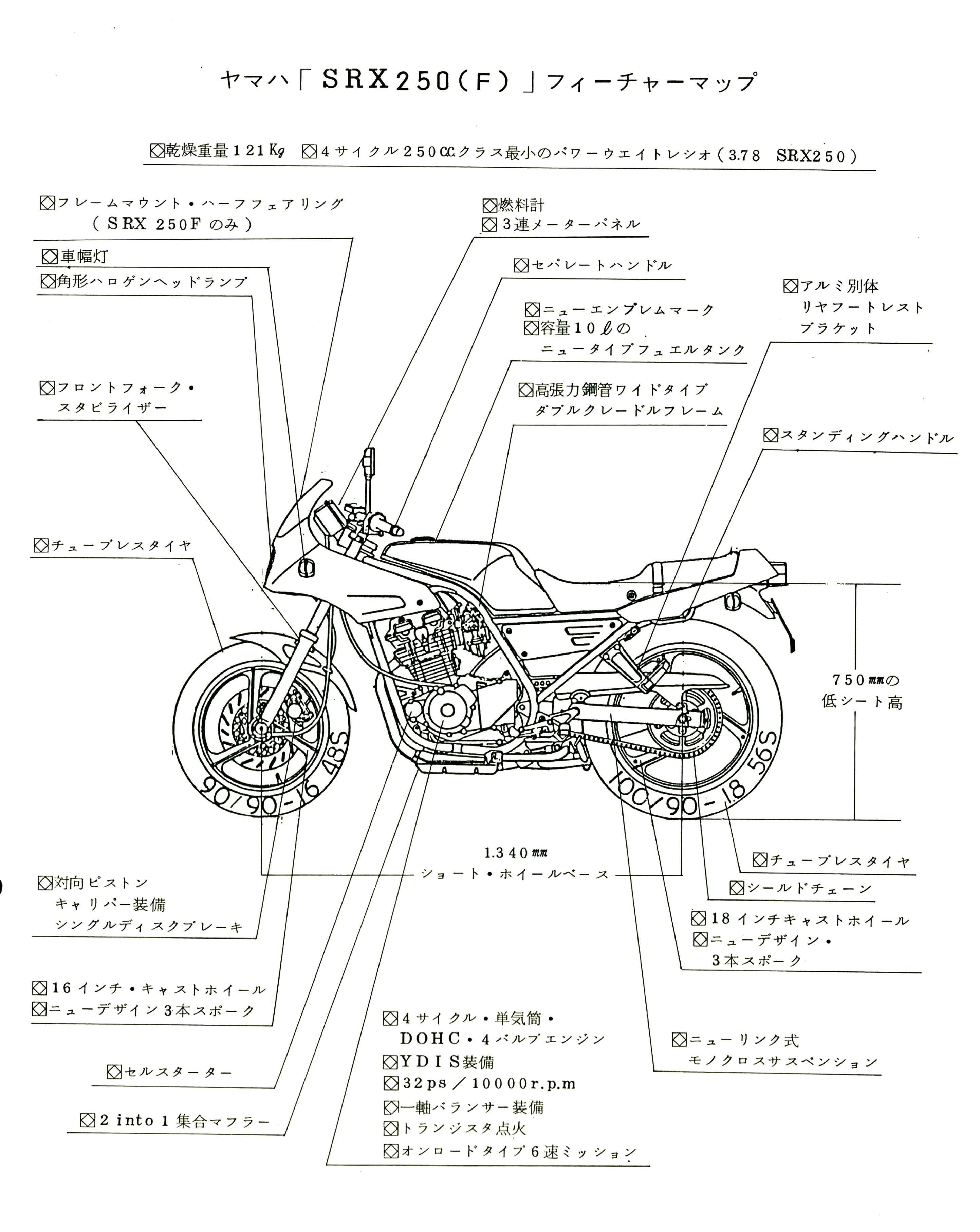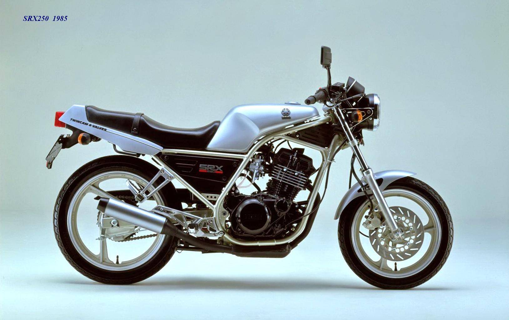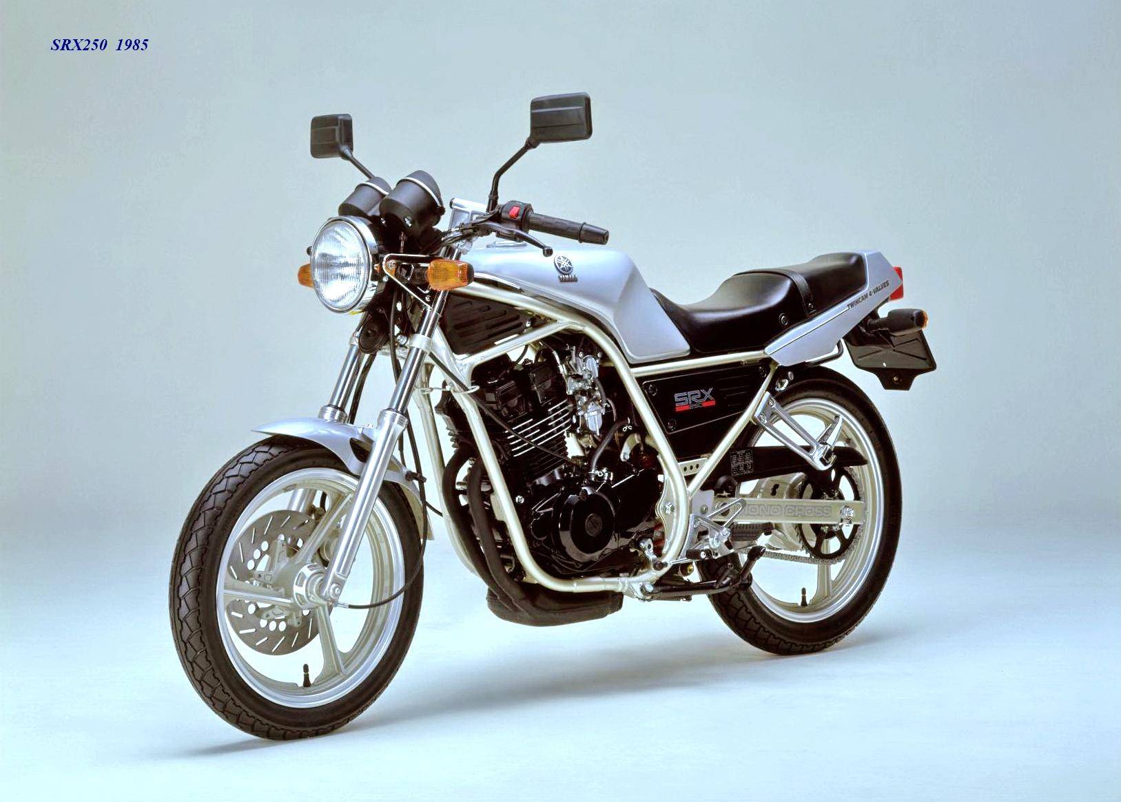 作為應(yīng)對市場競爭的手段,Yamaha 在 1984 年首次推出了 SRX250(本土版的工廠編號為 5 IY/Y24PV)。該車搭載一副從越野車 XT250 的動力單元升級而來的風(fēng)冷四沖程單氣缸、DOHC 四氣閥的發(fā)動機(jī)(當(dāng)時的 XT250 采用 SOHC 兩氣閥的發(fā)動機(jī)),缸徑、行程為 73 mm x 59.6 mm,排氣量 249 cc,配備了 Yamaha 獨(dú)創(chuàng)的 Y.D.I.S(Yamaha Digital Intake System,Yamaha 數(shù)字式進(jìn)氣系統(tǒng),也就是每個進(jìn)氣的氣閥、都配備了對應(yīng)的進(jìn)氣通道和化油器,單氣缸、雙化油器)技術(shù),讓車輛在低轉(zhuǎn)速之下、依然有著極佳的油門響應(yīng);標(biāo)配了電啟動,六檔的變速齒輪箱,最大馬力輸出 32 匹。