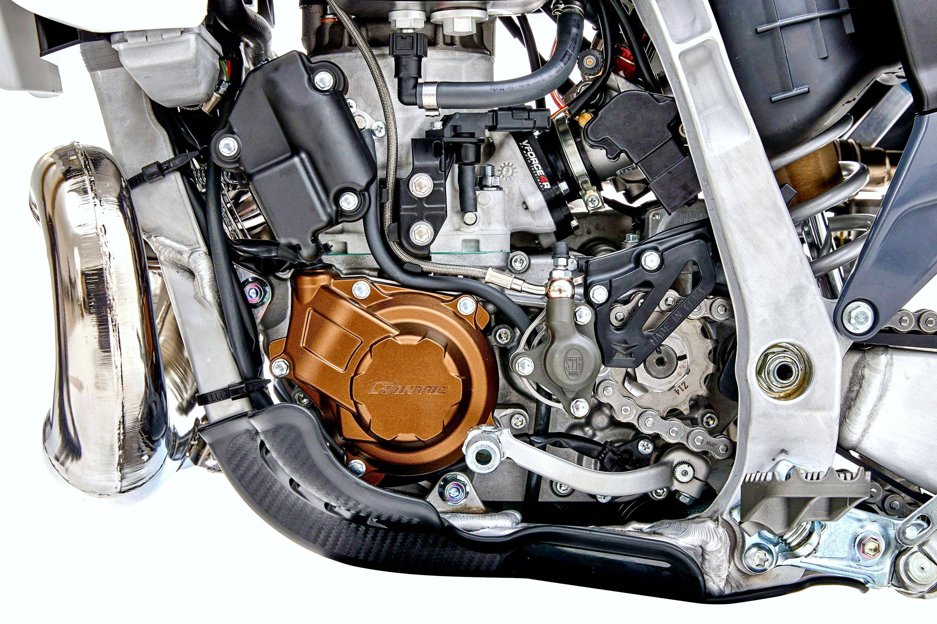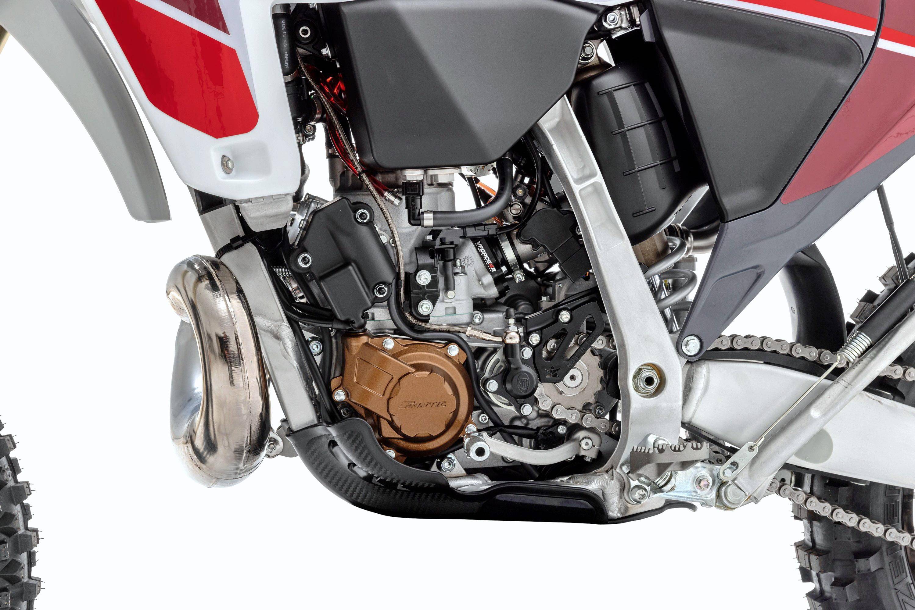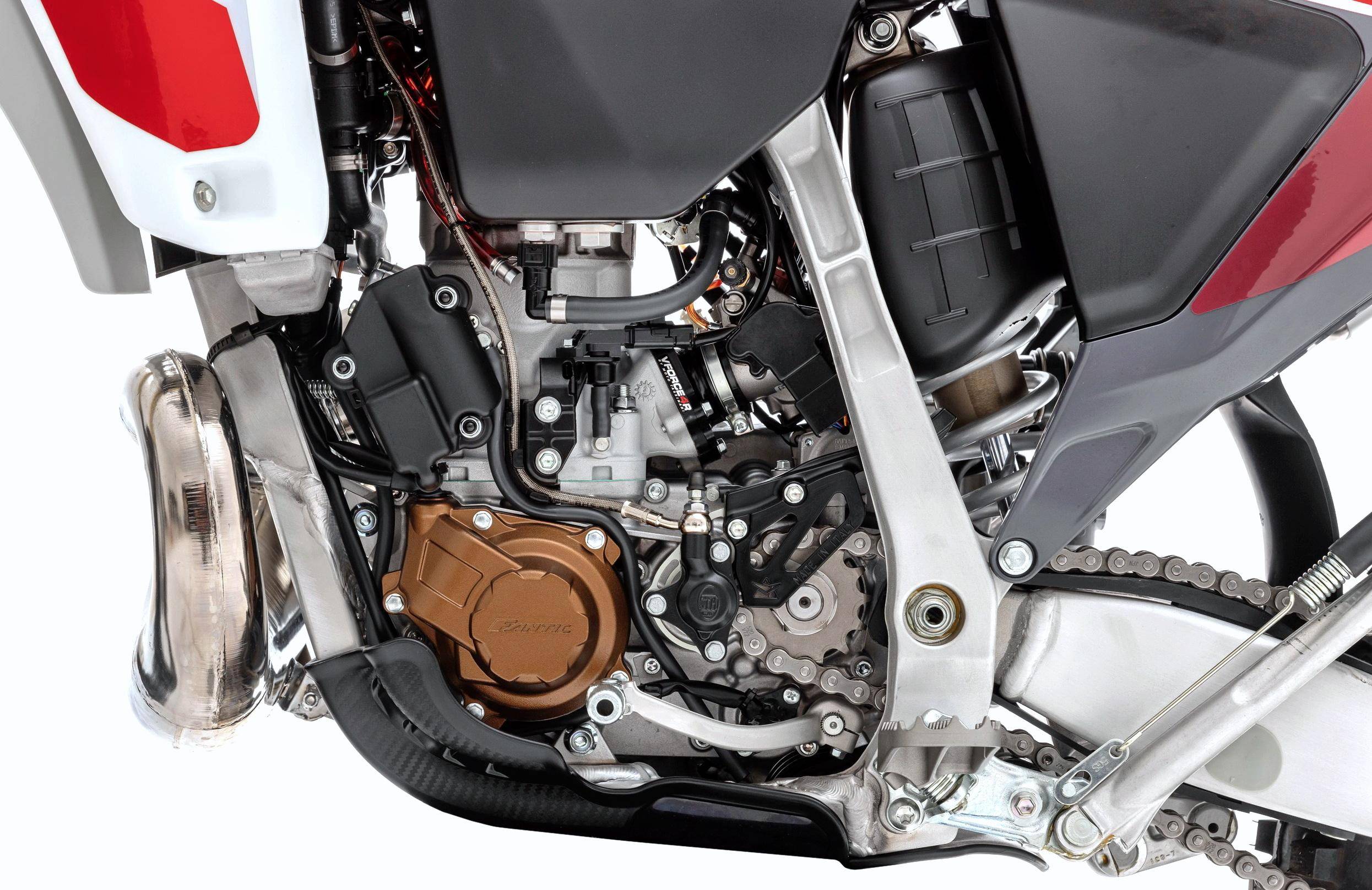 XE 300 的基礎(chǔ)平臺(tái)來自 Yamaha 的場(chǎng)地越野賽車 YZ250,搭載一副由 Motori Minarelli 生產(chǎn)的水冷兩沖程單氣缸的發(fā)動(dòng)機(jī),缸徑、行程為 72 mm x 72 mm(Yamaha YZ250X 的缸徑、行程為 66.4 mm x 72 mm),具有 11.5:1 的壓縮比(YZ250 最大壓縮比為 10.6:1),排氣量 292.9 cc(YZ250 為 249 cc),配備了雙噴射的電子燃油噴注系統(tǒng)(YZ250 采用化油器)、電子控制的排氣閥,電啟動(dòng)和液壓的離合器、五檔的變速齒輪箱,與 Arrow 合作開發(fā)而成的排氣系統(tǒng),這套動(dòng)力裝置符合歐五排放標(biāo)準(zhǔn)。